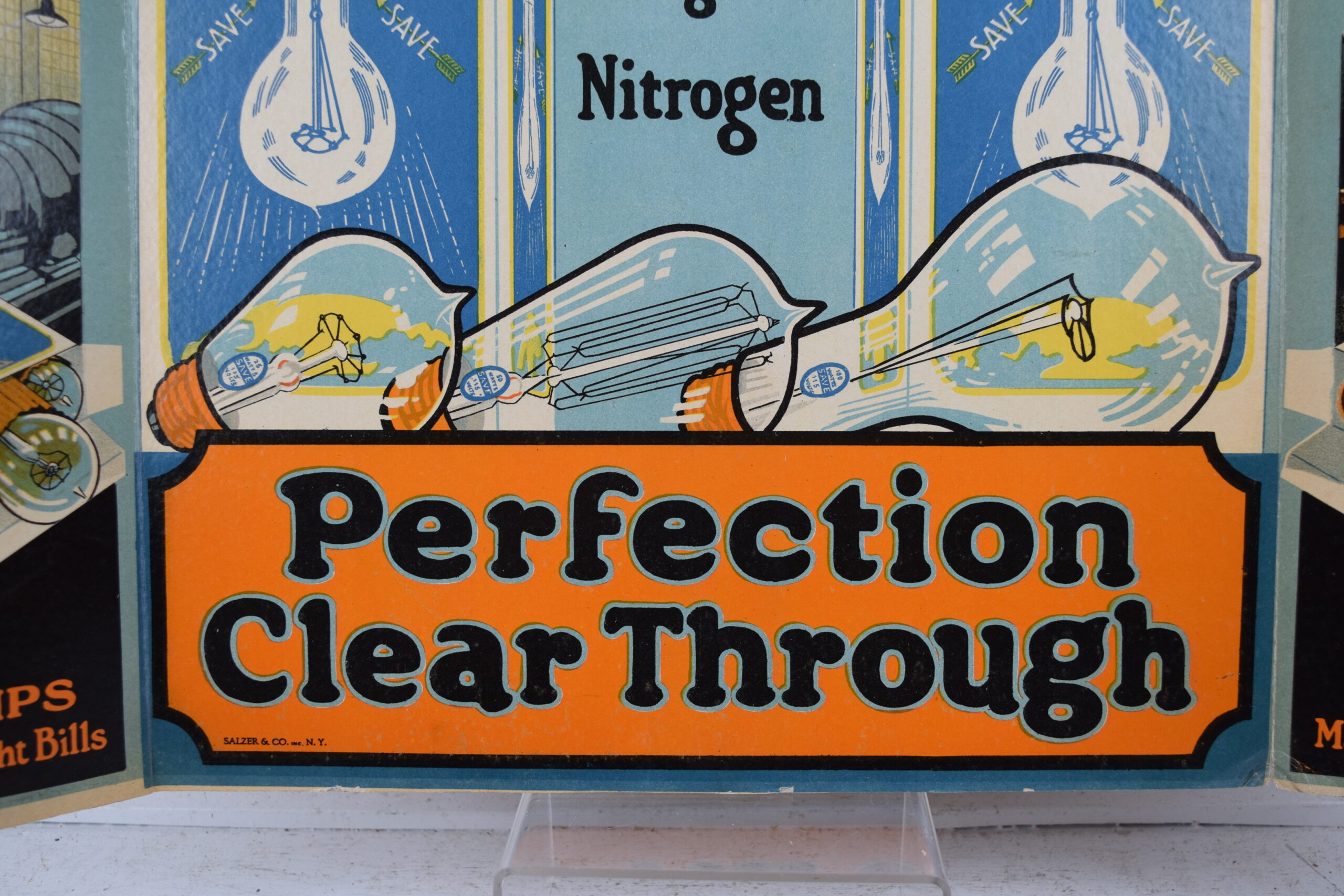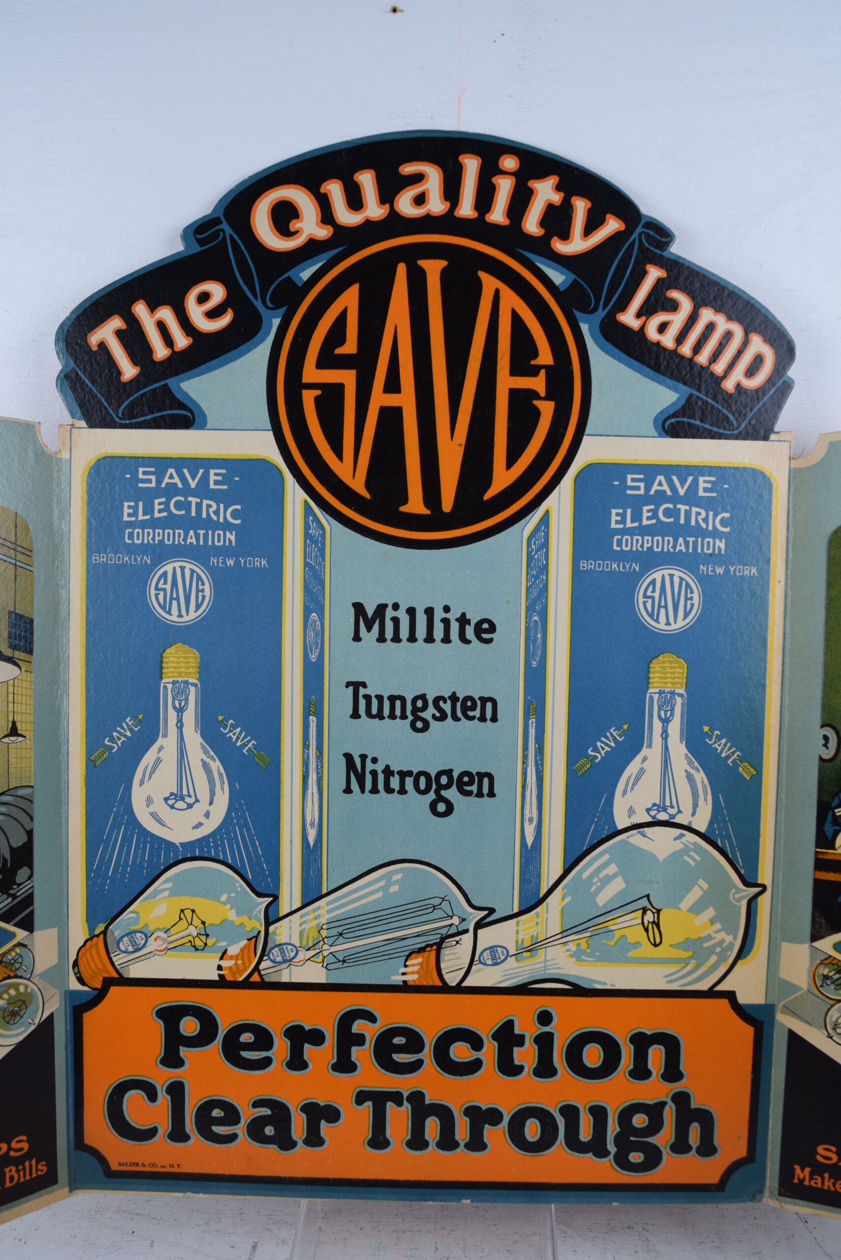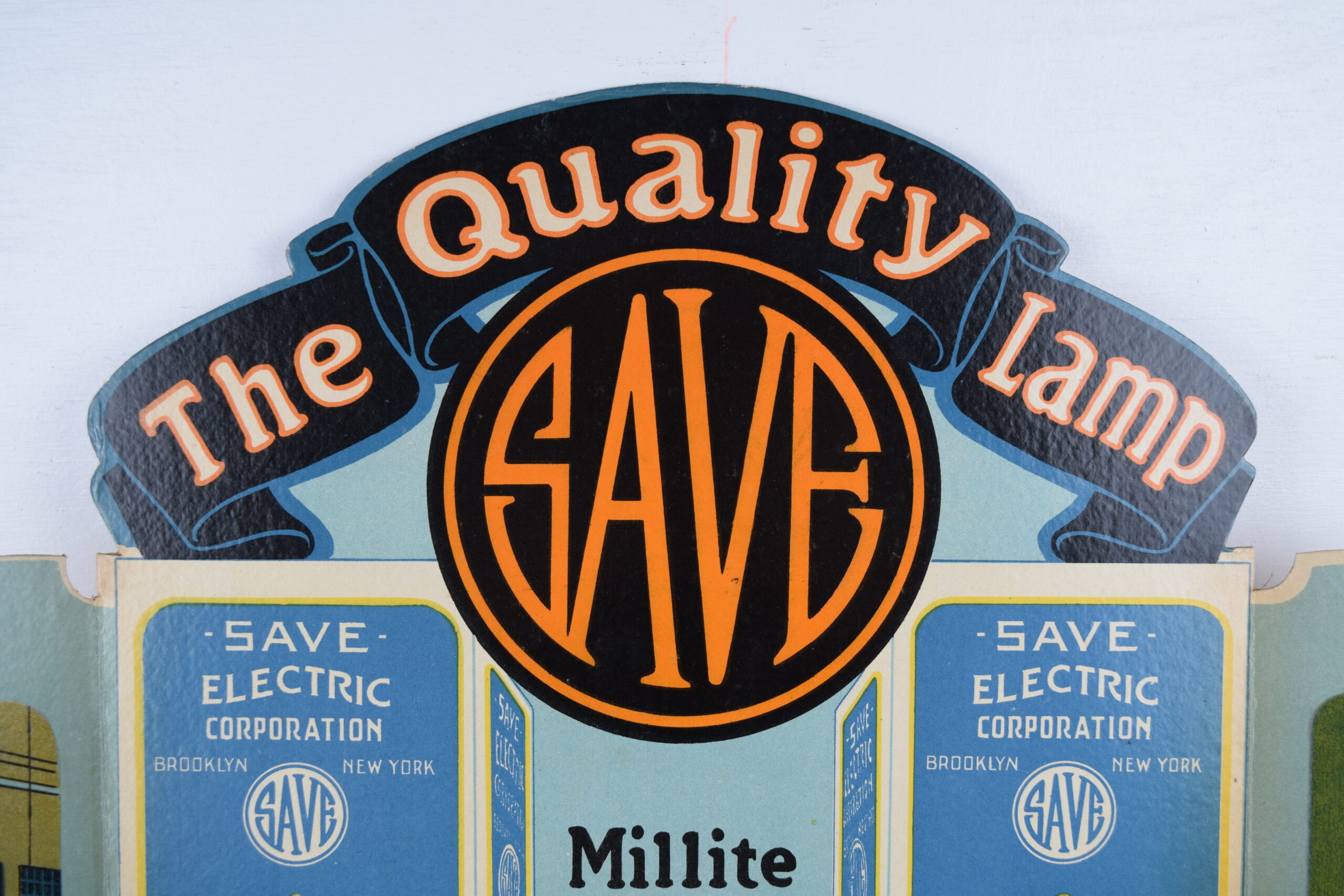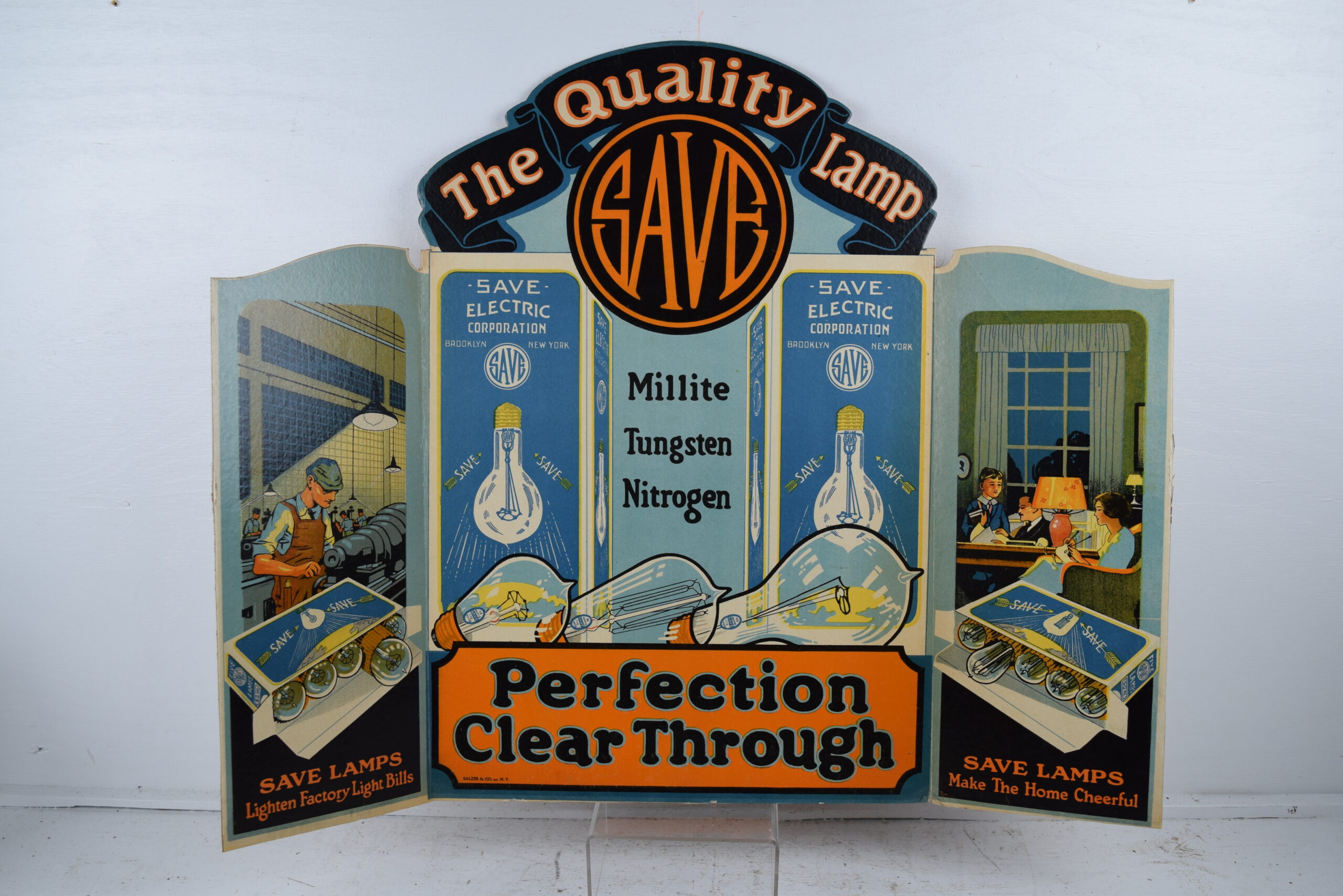 This beautiful point of sale display would grab your attention any day of the week! The colors are amazing on this new old stock display which advertises Save lamps, which worked for both industrial and home lighting. This die cut cardboard display is a tri-fold and features amazing graphics for it’s time period. It is in new old stock condition and appears to have never been used. Some minor edge wear can be seen with a small bend in the lower right fold. Very rare piece that makes a beautiful display. 19989-QPPP