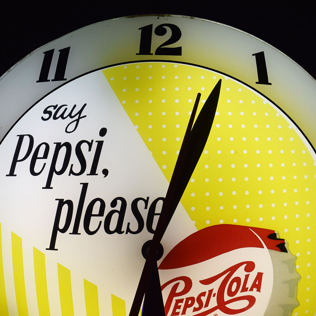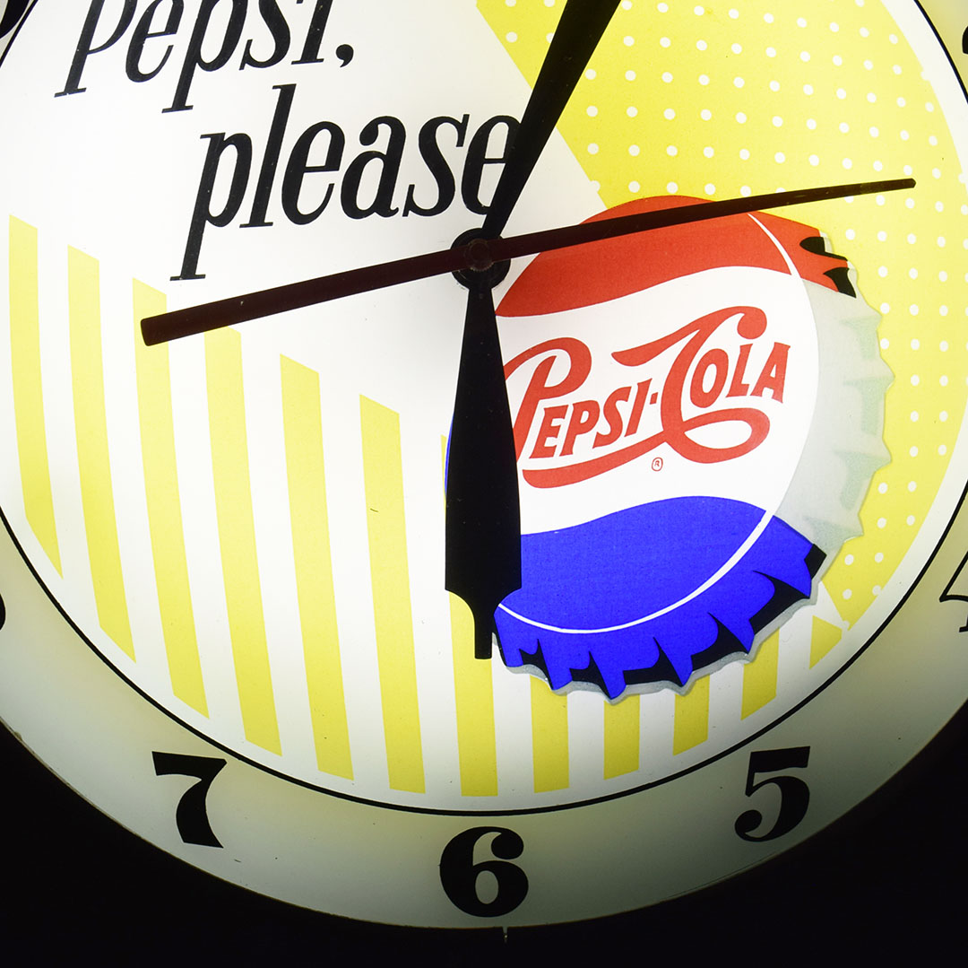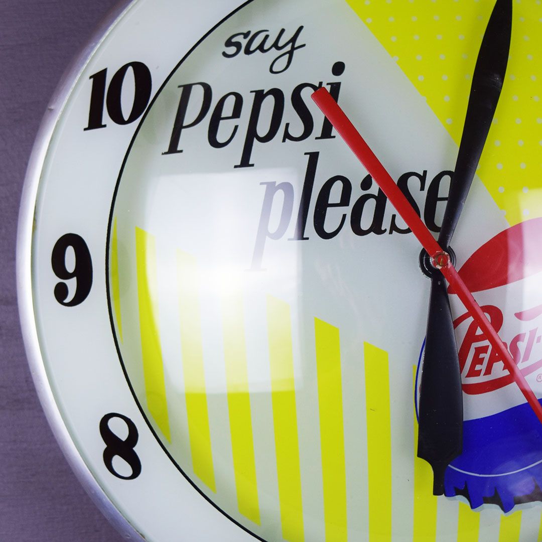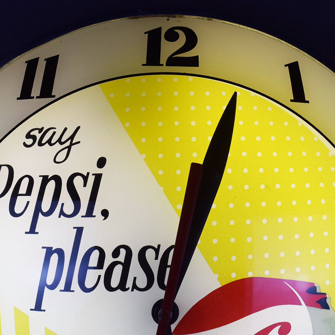 Part of nostalgia is remembering how simple life was and the little things that made you happy. Take this beautiful Pepsi-Cola double bubble clock, for instance. Just looking at it takes you back to your local diner, where you can hear the hustle and bustle during the lunch rush. Once plugged in, it lights up easily and works just as it should. The glass face features the slogan “say Pepsi please, ” popular during the 1960s, along with the colorful Pepsi-Cola bottle cap. Both the glass lenses are in excellent condition, as is the metal housing. The back has light wear and retains the original Advertising Products decal. This clock is perfect for your soda fountain display and will make you smile every time you see it. 21061-OWP