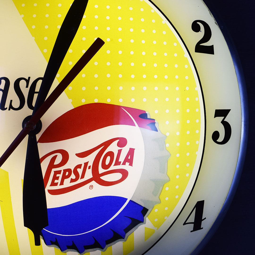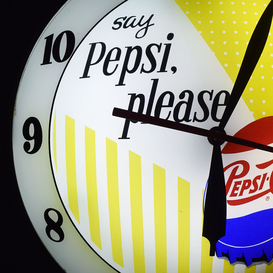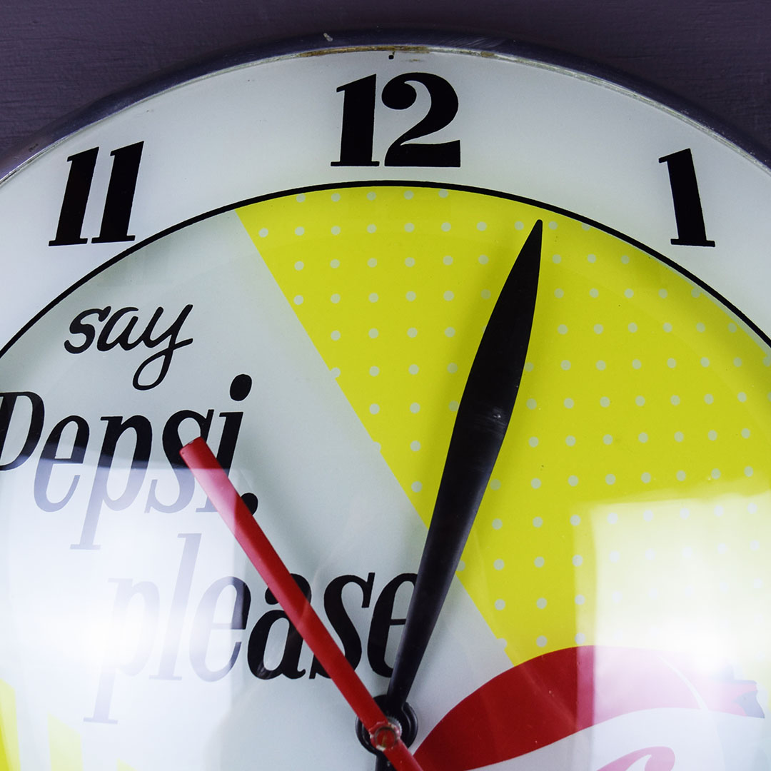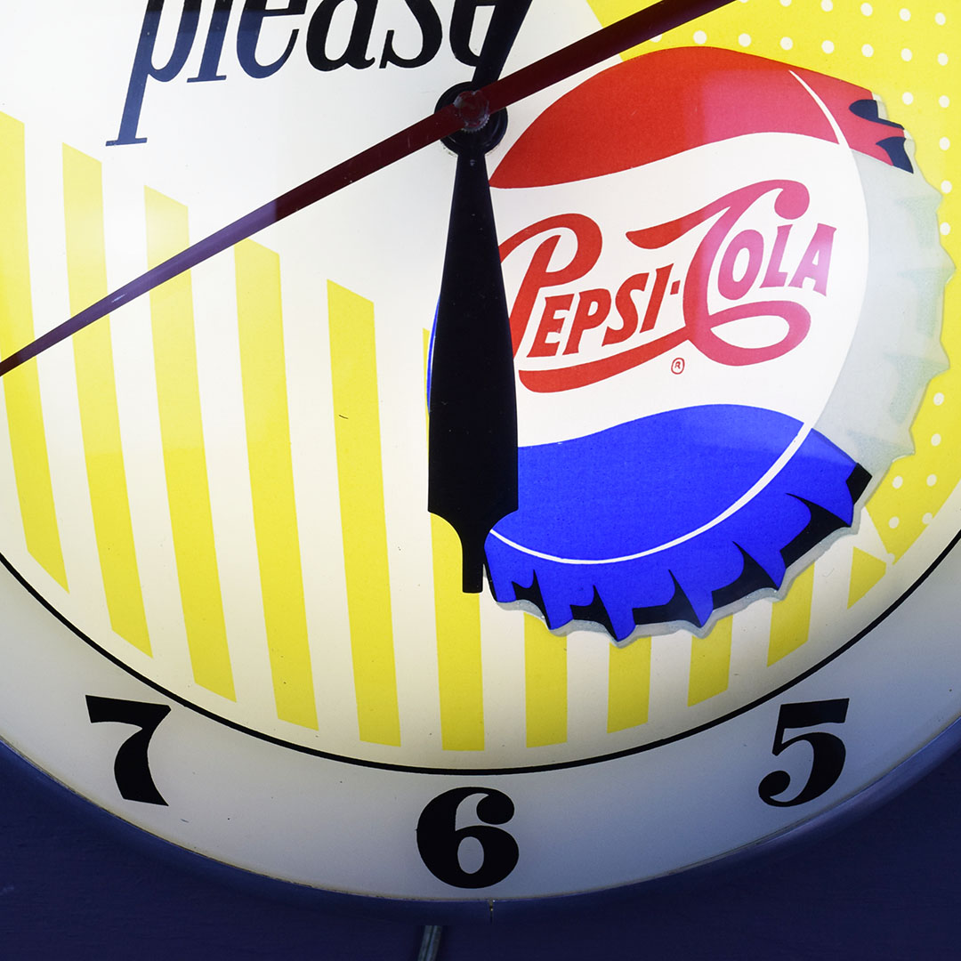 Part of nostalgia is remembering how simple life was and the little things that made you happy. Take this beautiful Pepsi-Cola double bubble clock, for instance. Just looking at it takes you back to your local diner, where you can hear the hustle and bustle during the lunch rush. Once plugged in, it lights up easily and works just as it should. The glass face features the slogan “say Pepsi please, ” popular during the 1960s, along with the colorful Pepsi-Cola bottle cap. Both the glass lenses are in excellent condition, as is the metal housing. The back has light wear and retains the original Advertising Products decal. This clock is perfect for your soda fountain display and will make you smile every time you see it. 21061-OWP