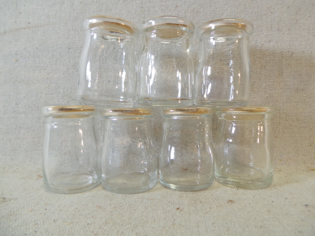 Once a common sight in diners and restaurants, these little single serving glass cream bottles date from the 1950s. This group of 7 have no markings indicating what dairy they came from, but each one does have and original cardboard cap. They measure 1 7/8 inches tall by 1 1/4 inches in diameter and are in near mint condition. 1431-81WT