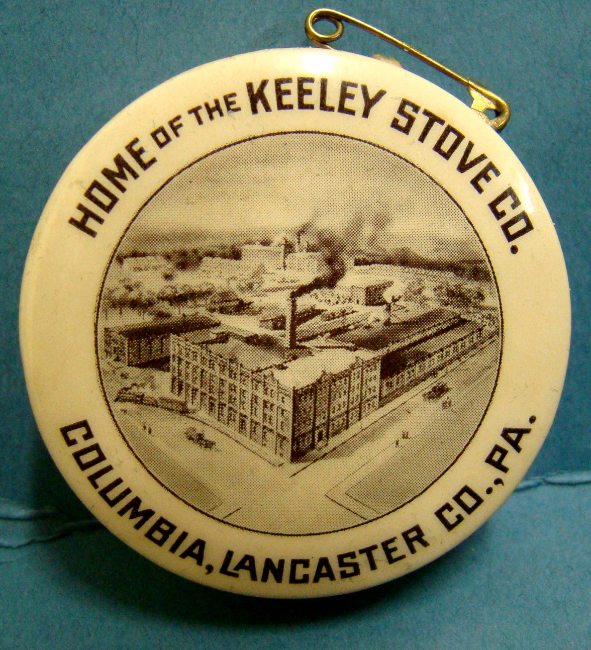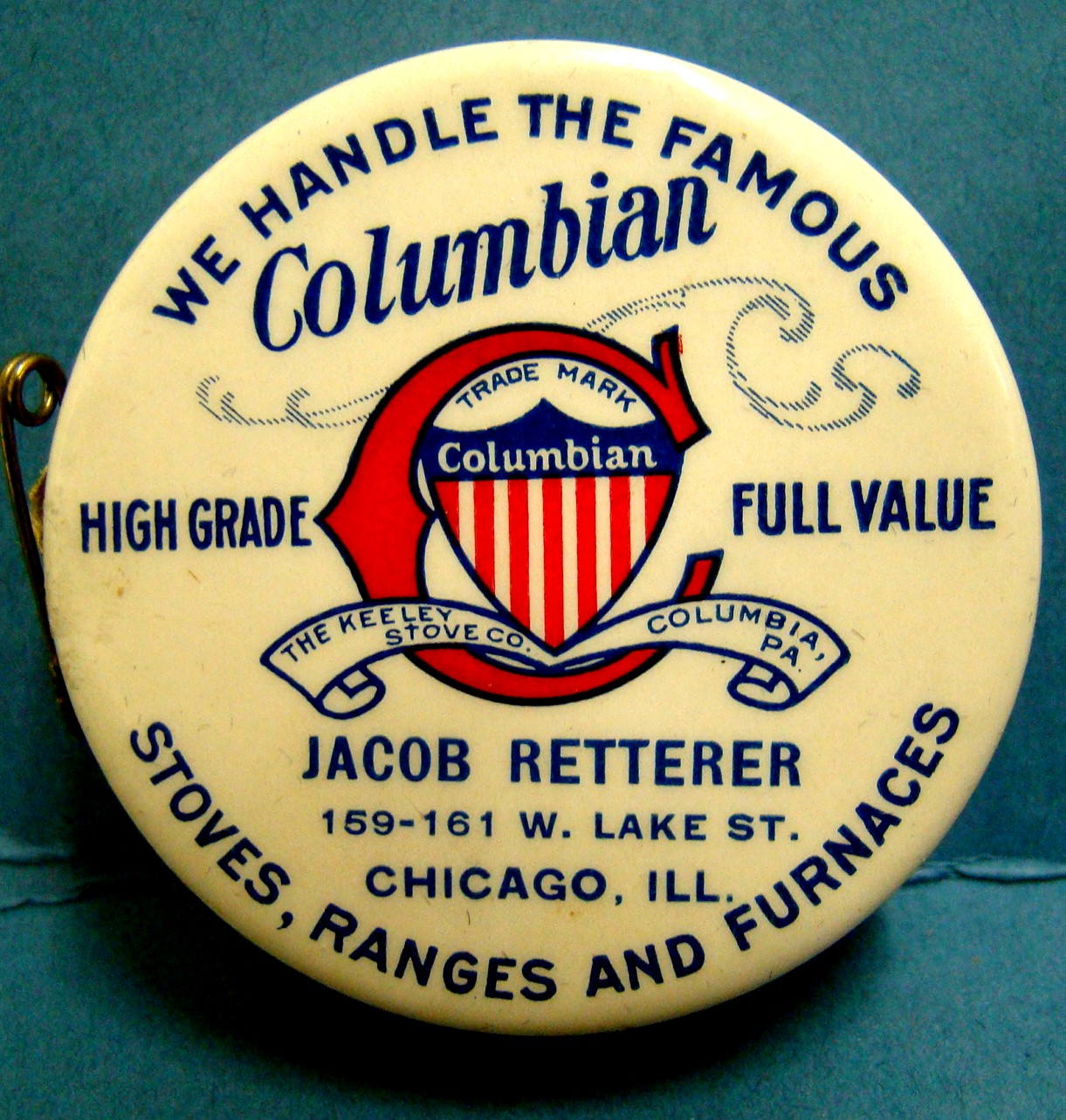 Great early celluloid 1930’s tape measure with both sides of this great piece has super advertising. One side has a picture of the factory where the stoves were manufactured and says “Home of the Kelley Stove Co.” Columbia, Lancaster Co. PA and the other side as the red, white and blue Columbia shield inside the big red “C” – Stoves, Ranges and Furnaces. Their distributor was Jacob Retterer, 159-161 W. Lake St., Chicago, Ill. The tape measure still works however, some housewife put a safety pin to replace the pull tab. Marked on the edge “The Whitehead & Hoag Co., Newark N.Y. 6420-01TE