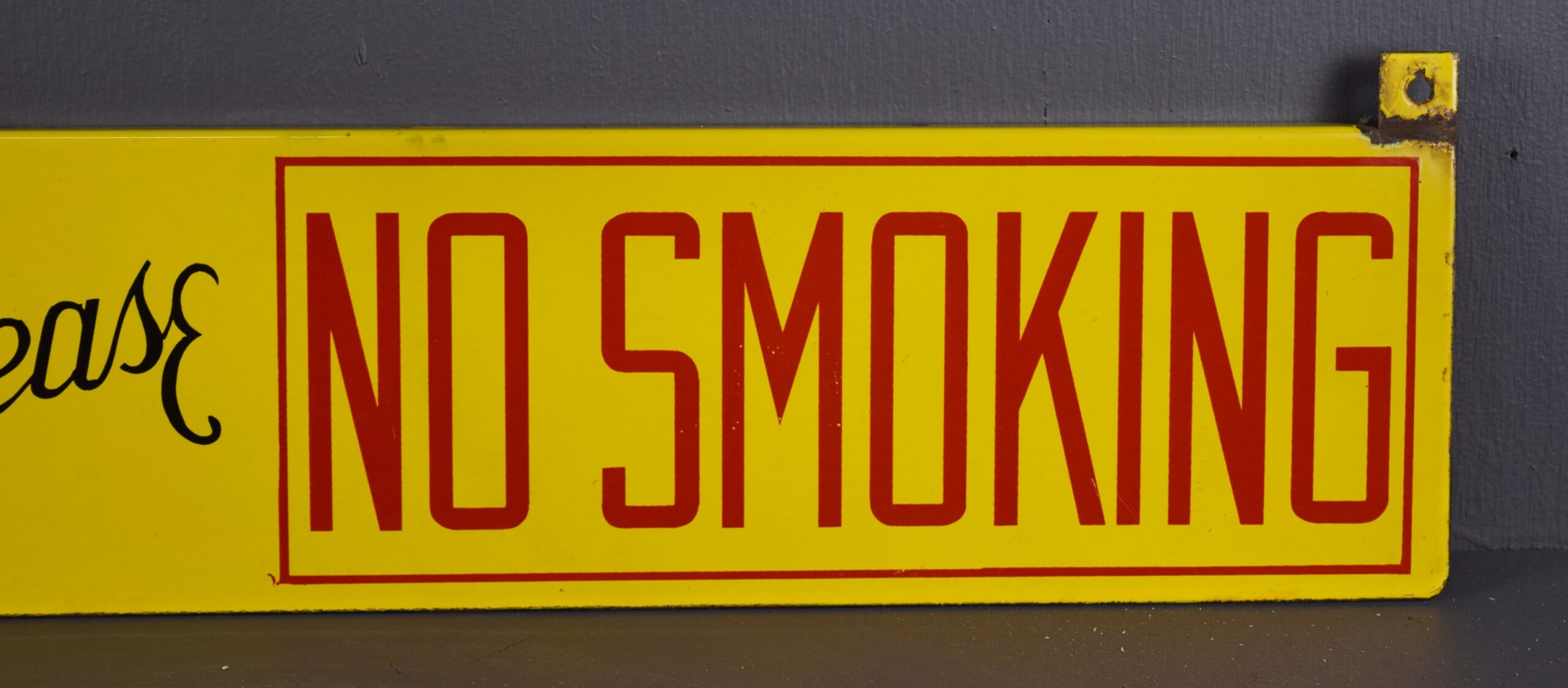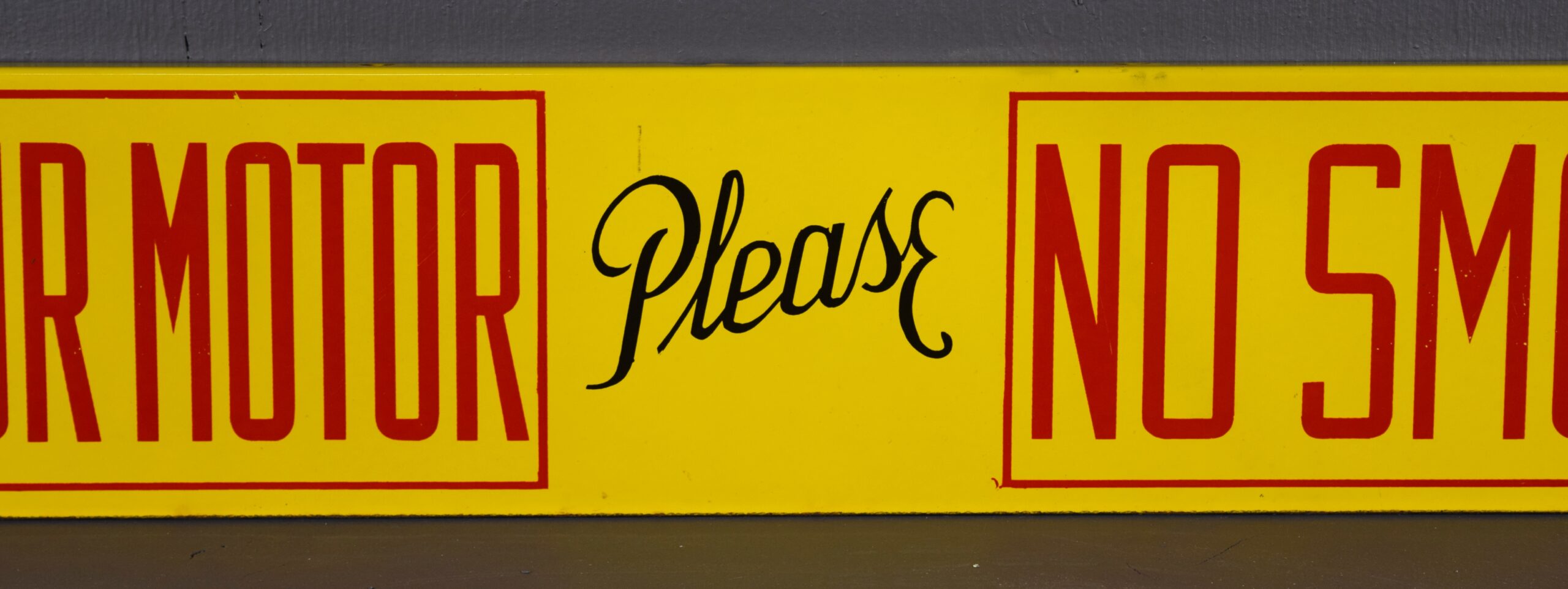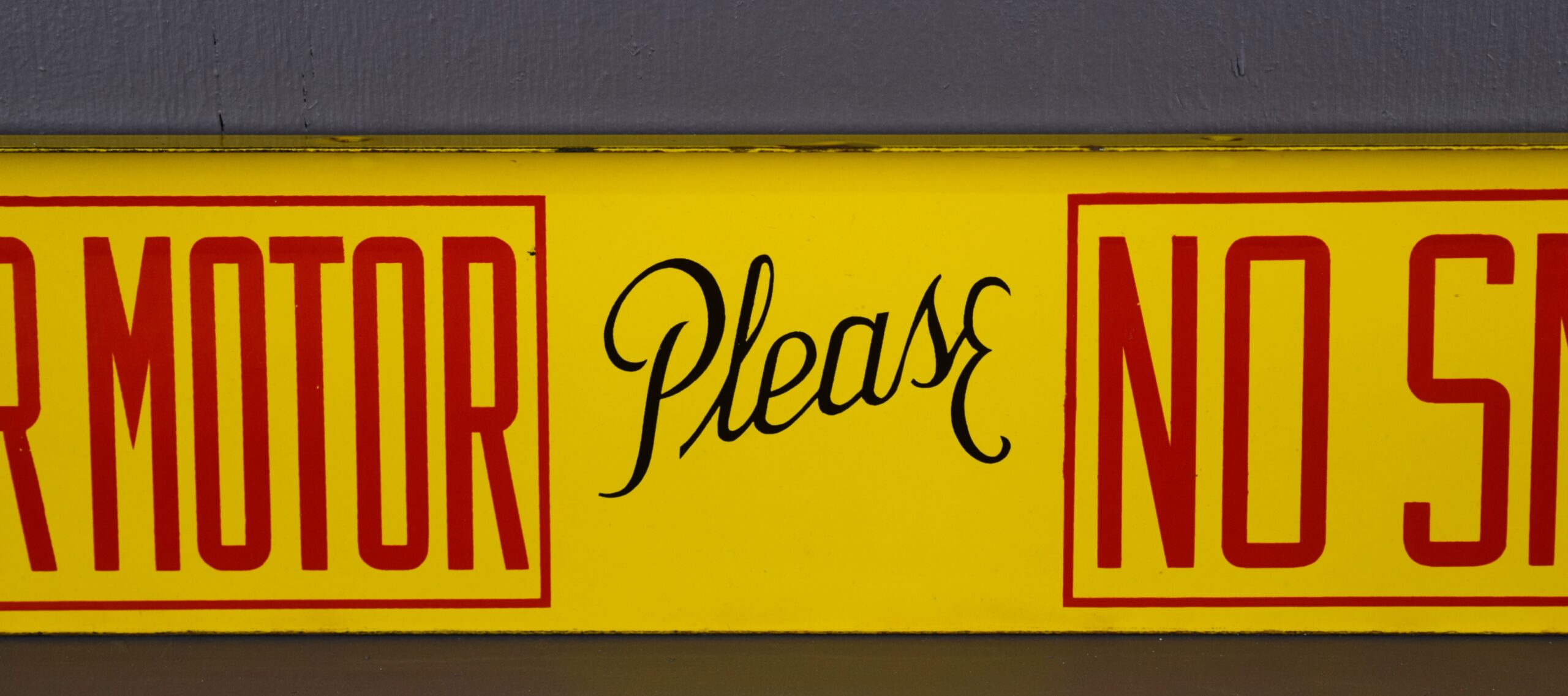 Emblazoned in vibrant yellow and red, this Shell sign will really stand out in your collection! The porcelain sign is double sided with brackets made into the sign for ease of hanging. With the bright yellow background, the red letters really stand out and make you take notice! “Stop Your Motor” and “No Smoking” are on either side of the sign with “Please” in the middle in cursive. This sign measures 36 inches long by 6 inches tall and is in excellent shape. Some chipping with paint loss has occurred where the brackets stand up from the sign. On the bottom lip there is also some minor chipping with paint loss. The flat surfaces of this porcelain sign are in great shape with bright letters. Don’t miss your chance to own this great piece! 18750-RQR