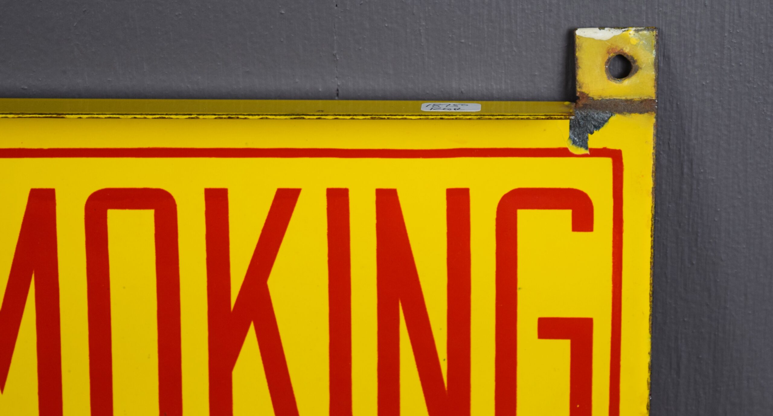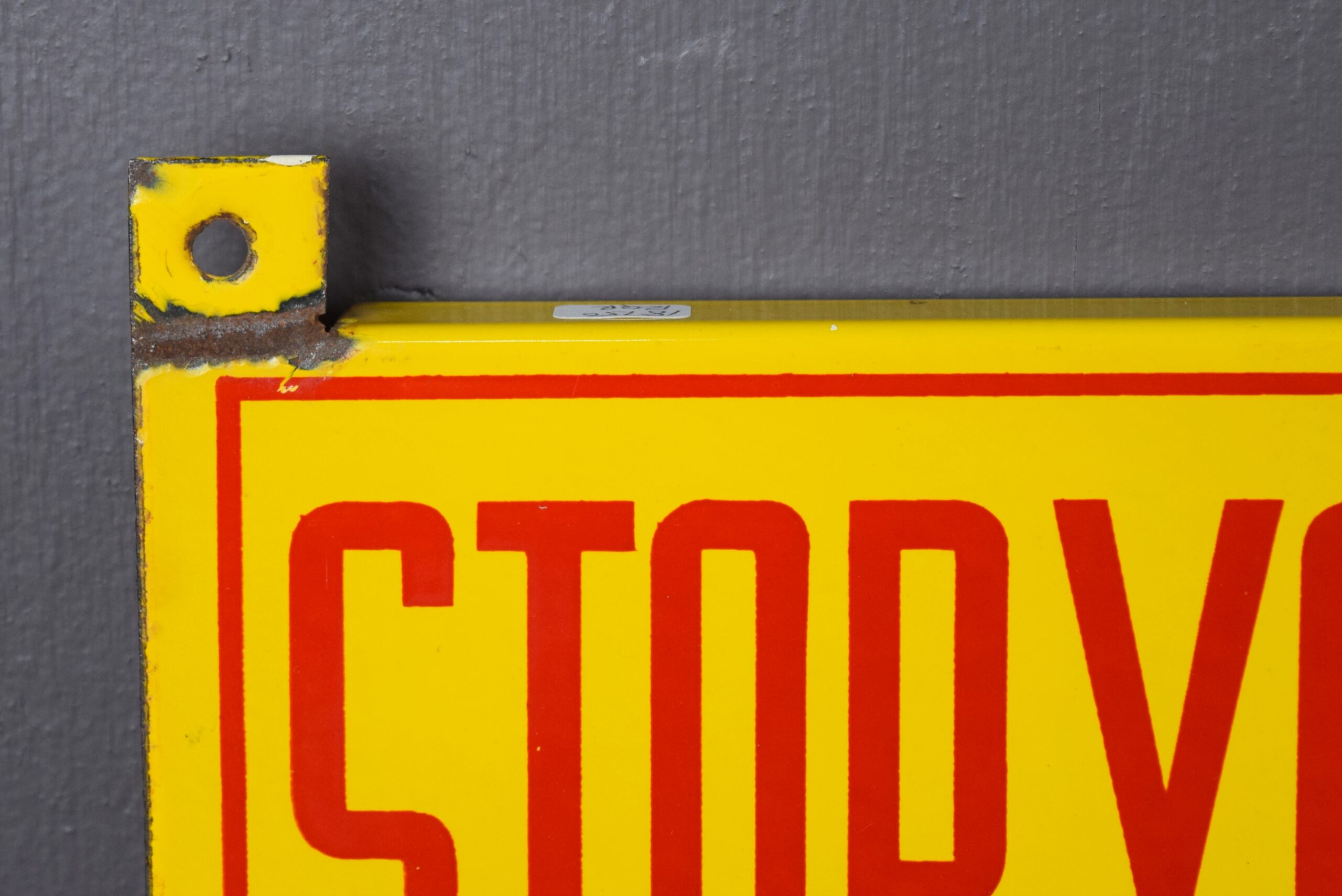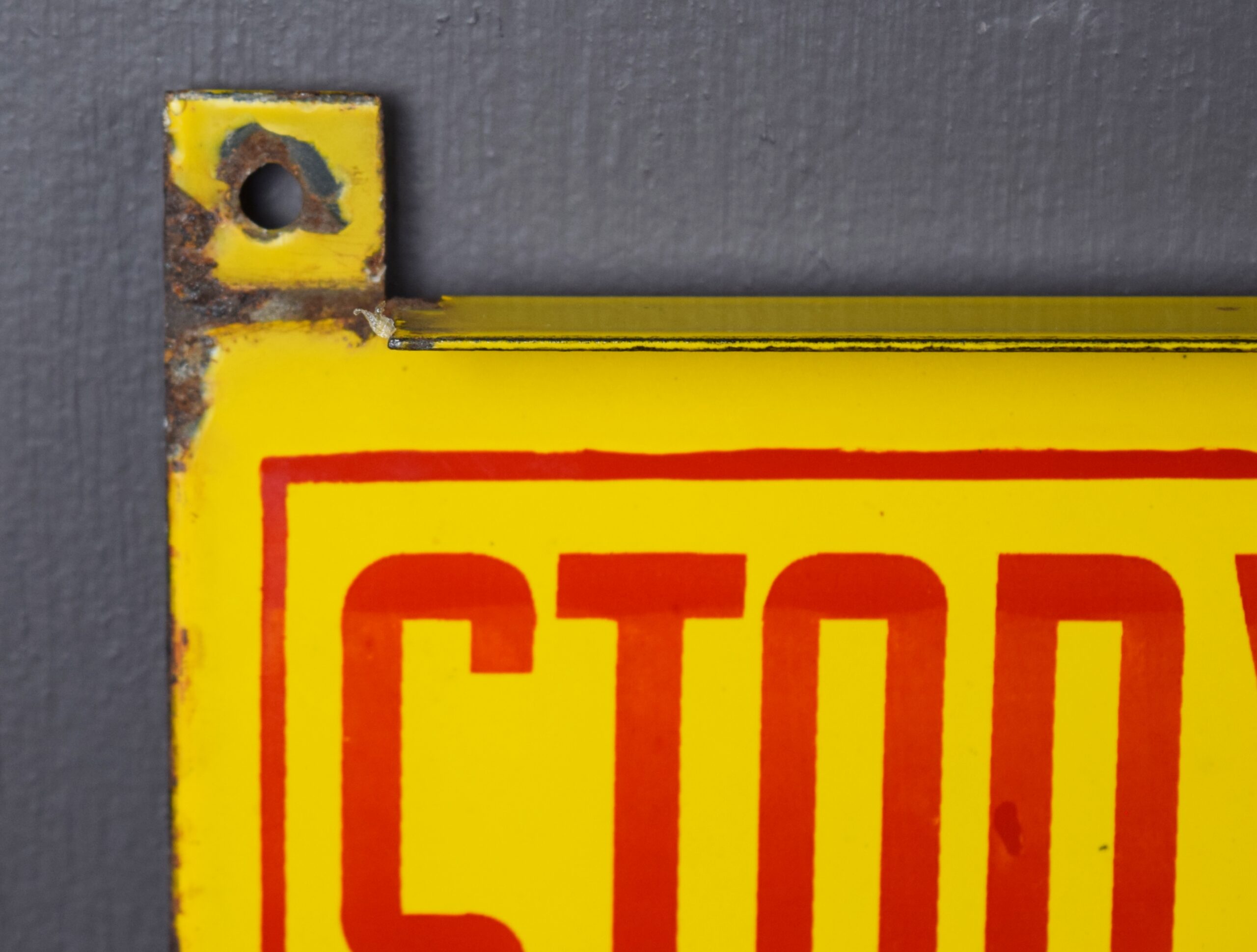 Emblazoned in vibrant yellow and red, this Shell sign will really stand out in your collection! The porcelain sign is double sided with brackets made into the sign for ease of hanging. With the bright yellow background, the red letters really stand out and make you take notice! “Stop Your Motor” and “No Smoking” are on either side of the sign with “Please” in the middle in cursive. This sign measures 36 inches long by 6 inches tall and is in excellent shape. Some chipping with paint loss has occurred where the brackets stand up from the sign. On the bottom lip there is also some minor chipping with paint loss. The flat surfaces of this porcelain sign are in great shape with bright letters. Don’t miss your chance to own this great piece! 18750-RQR