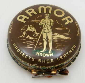 Circa 1930s 1 1/4 oz. tin of brown shoe polish with a great image of a knight in armor and a castle on the lid. It is inscribed “Armor Shoe Polish protects shoe leather” on the lid and “A mighty fine shine” around the side. It is in excellent condition. 10926-90QW
