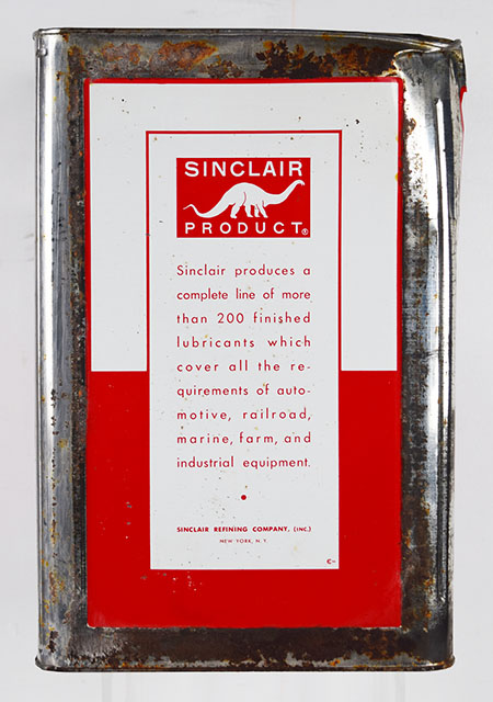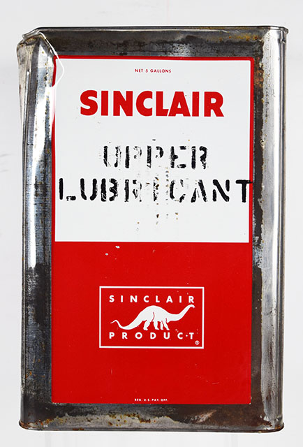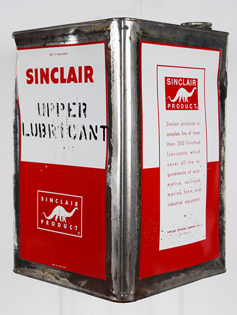 Once filled with 5 gallons of Upper Lubricant, this vintage Sinclair metal can has some super graphics on each of it’s four sides. The typical use over the years has left some small dents on the outer corners, and it still has the original cap and handle. This metal can stands fourteen inches tall by nine and a half inches wide. The colors are great on this piece and it will look great in your mancave or garage setting. 20119-EPP