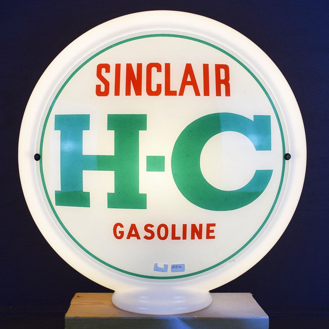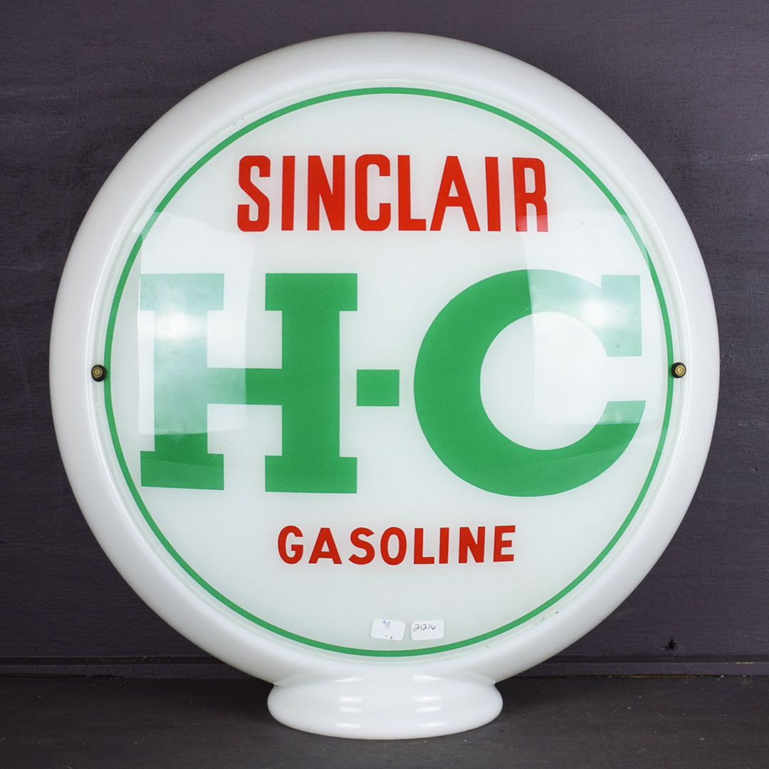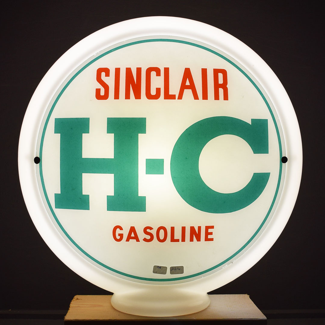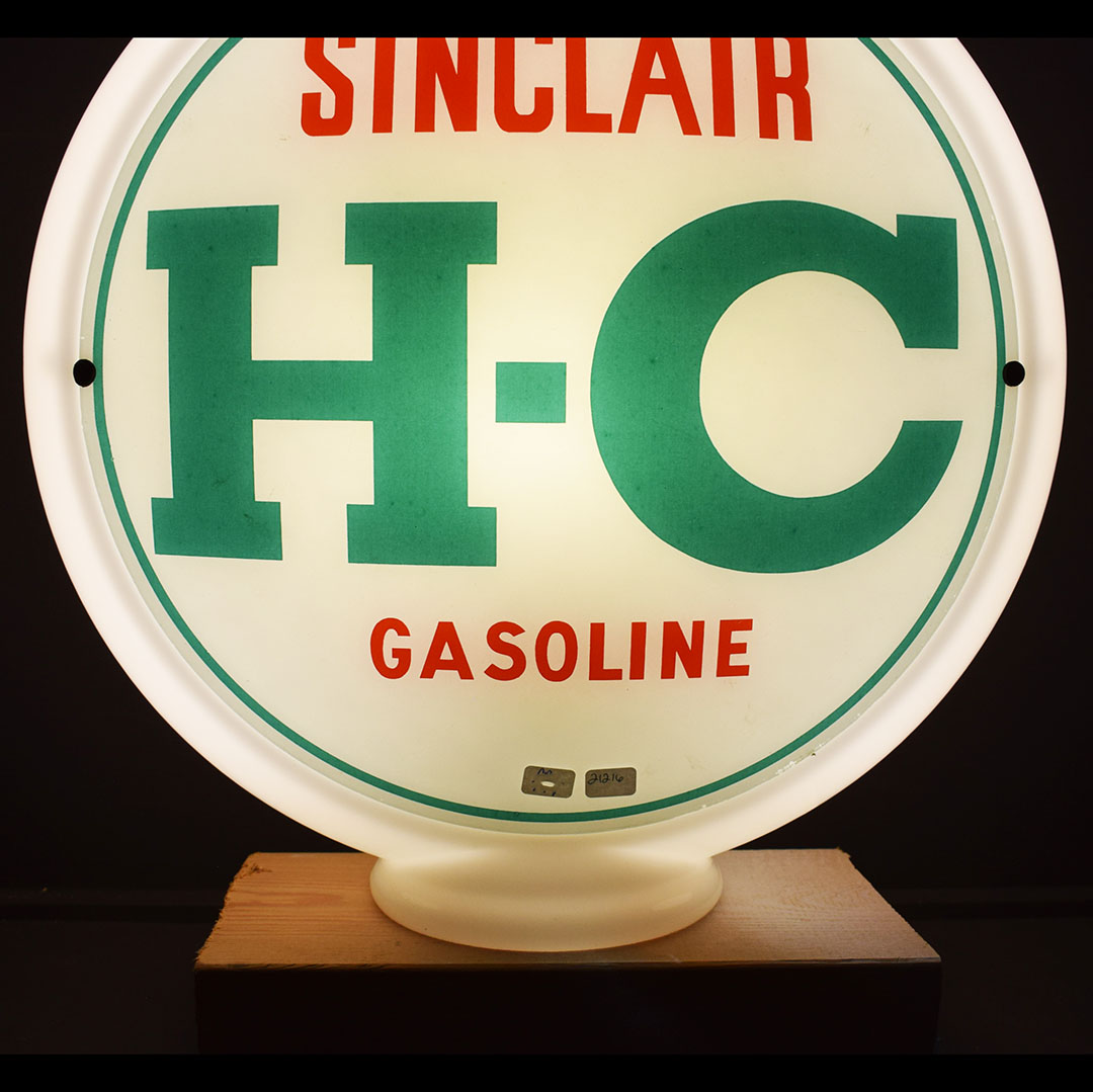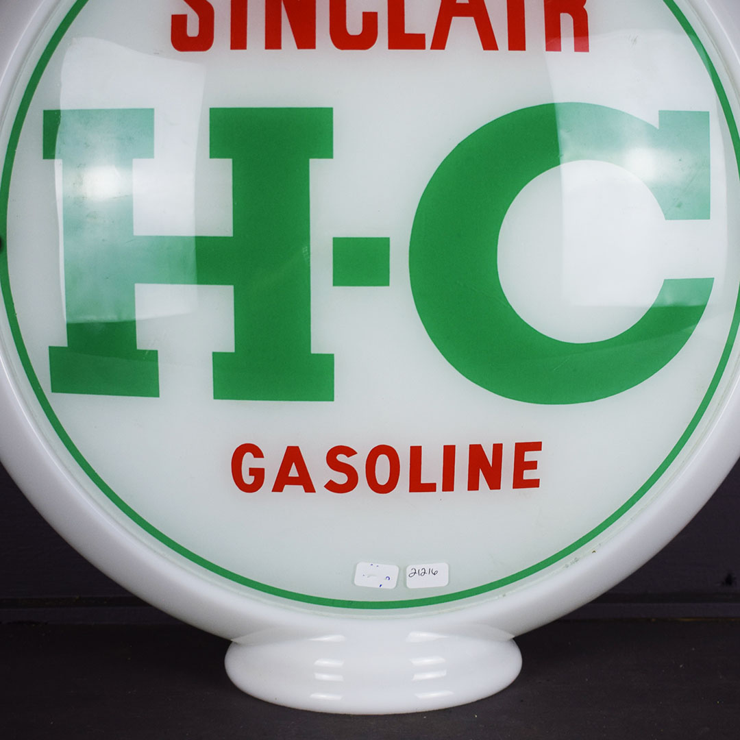 This Sinclair H-C Gas Pump globe comes from a time when life was simpler and less chaotic. This milk glass globe is 16.5 inches tall and free of chips and cracks. The glass lens inserts read “Sinclair H-C Gasoline” and are also in excellent shape. Sinclair produced H-C Gasoline as early as 1926, but this globe dates from the 1940s. The condition of this beauty is top-notch, and it is ready for your Sinclair gas pump or just for display on a shelf. 21216-TTP