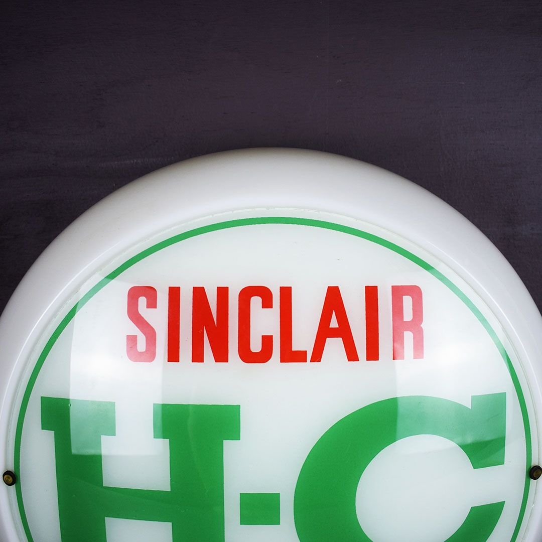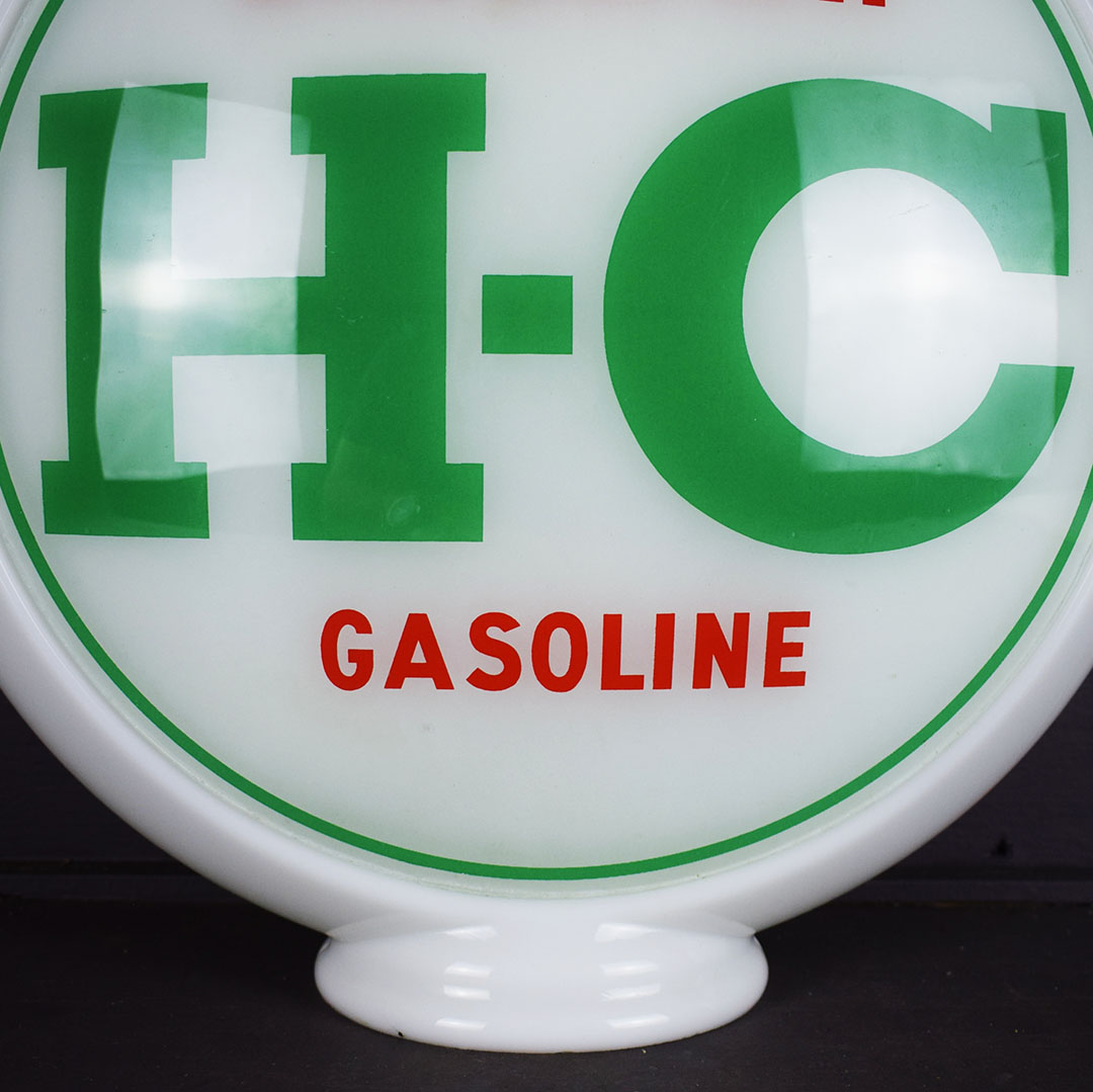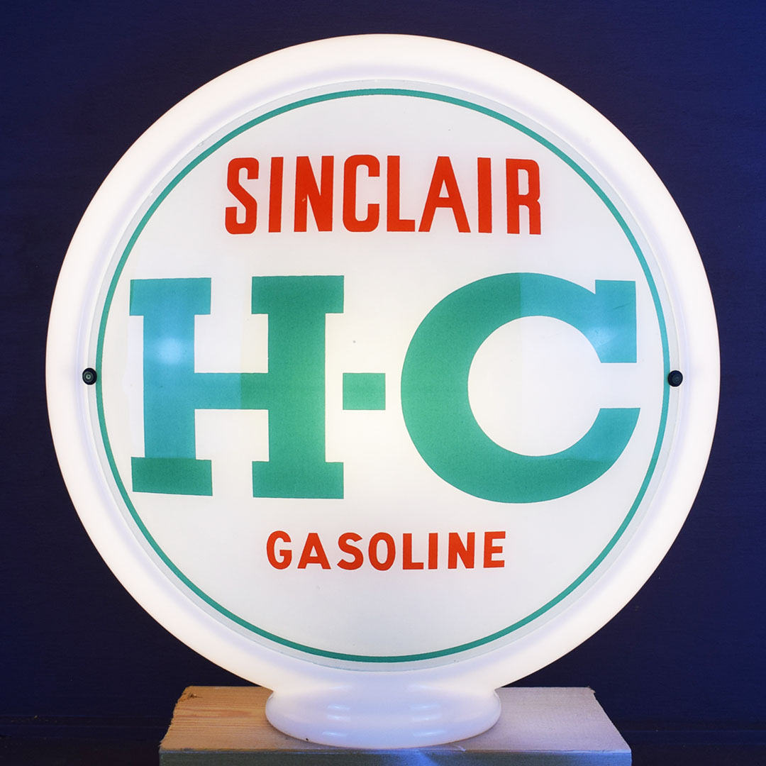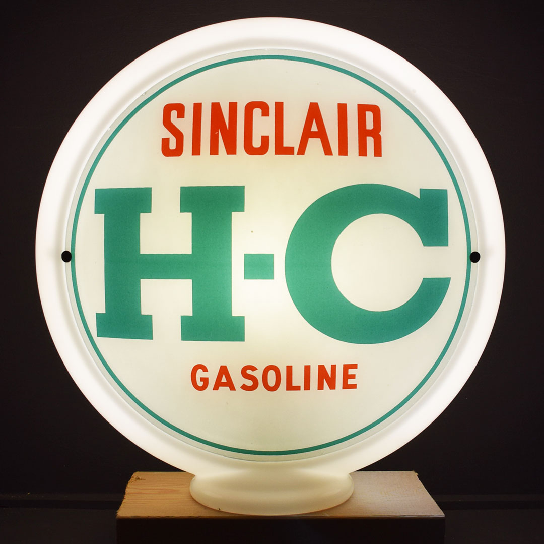 This Sinclair H-C Gas Pump globe comes from a time when life was simpler and less chaotic. This milk glass globe is 16.5 inches tall and free of chips and cracks. The glass lens inserts read “Sinclair H-C Gasoline” and are also in excellent shape. Sinclair produced H-C Gasoline as early as 1926, but this globe dates from the 1940s. The condition of this beauty is top-notch, and it is ready for your Sinclair gas pump or just for display on a shelf. 21216-TTP