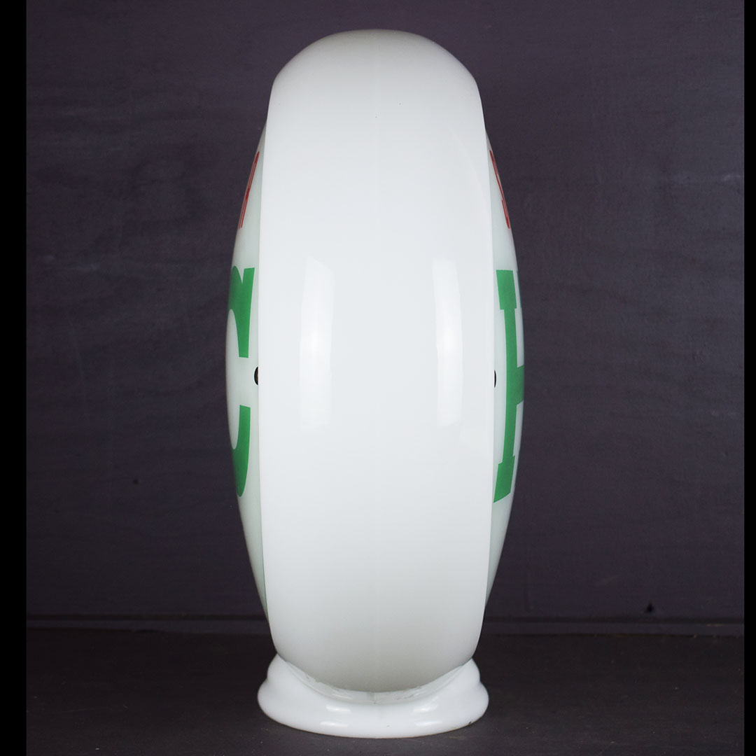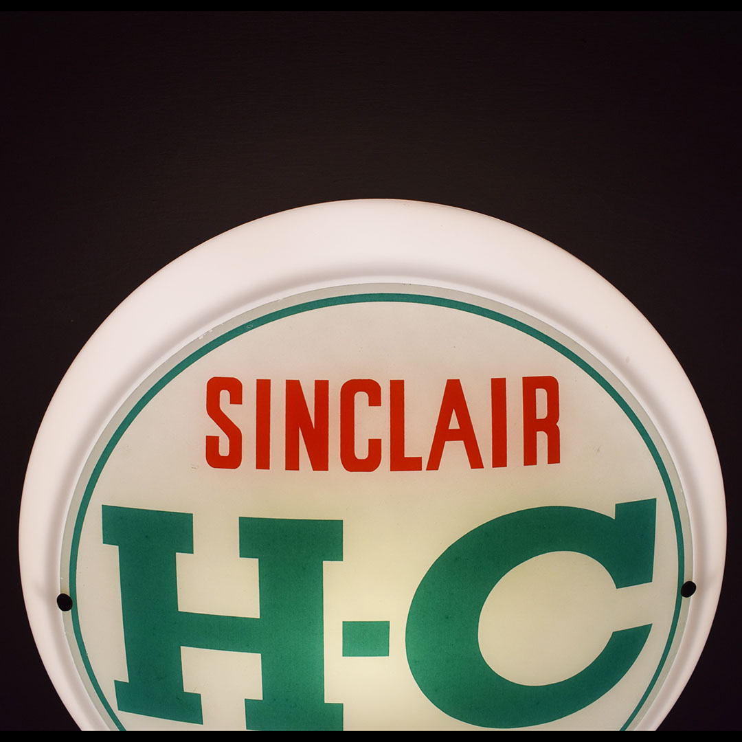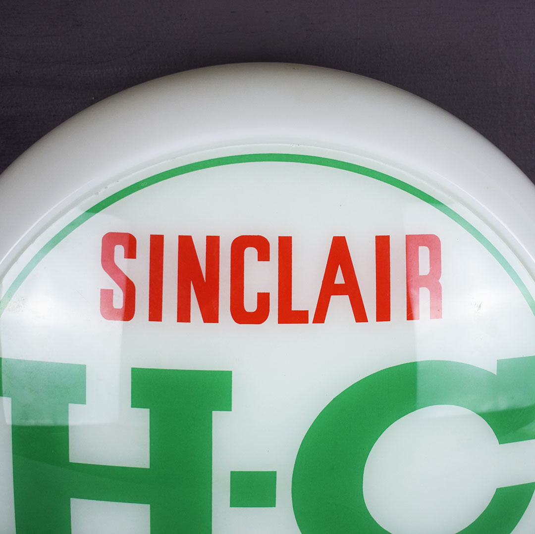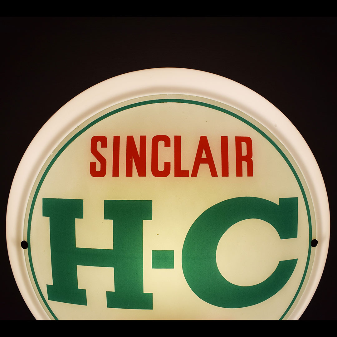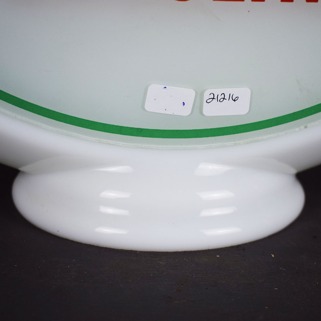 This Sinclair H-C Gas Pump globe comes from a time when life was simpler and less chaotic. This milk glass globe is 16.5 inches tall and free of chips and cracks. The glass lens inserts read “Sinclair H-C Gasoline” and are also in excellent shape. Sinclair produced H-C Gasoline as early as 1926, but this globe dates from the 1940s. The condition of this beauty is top-notch, and it is ready for your Sinclair gas pump or just for display on a shelf. 21216-TTP