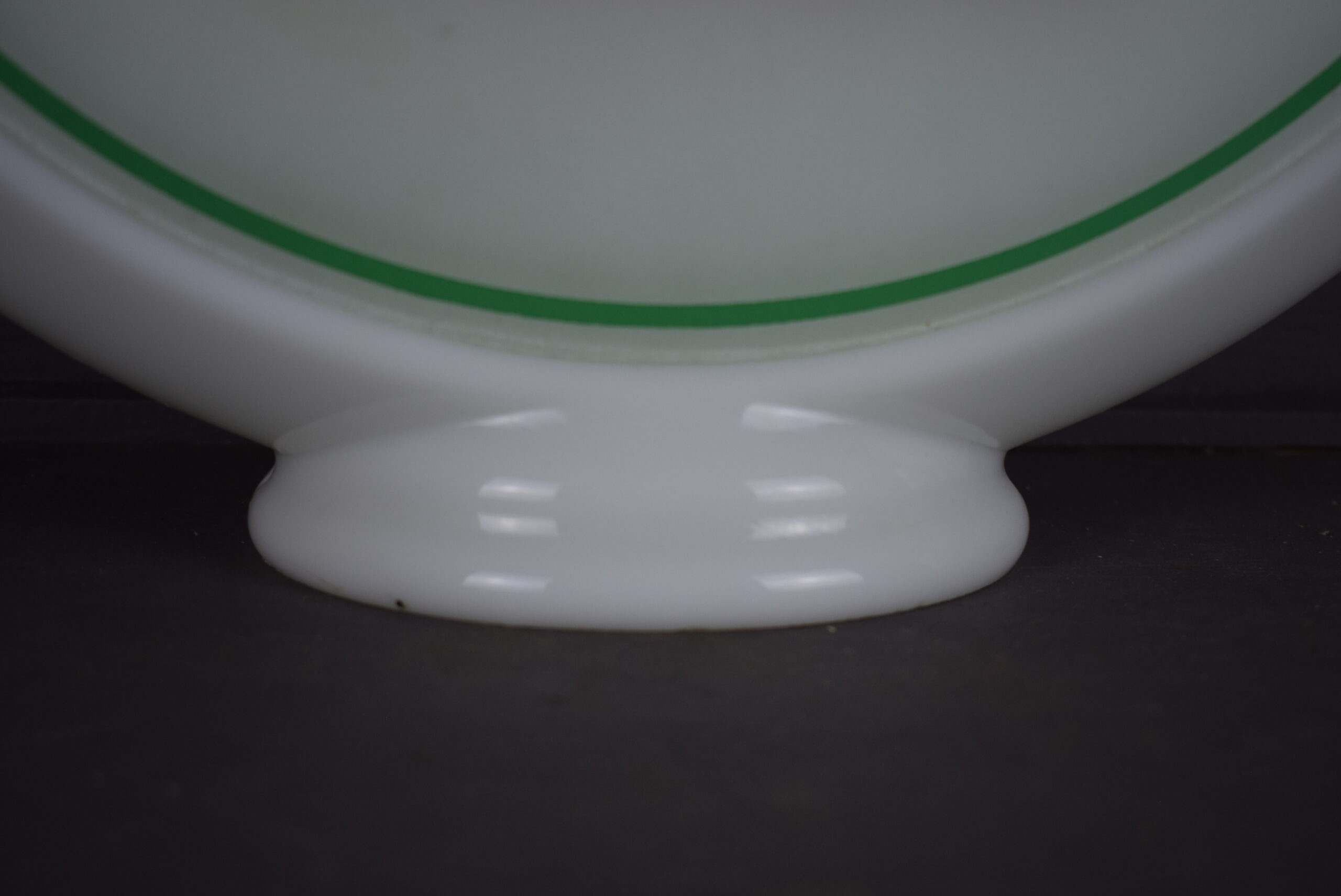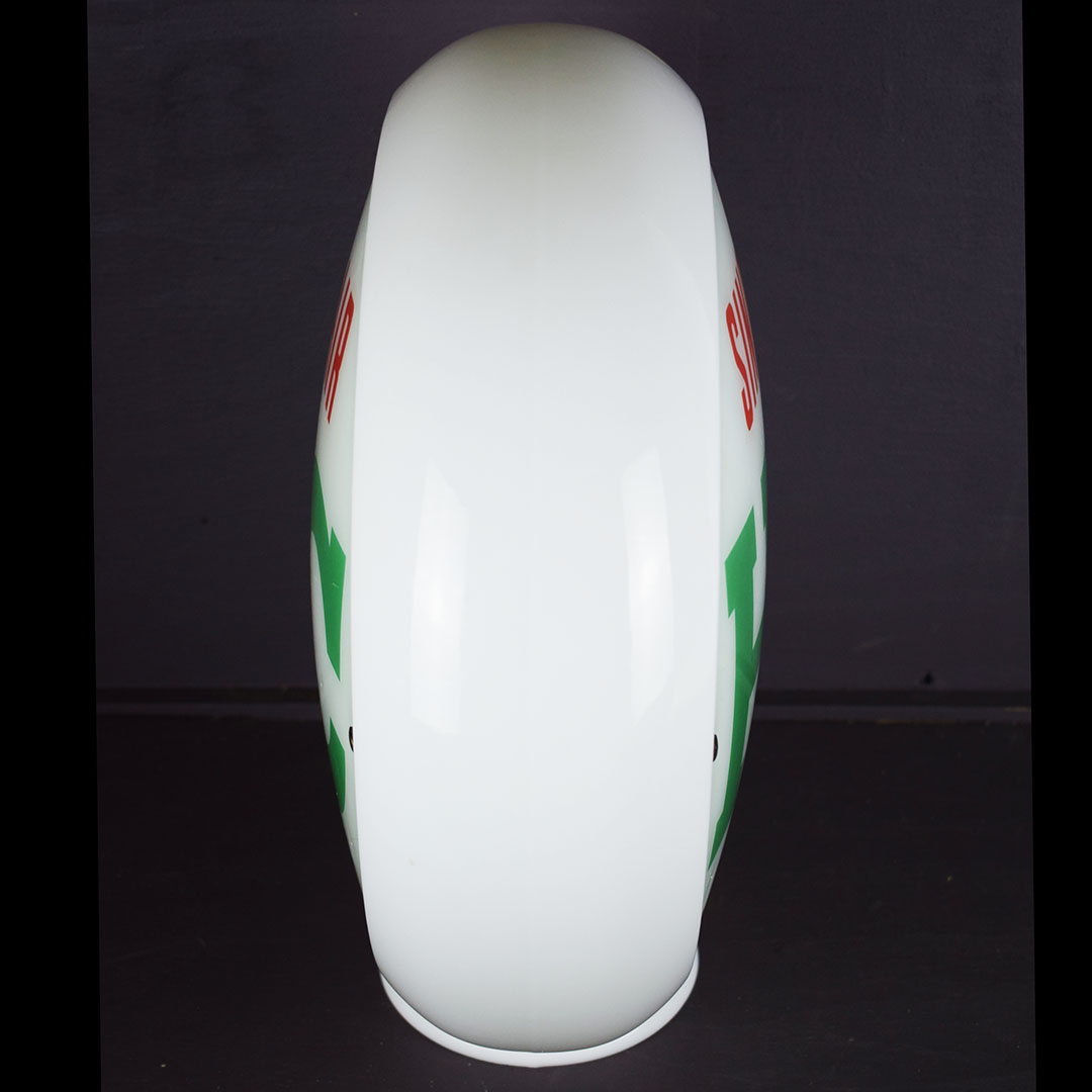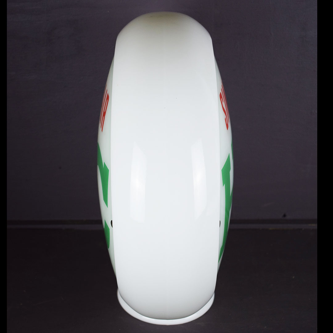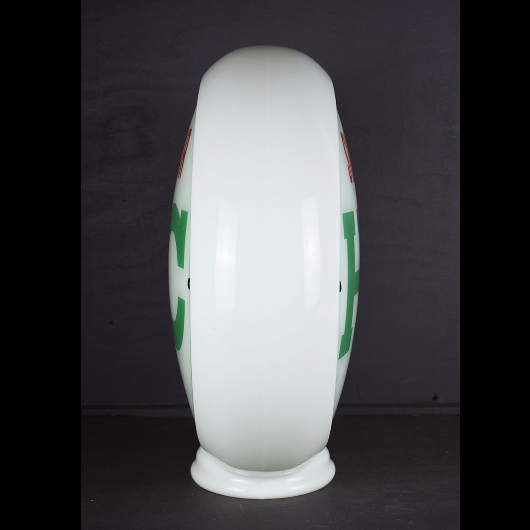 This Sinclair H-C Gas Pump globe comes from a time when life was simpler and less chaotic. This milk glass globe is 16.5 inches tall and free of chips and cracks. The glass lens inserts read “Sinclair H-C Gasoline” and are also in excellent shape. Sinclair produced H-C Gasoline as early as 1926, but this globe dates from the 1940s. The condition of this beauty is top-notch, and it is ready for your Sinclair gas pump or just for display on a shelf. 21216-TTP