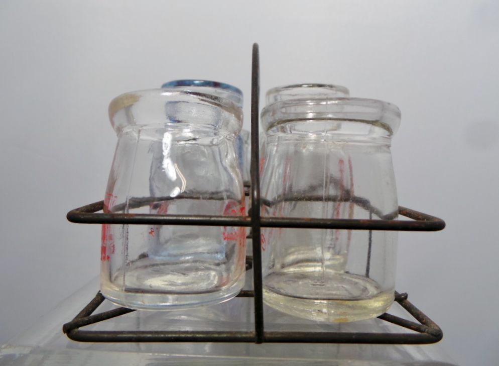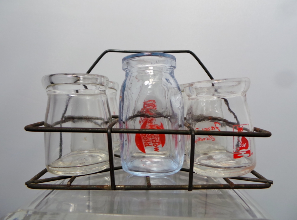 Once a common sight in diners and restaurants, this group of 6 individual glass cream bottles dates from the 1950s and comes in an original wire carrier. The group includes 3 unmarked bottles and 3 with ACL decorations, a Meadow Gold, a Borden’s with Elsie the cow, and a Faxes Dairy Carthage with the fox logo. The bottles measure 2 1/4 and 1 3/4 inches tall and are in near mint condition. They would be a wonderful addition to a diner display. 1428-81WT