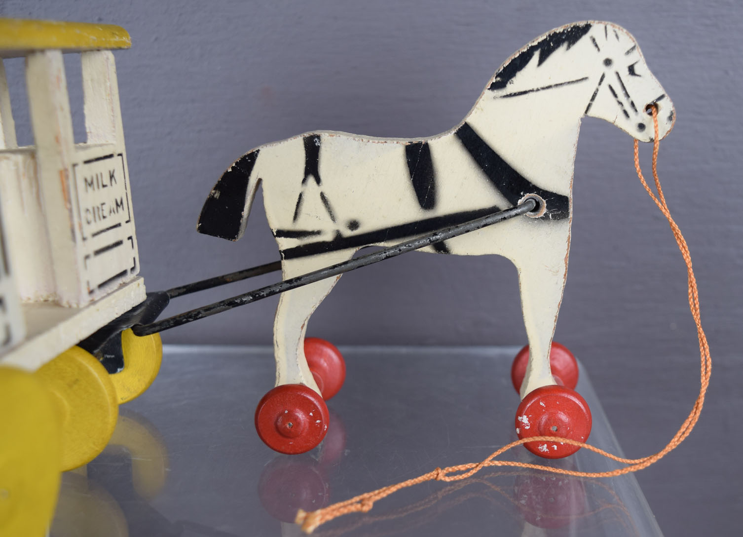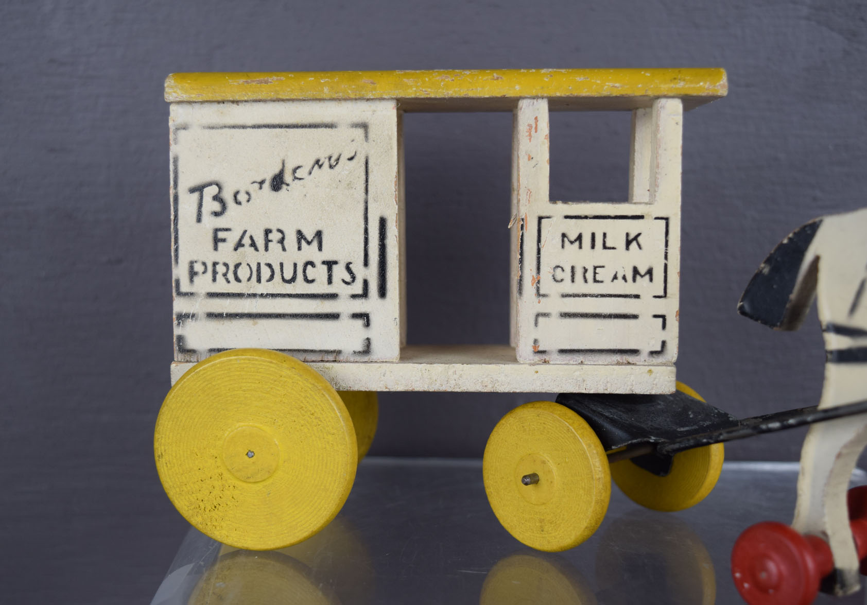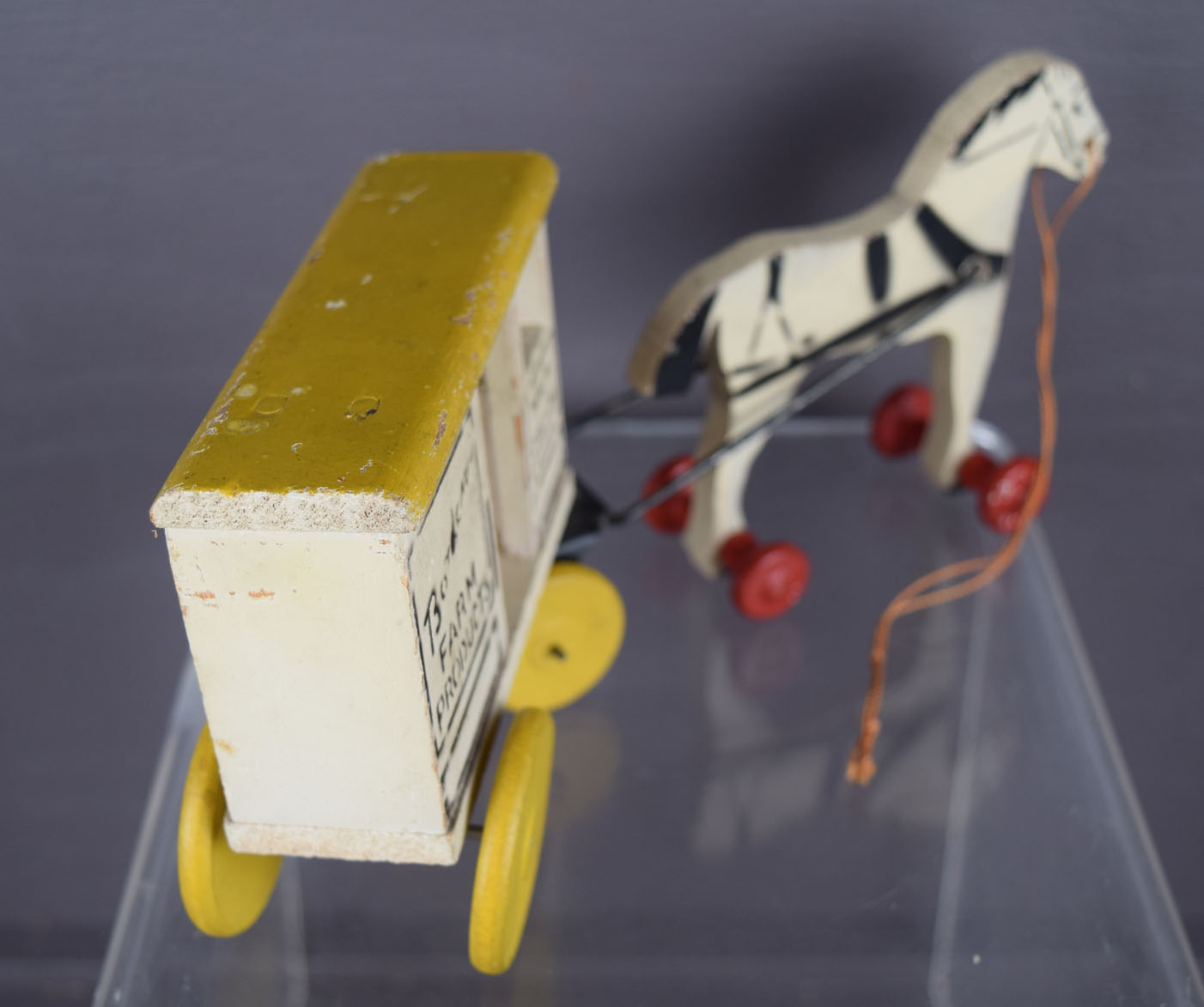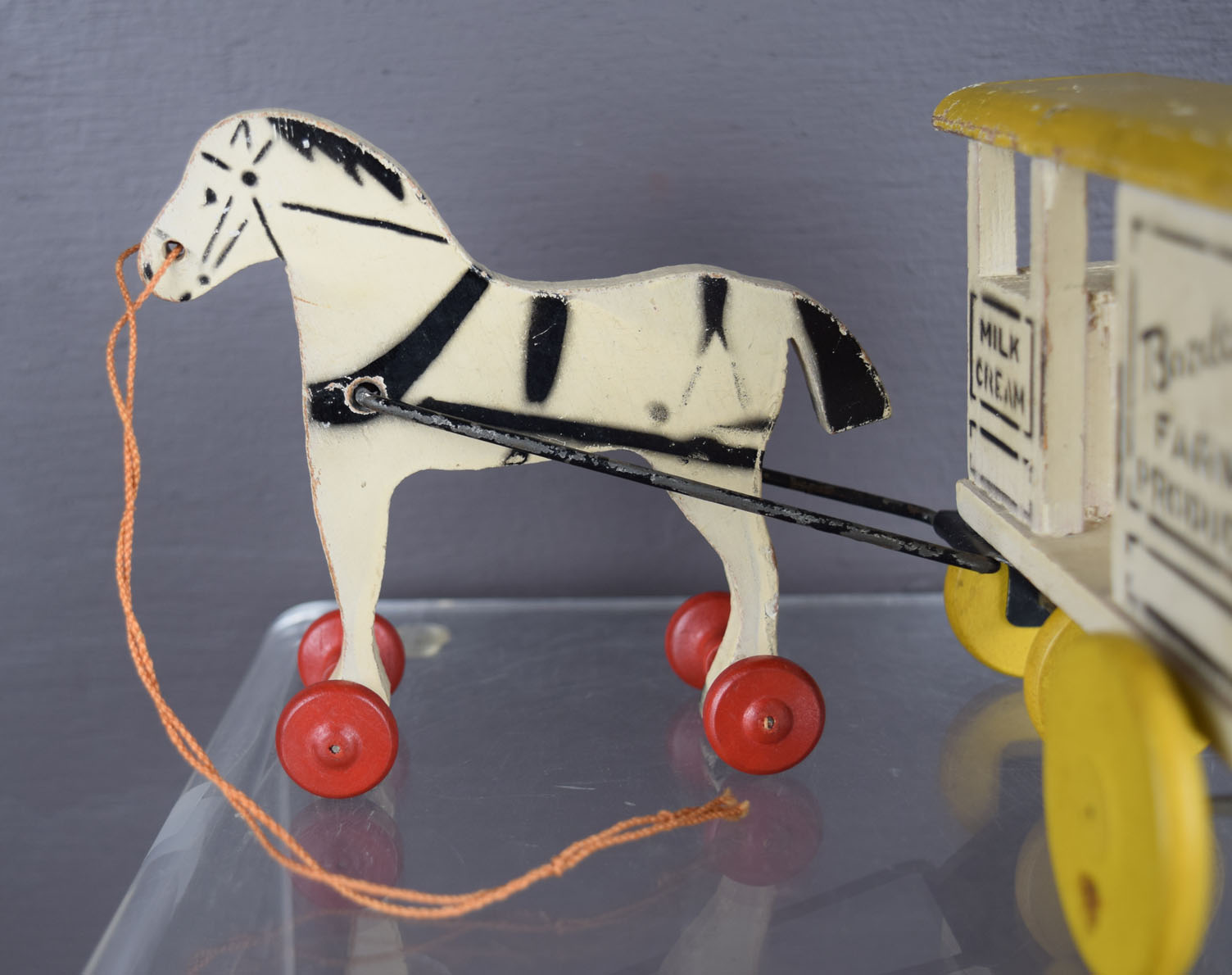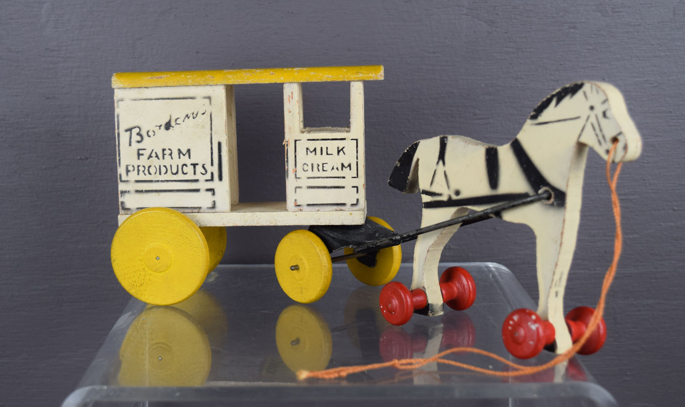 This is an original, old, vintage, and very cool small size, wooden Bordens advertising pull toy. It’s a nice horse on wheels pulling a Borden’s farm products wagon. It also mentions milk and cream on the front of the wagon. It looks to be complete and in excellent condition. The roof of the wagon has some small chips on it, and some slight roughness on the back. Some wear on the metal tongue that attaches the horse to the wagon. The total length is ten inches, and the horse is four and a quarter inches tall. No broken or missing parts. The pull string appears to be original. 19123-QEP