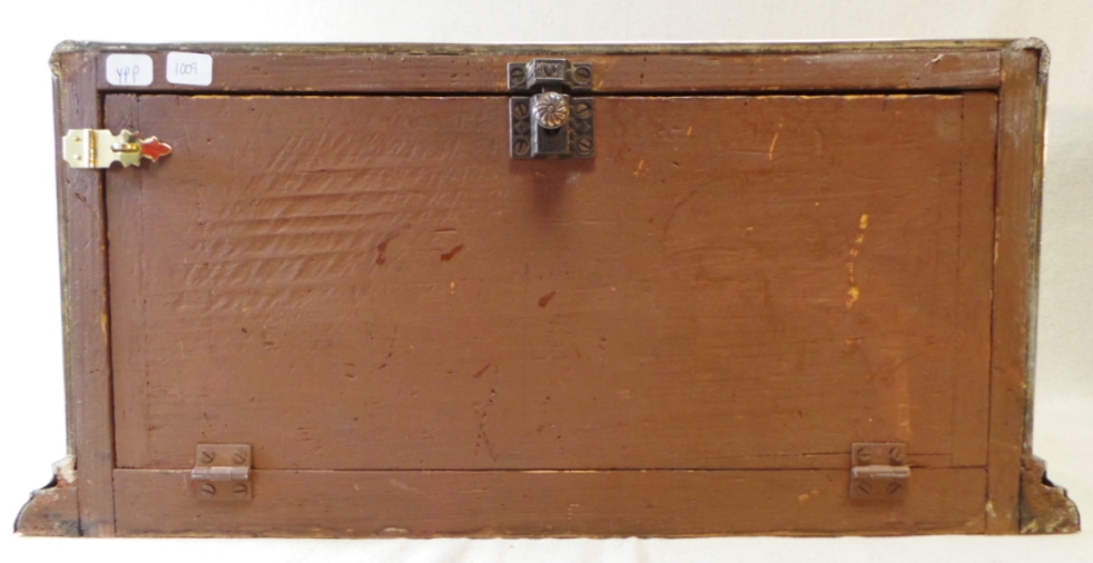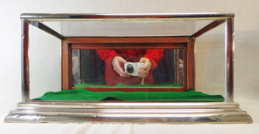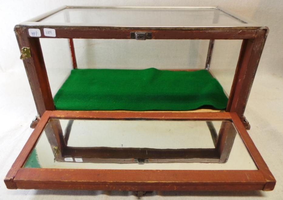 This clean nickel over wood counter top candy showcase is a perfect place to display your best pieces or anywhere where space is at a premium. Dating from the late 19th or early 20th century, it has a single mirror fronted rear drop door with an added hasp so that it can be locked. The mirror and all of the glass with the exception of one side glass appear to be original. The showcase measures 8 3/4 inches tall by 18 1/2 inches wide by 11 inches deep and is in excellent condition with the typical minor dings and nicks in the nickel and a small amount of spotting on the mirror. A new piece of green felt has been added as a liner. Please contact us for a exact shipping quote! 1019-81YPP