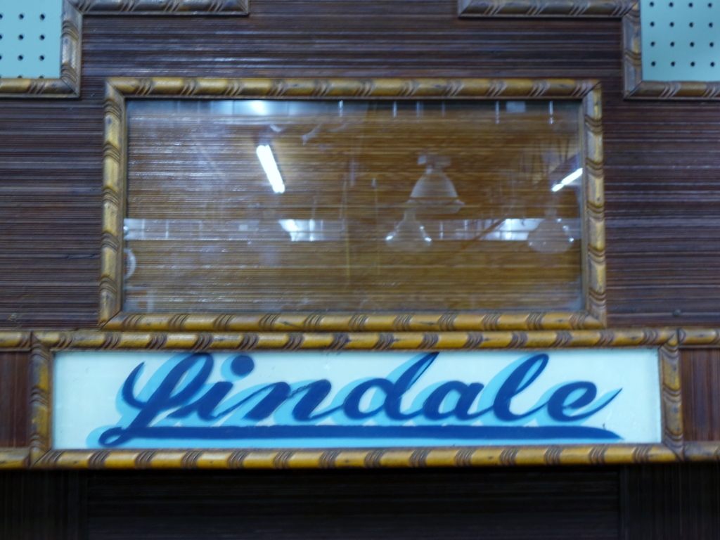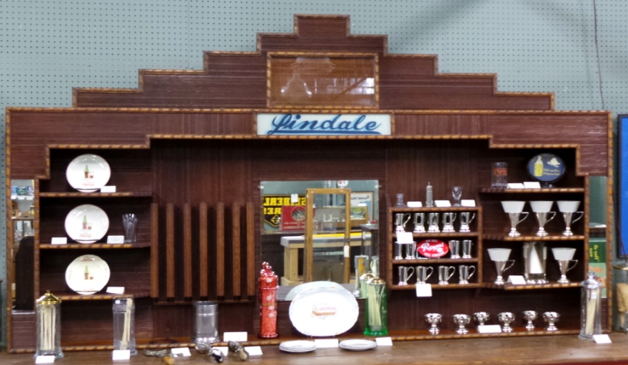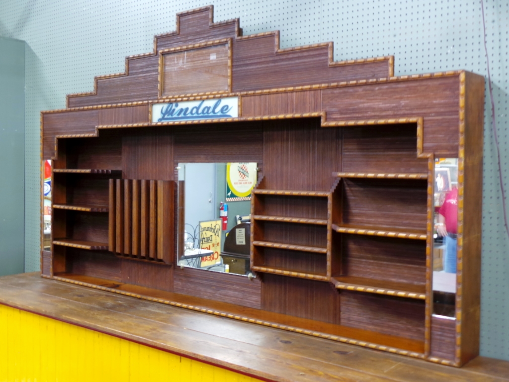Originally from an ice cream parlor in High Point, NC., this wonderful back bar shelf assembly dates from the 1930s. It is made of pine with plywood front panels that have been milled to give them the appearance of old coarse grain barn boards. There are carved half cove moldings on the edges and shelf fronts. The back bar has 3 shelves on each end, a 6 slotted vertical shelf for cigarette packs, and a large square mirror in the center with narrow mirrors on the ends. A reverse painted glass panel above the center mirror is inscribed in blue, “Lindale,” and there is a glass advertising sign holder at the top with a rear access door for updating specials. The back bar measures 58 1/2 inches tall by 108 inches wide by 8 inches deep and is in excellent condition with some staining on the end boards and on the bottom shelf. The mirrors are original, as is all of the finish except the end boards which had been painted and were recently refinished to match. While we have shown what this great piece can look like in the picture, these items are not included. You may use your own imagination for decorating this piece. This item will require a 3rd party shipper or pickup. Please contact us for more information. 16870-71WWP