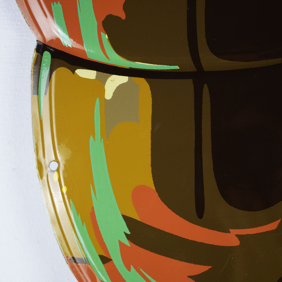 A beautiful embossed sign will fit perfectly in your soda fountain collection! Just the right size at 24 inches tall by 9.5 inches wide, this die-cut embossed sign mimics an ice cream float complete with dark soda at the bottom and vanilla ice cream on top. The colors are great on this sign, and it has a lovely glossy finish. Some small chips around the mounting holes and a few light scratches on the lower left edge of the sign are seen. Finding these smaller soda fountain signs is hard, so make it yours today! 21167-RTP
