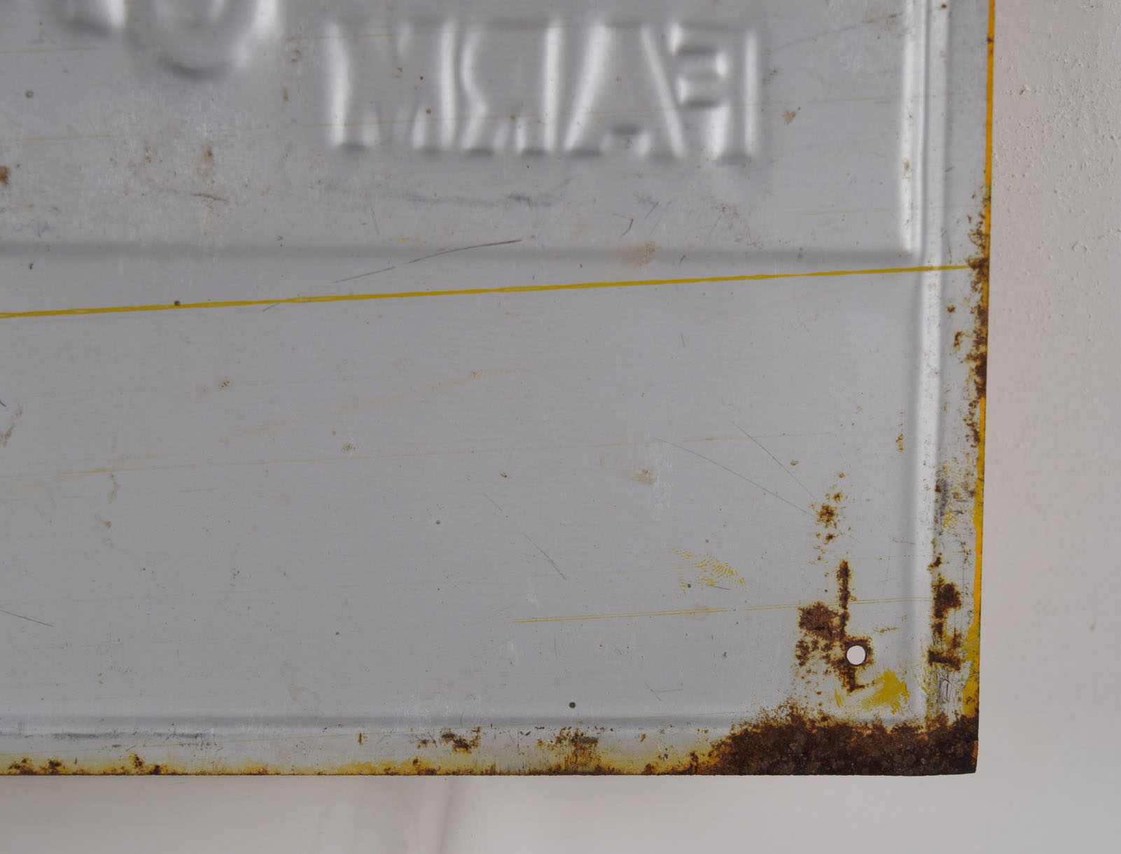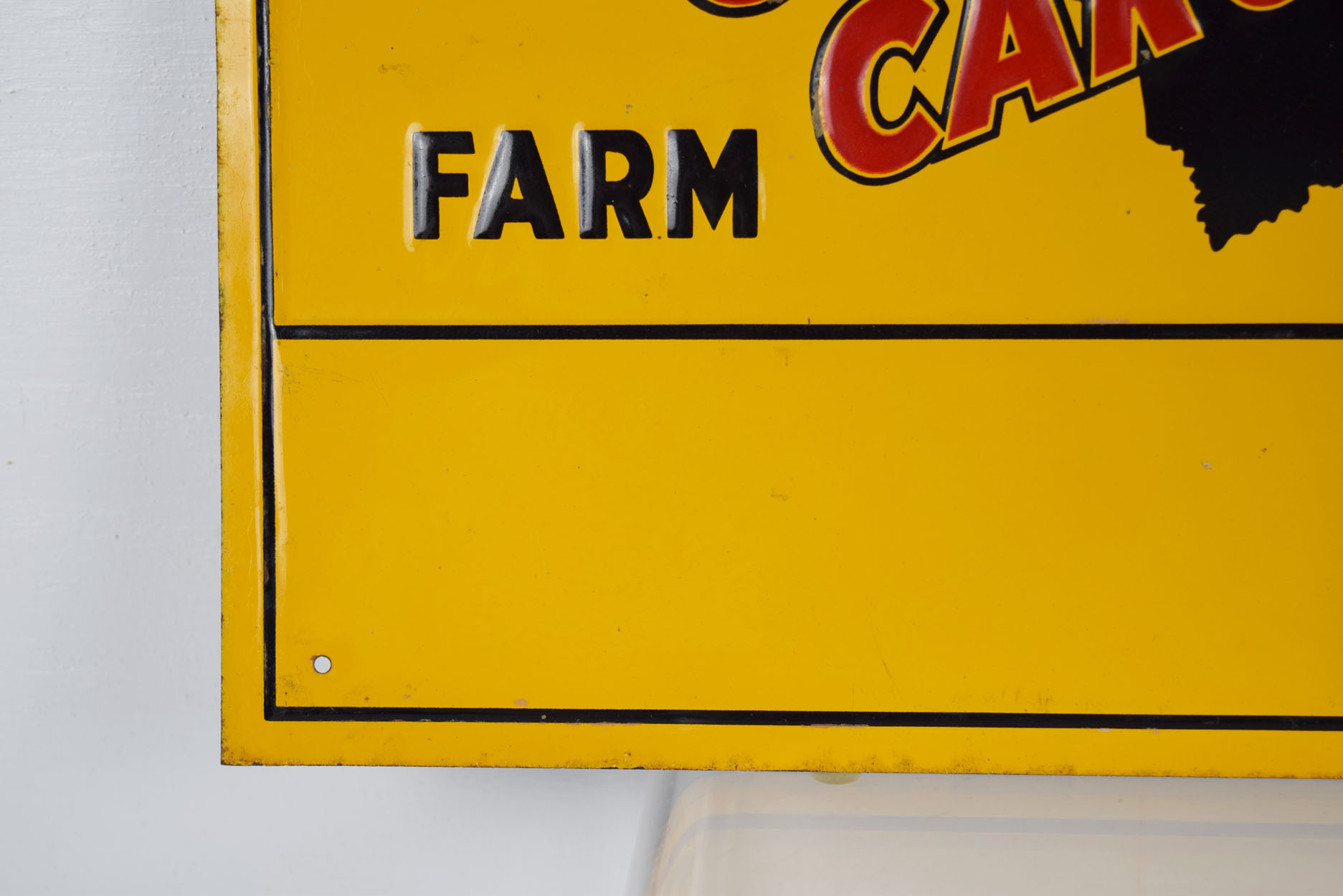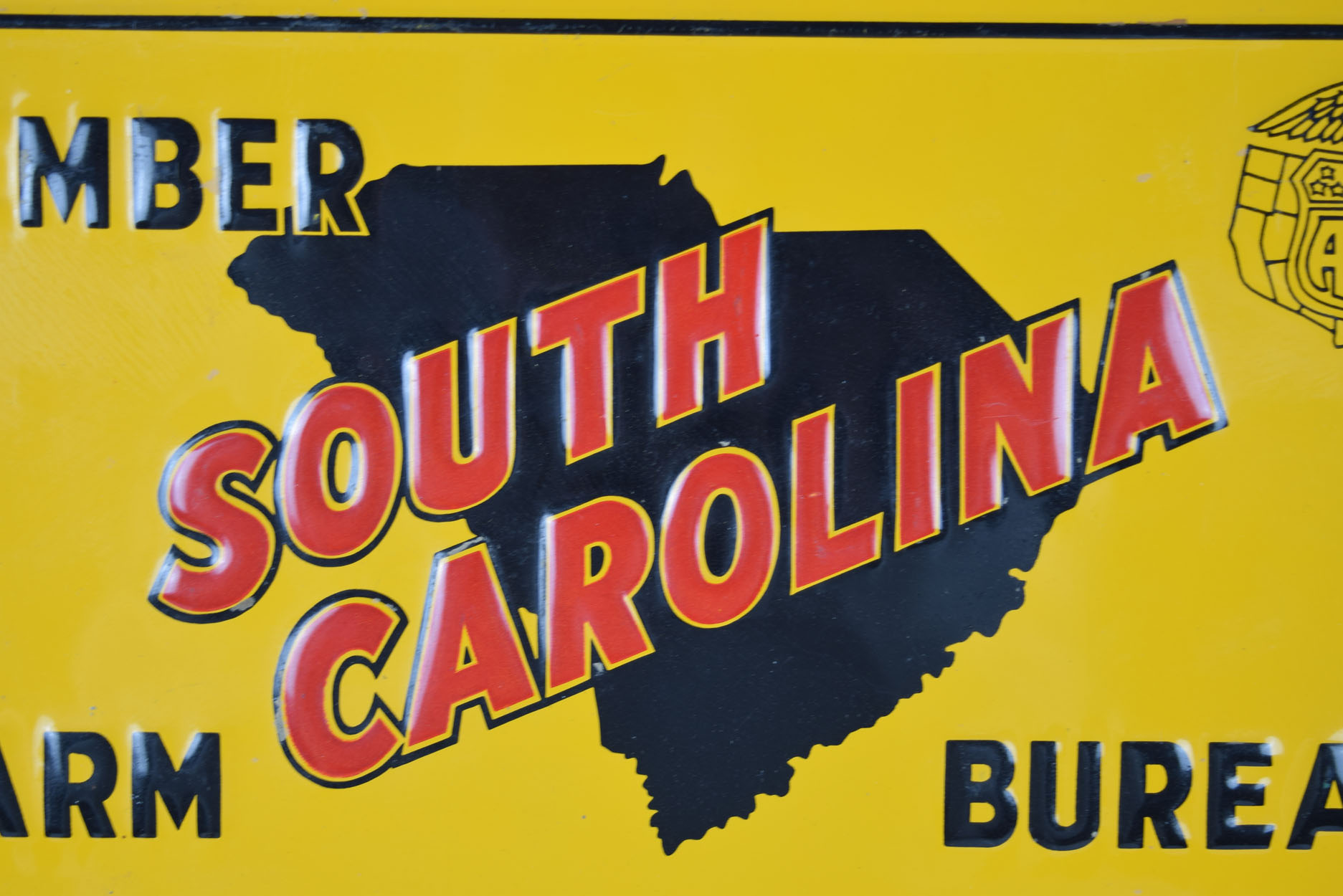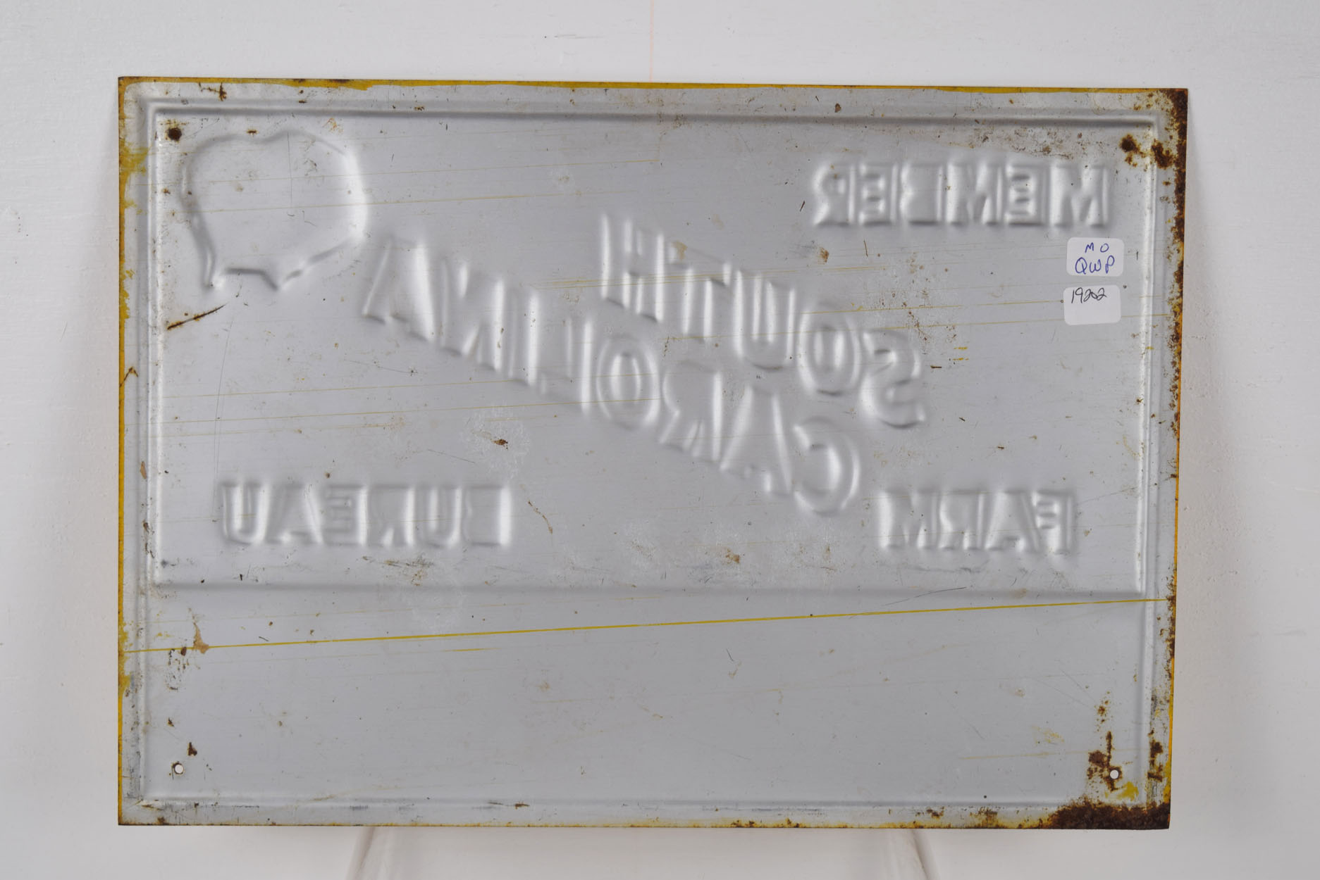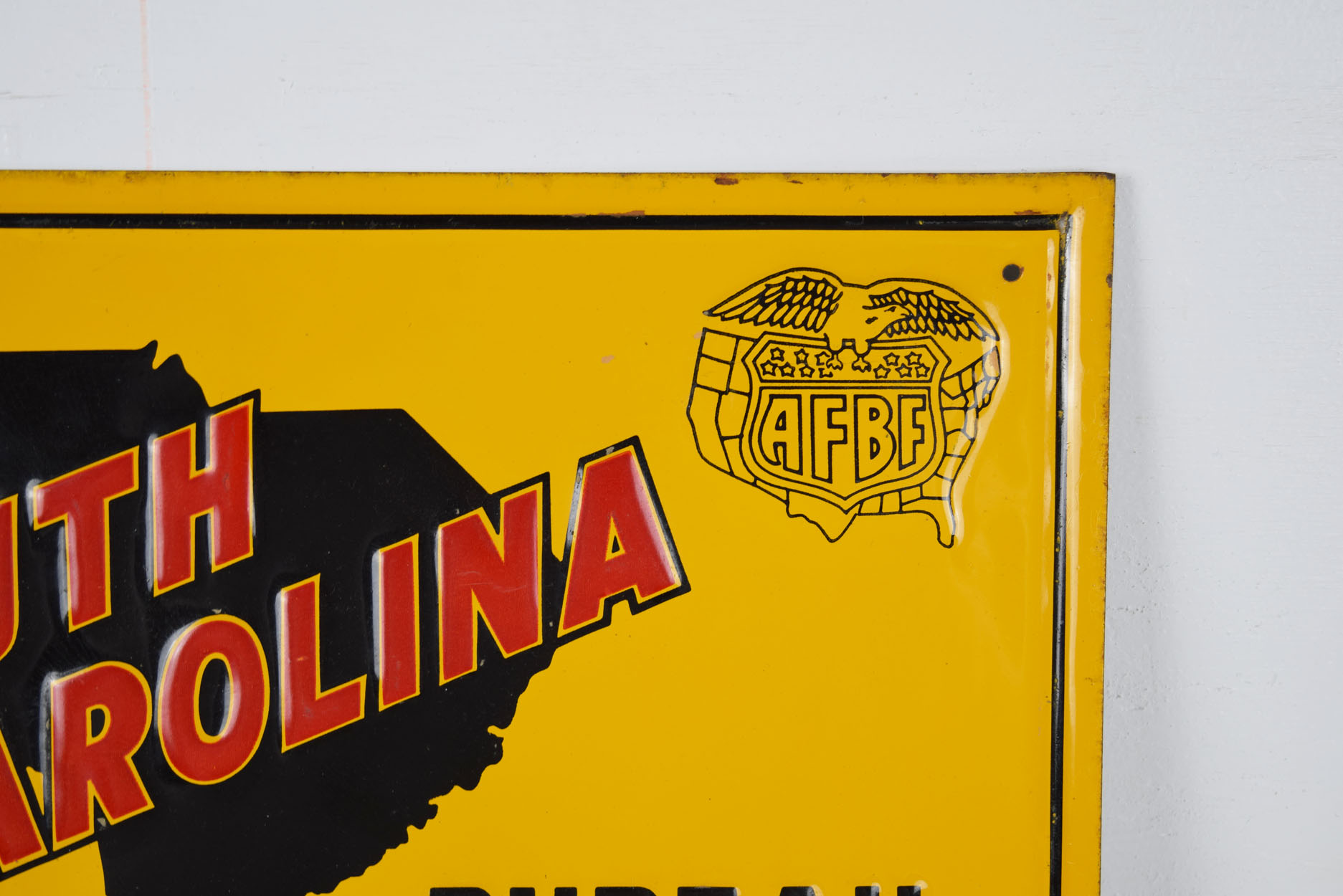 Dating from the 1950’s, this small South Carolina Farm Bureau embossed sign measures fourteen inches wide by ten inches tall and has an unused privilege panel at the bottom. The letters on this rare sign are embossed, as is the AFBF logo in the upper right corner. Also, the privilege panel is raised! The outer raised border has some very minor chips with some slight paint loss. Along the outer edge of this metal sign, it has some minor wear. Some of the embossed letters you can see some paper residue, which we did not try to remove. When you flip the sign over, some slight surface rust can be seen on the upper and lower right corners. It is marked “The Scioto Sign Company”, “Kenton, Ohio” in the lower right corner. If you love vintage farming and agriculture signs, make sure you add this to your collection! 19202-QWP