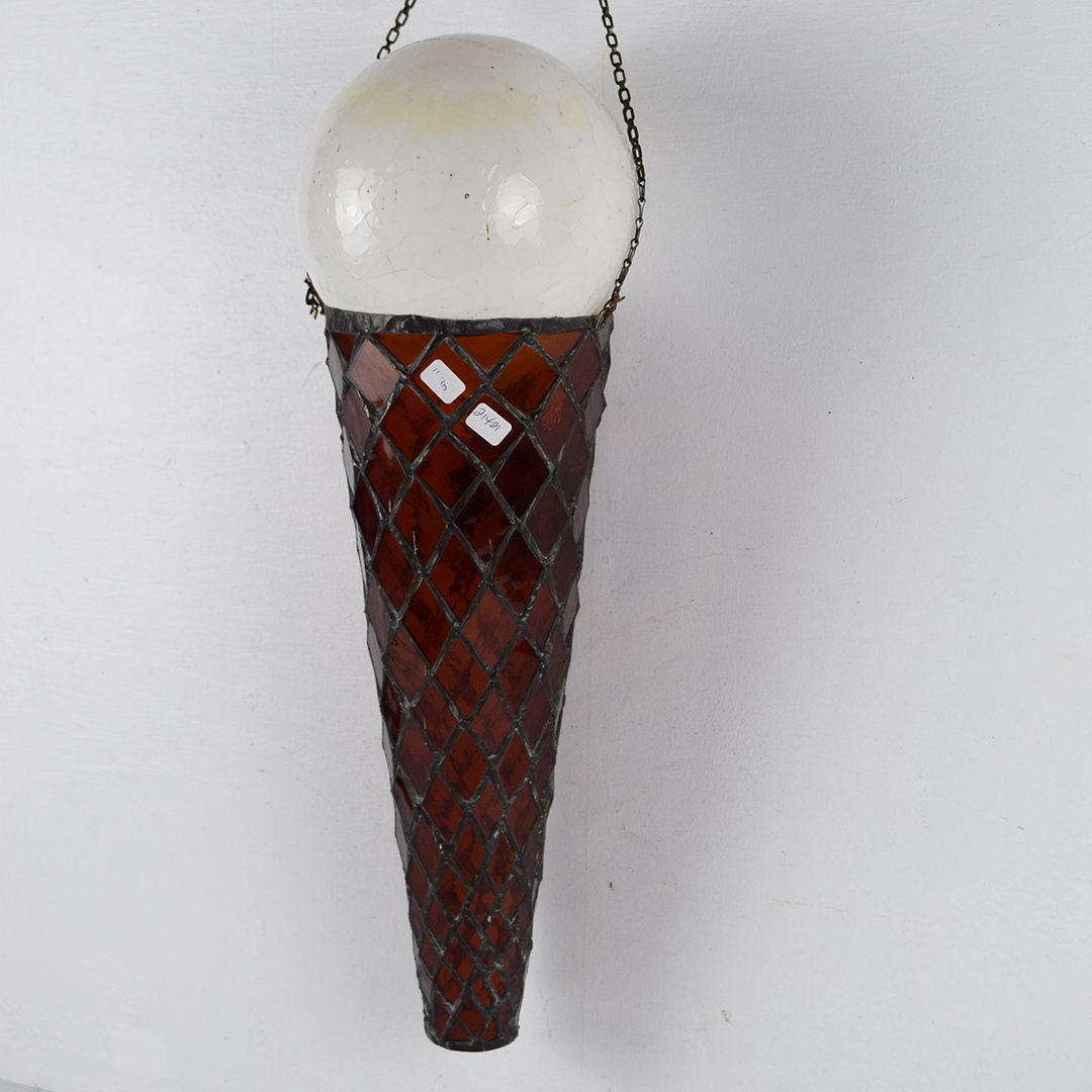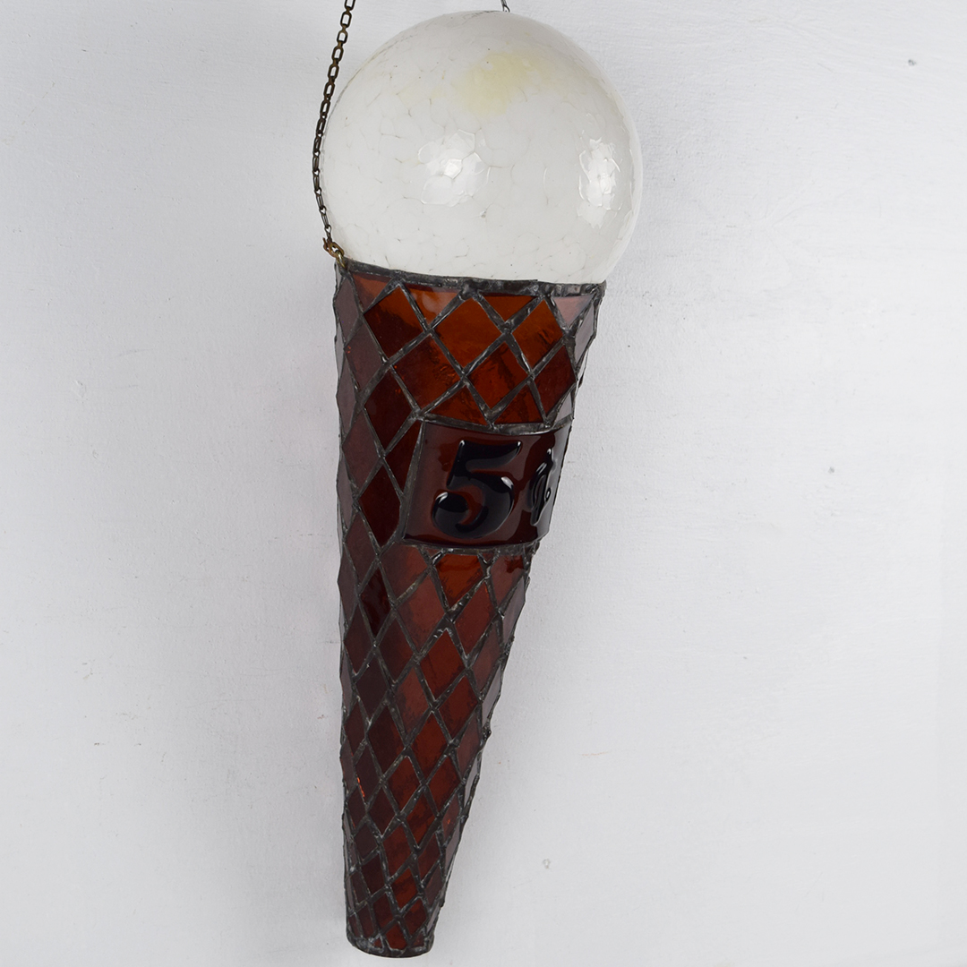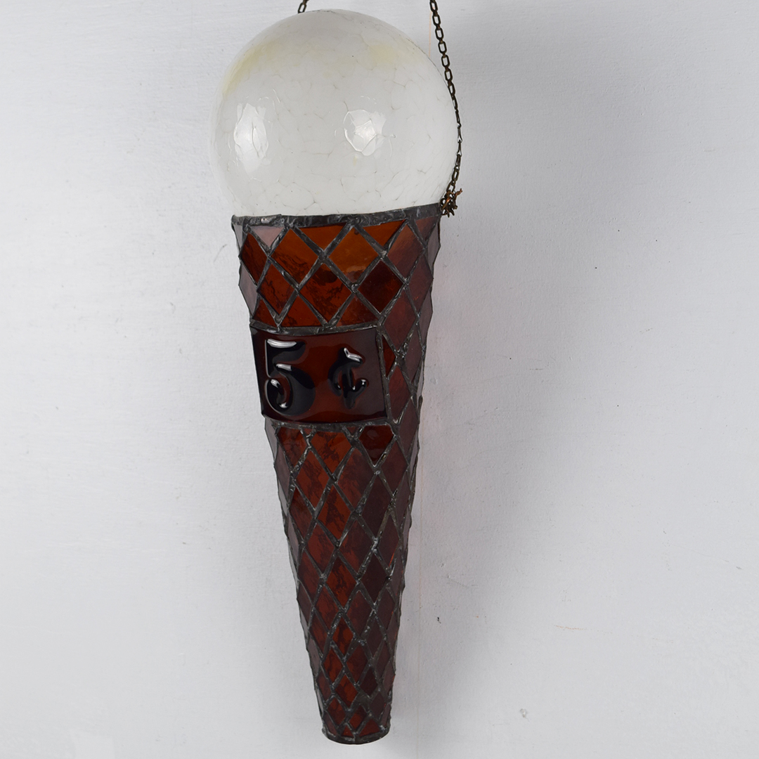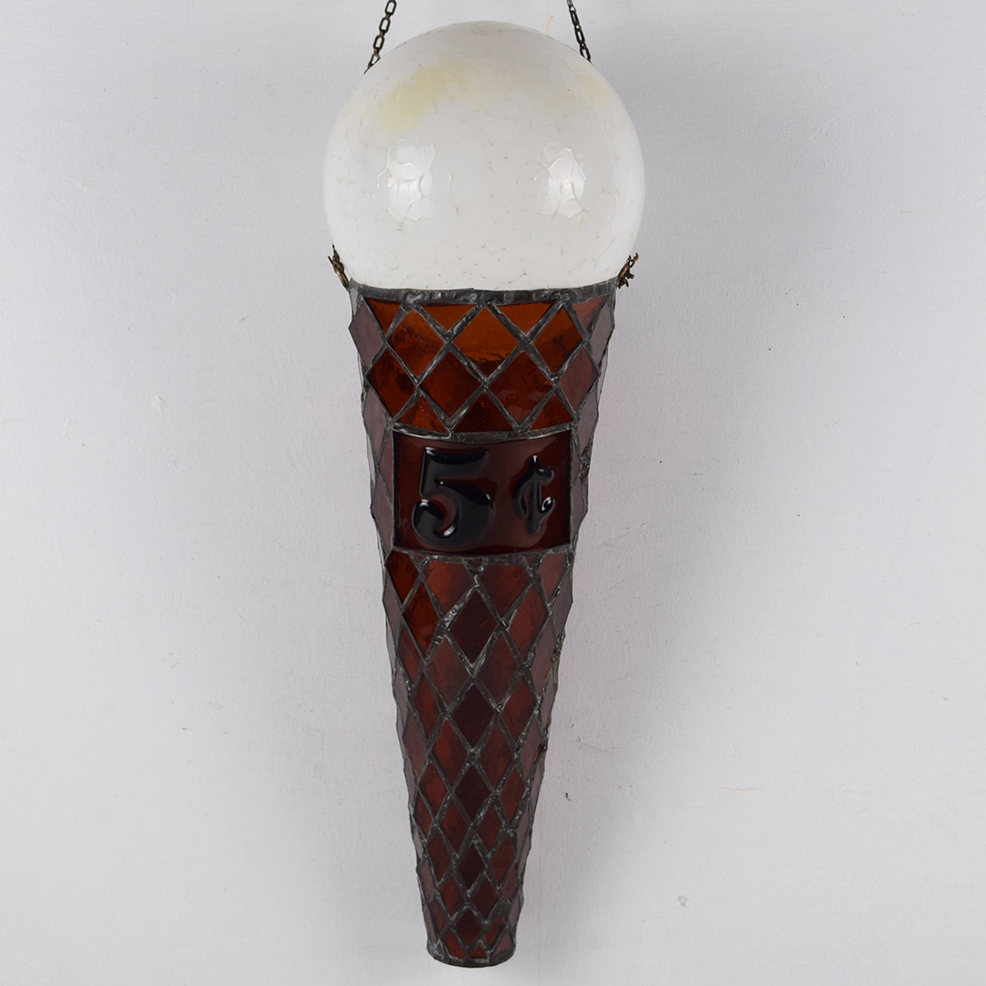 How cool is this stained glass ice cream cone? Better yet, how awesome would it look in your collection or soda fountain setting? The beautiful stained glass cone features a 5¢ rectangle on the front, along with a white dip of vanilla ice cream on top. A chain is attached at the upper edge of the cone, just below the vanilla dip, to allow it to hang freely from the bracket. It is free of chips and cracks, and measures 19.75 inches in length by 7 inches in width. We do not know which company this cone was modeled after, but many ice cream cones were 5¢ up until the mid-1970s. We date this great piece of ice cream history to the 1940s-1950s. 21421-UPP