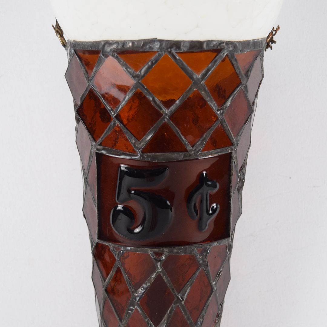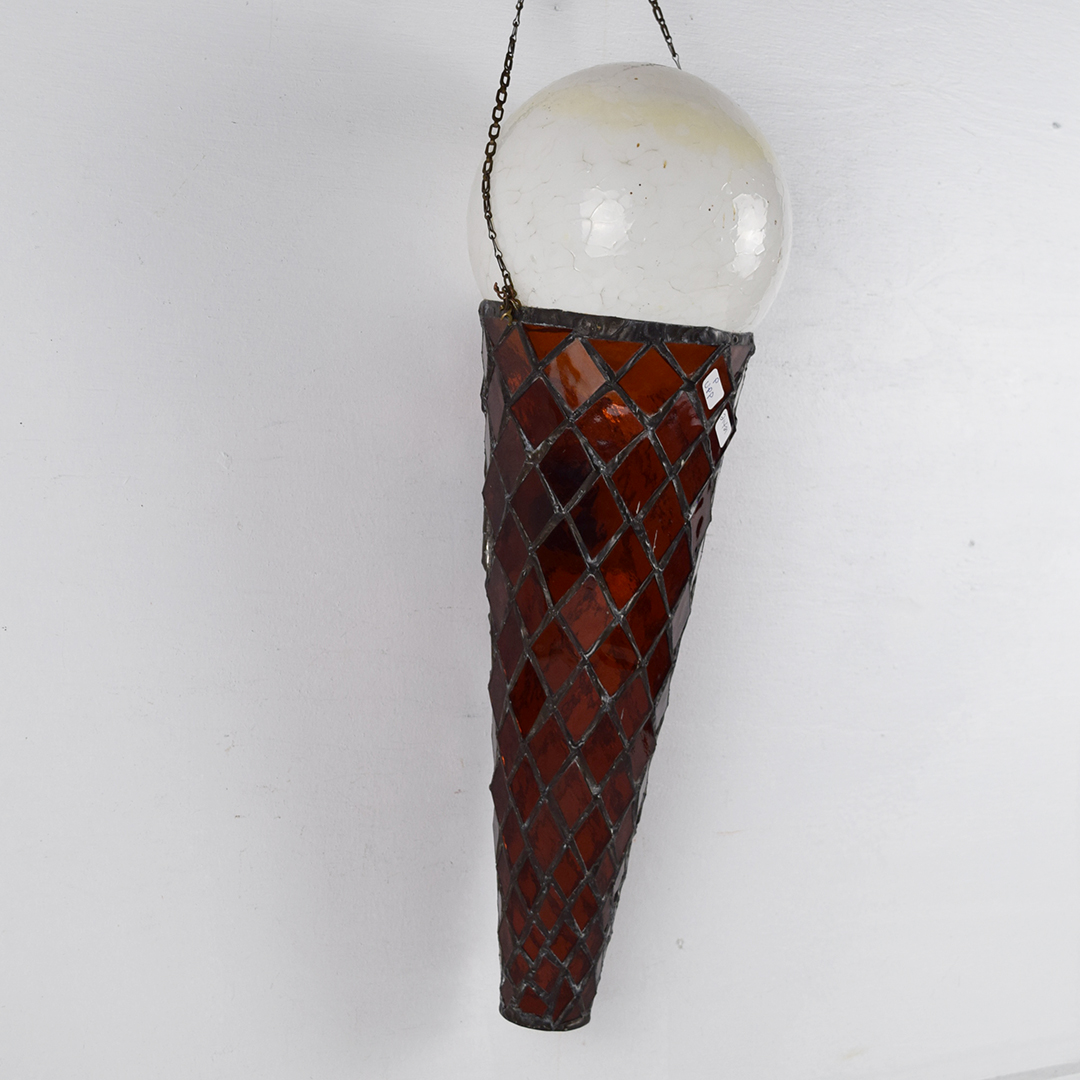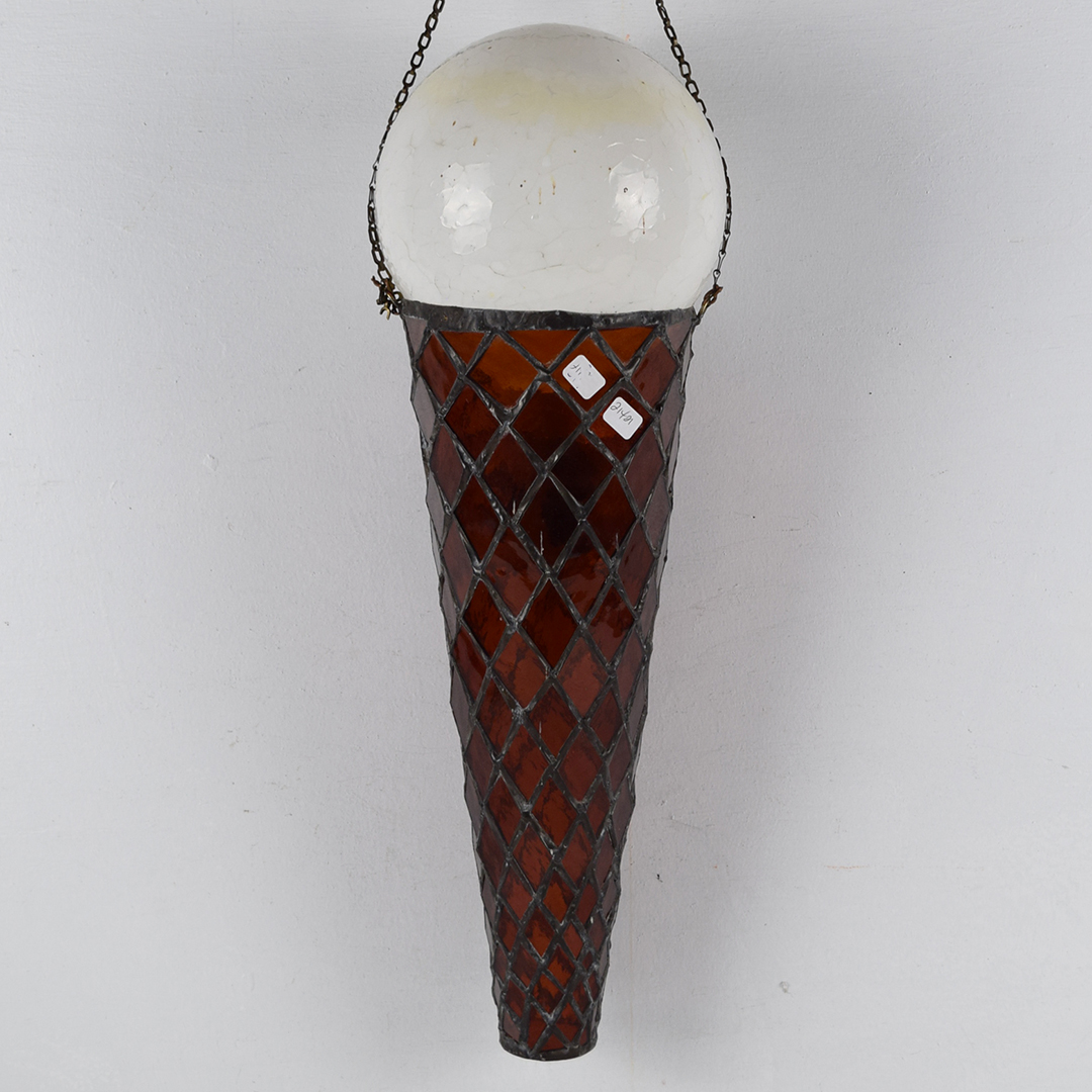 How cool is this stained glass ice cream cone? Better yet, how awesome would it look in your collection or soda fountain setting? The beautiful stained glass cone features a 5¢ rectangle on the front, along with a white dip of vanilla ice cream on top. A chain is attached at the upper edge of the cone, just below the vanilla dip, to allow it to hang freely from the bracket. It is free of chips and cracks, and measures 19.75 inches in length by 7 inches in width. We do not know which company this cone was modeled after, but many ice cream cones were 5¢ up until the mid-1970s. We date this great piece of ice cream history to the 1940s-1950s. 21421-UPP