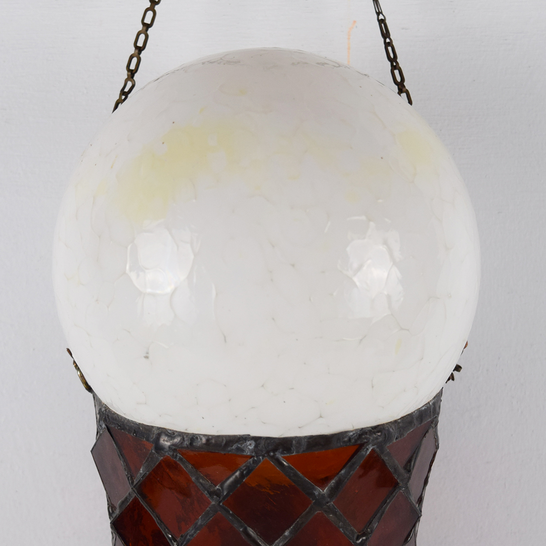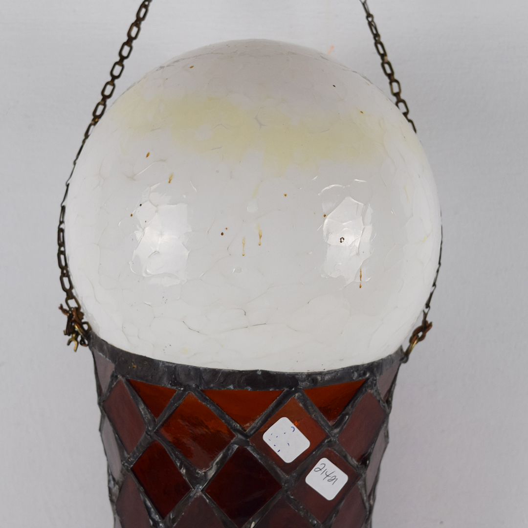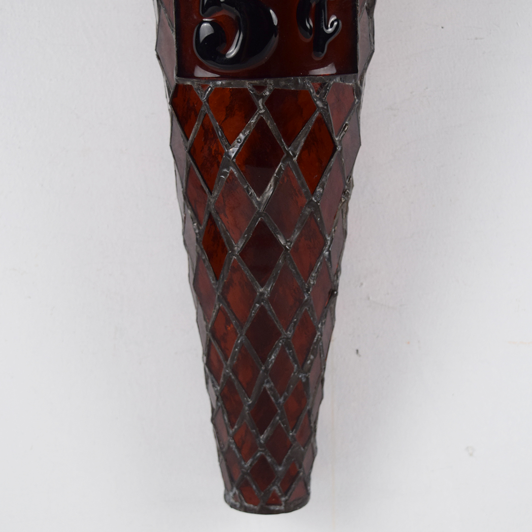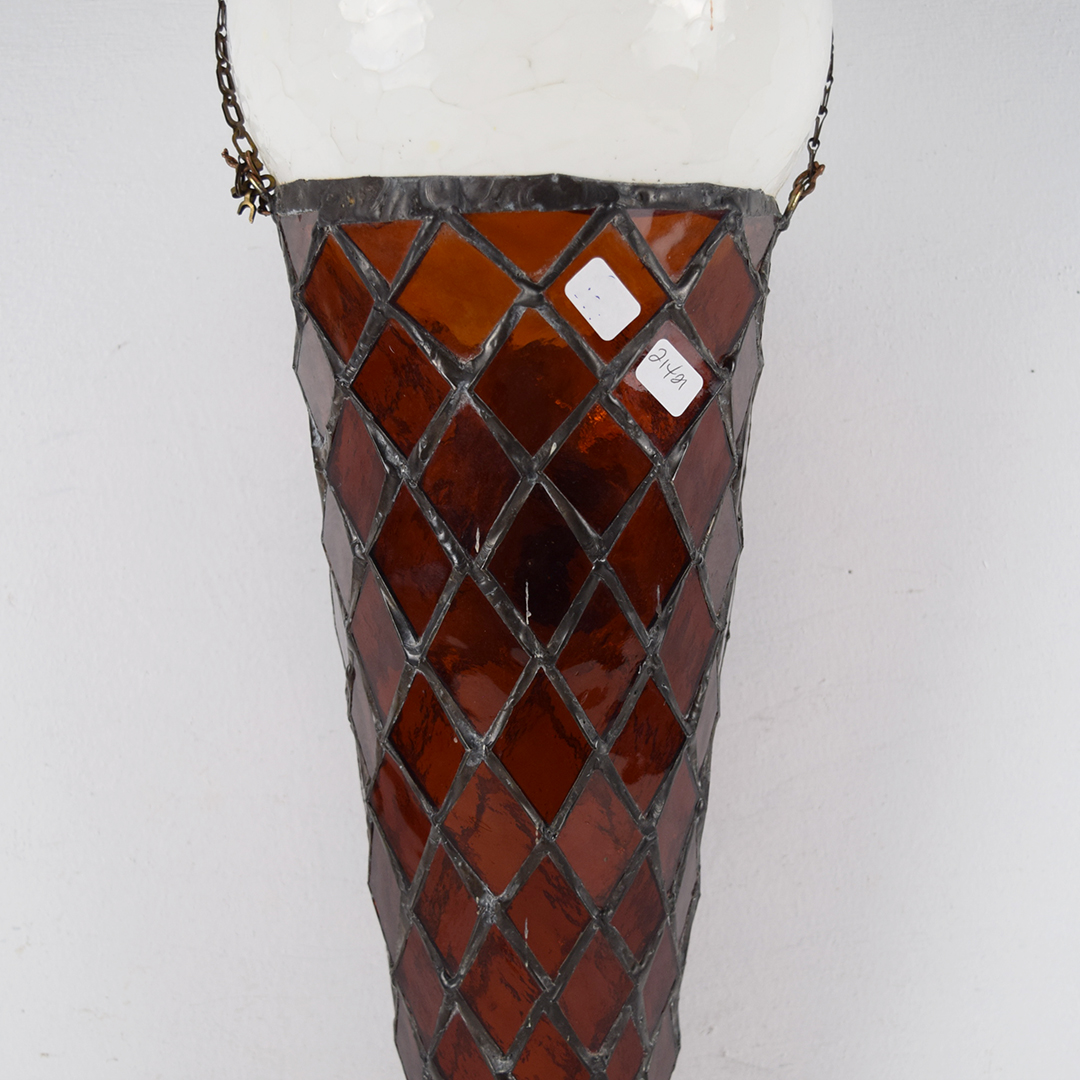 How cool is this stained glass ice cream cone? Better yet, how awesome would it look in your collection or soda fountain setting? The beautiful stained glass cone features a 5¢ rectangle on the front, along with a white dip of vanilla ice cream on top. A chain is attached at the upper edge of the cone, just below the vanilla dip, to allow it to hang freely from the bracket. It is free of chips and cracks, and measures 19.75 inches in length by 7 inches in width. We do not know which company this cone was modeled after, but many ice cream cones were 5¢ up until the mid-1970s. We date this great piece of ice cream history to the 1940s-1950s. 21421-UPP