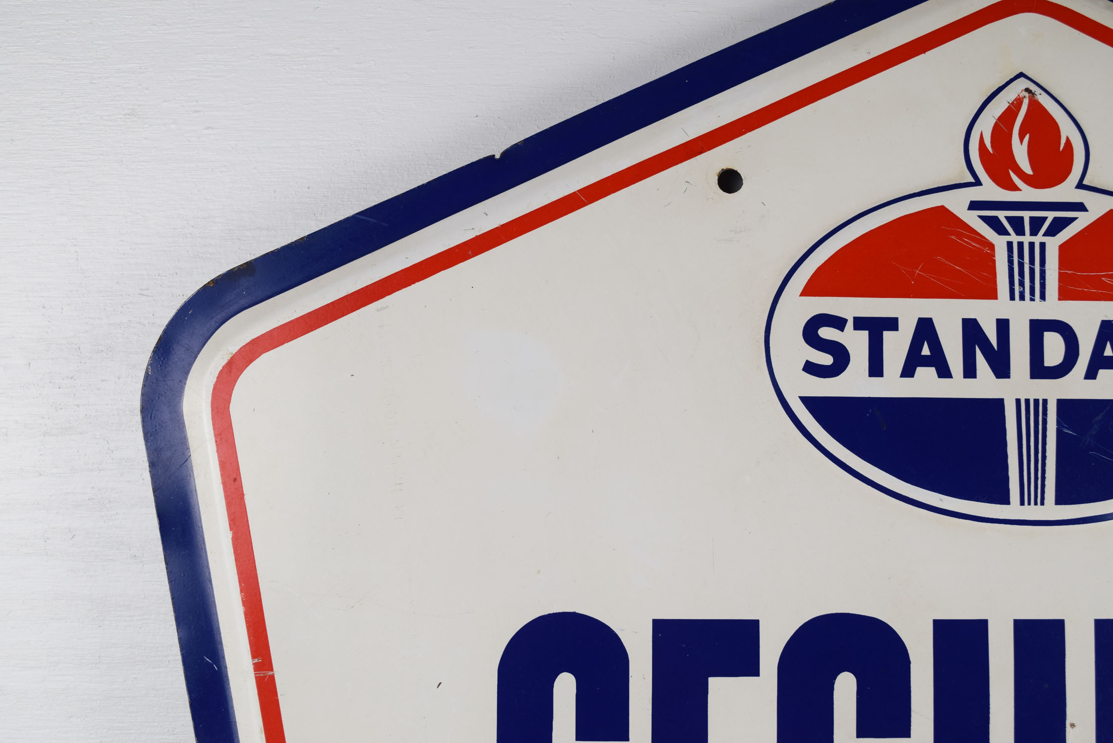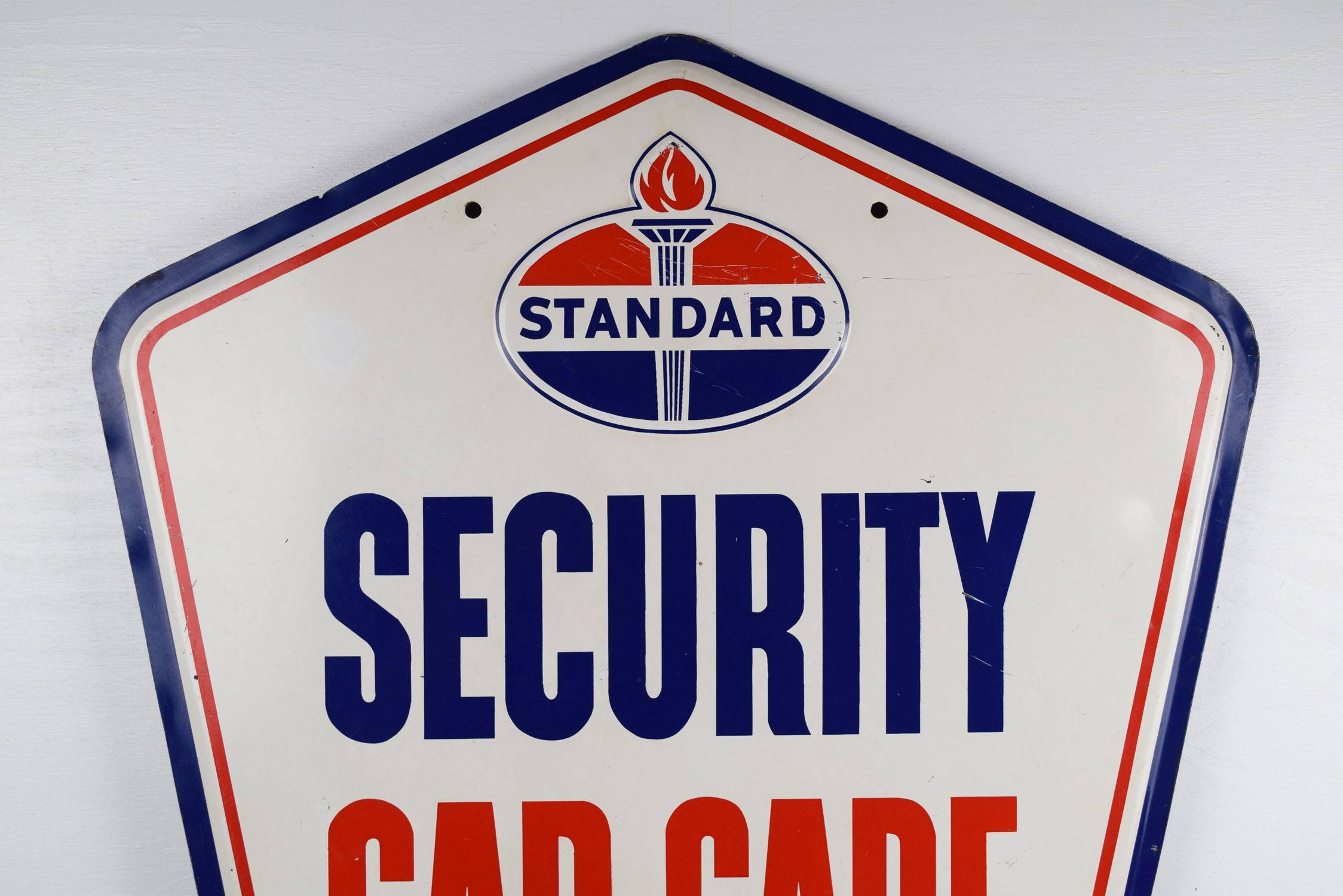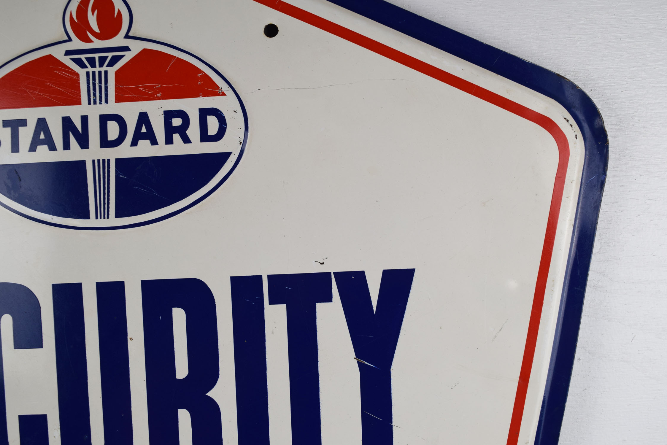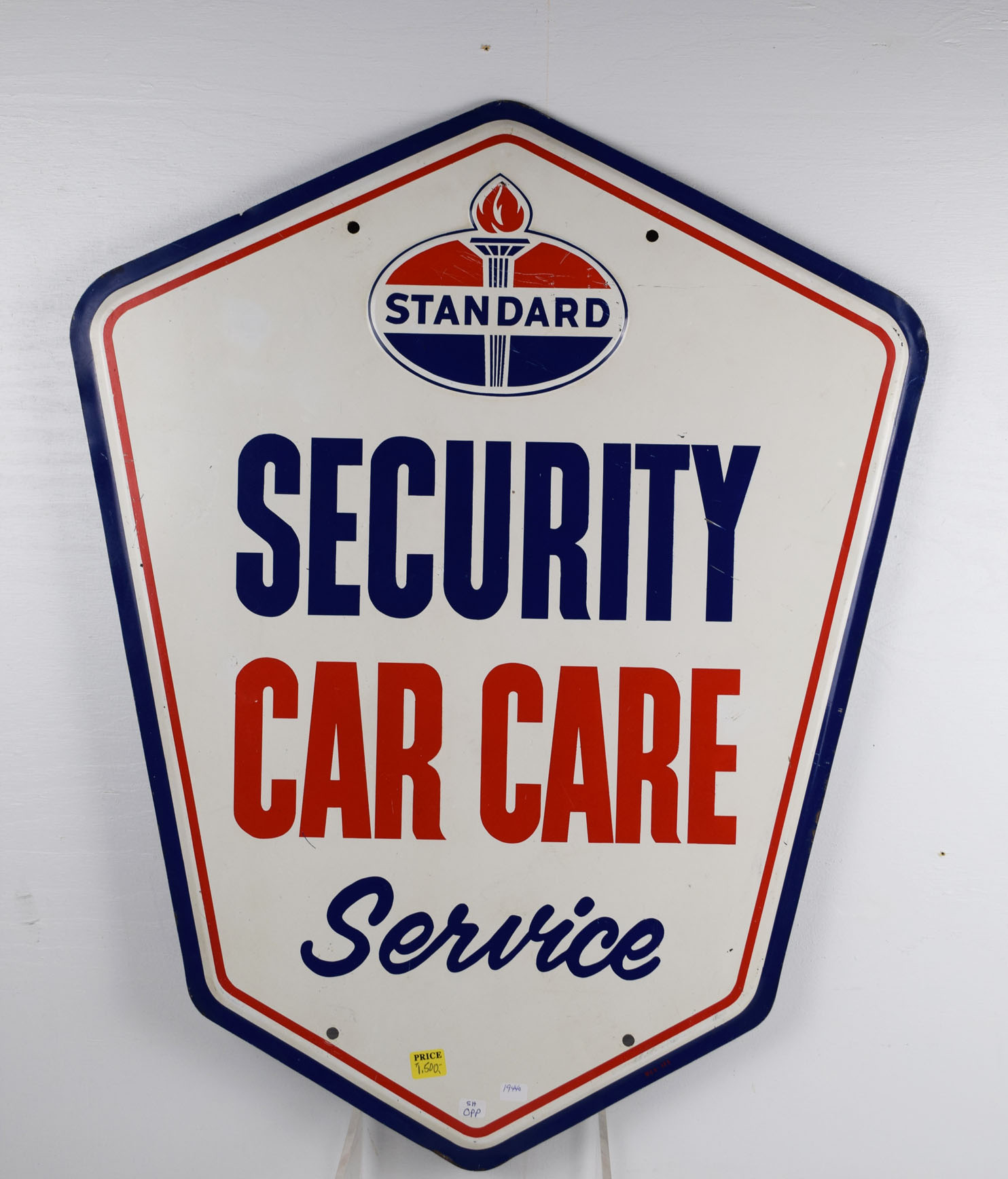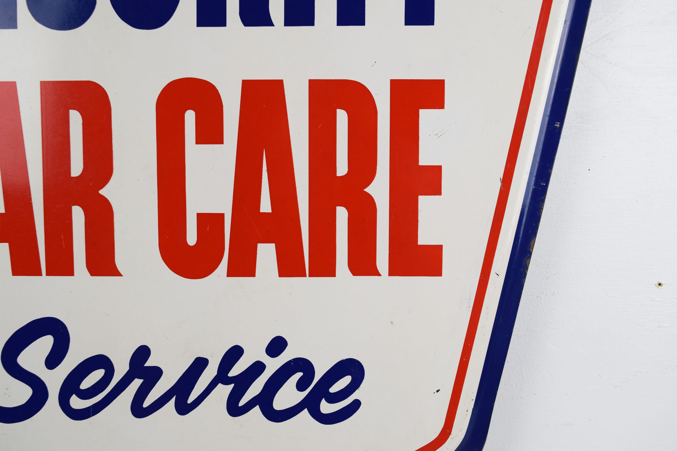 This neat shield shaped self framed metal sign comes to us today from Standard Oil Company, and is letting all their customers know about “Security Car Care Service” in red, white, and blue! It stands twenty-nine inches tall by twenty-three inches wide and has four mounting holes where it would mount to a pole at the service station in the mid 1950’s. The face of the sign has some light scratches, along with some minor chipping along the outer edges. The out reaching corners have a small bend from handling over the years as well. The gloss is great, and the colors really look great on this smaller sign. Make it a point to check this one out! 19440-OPP