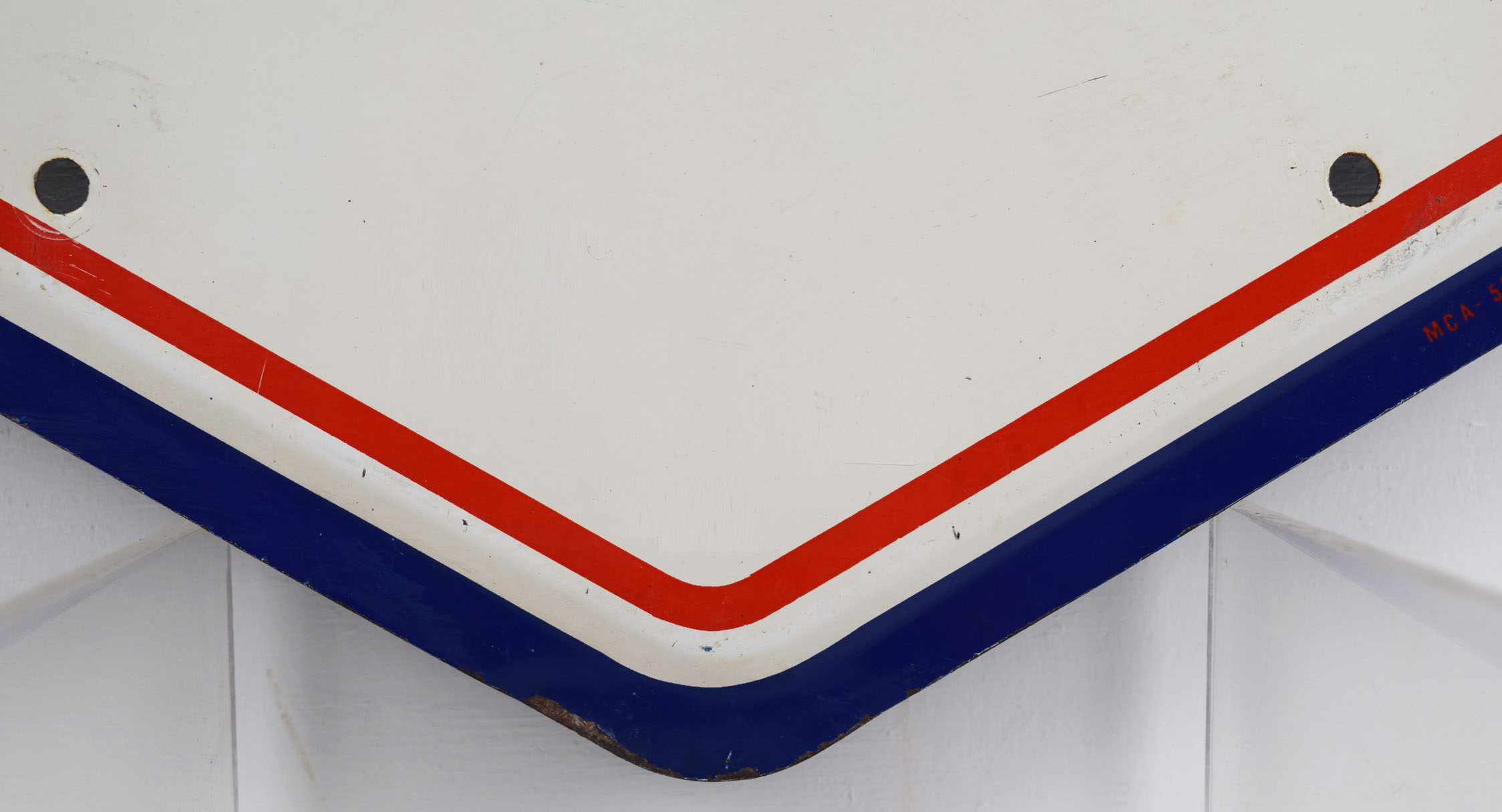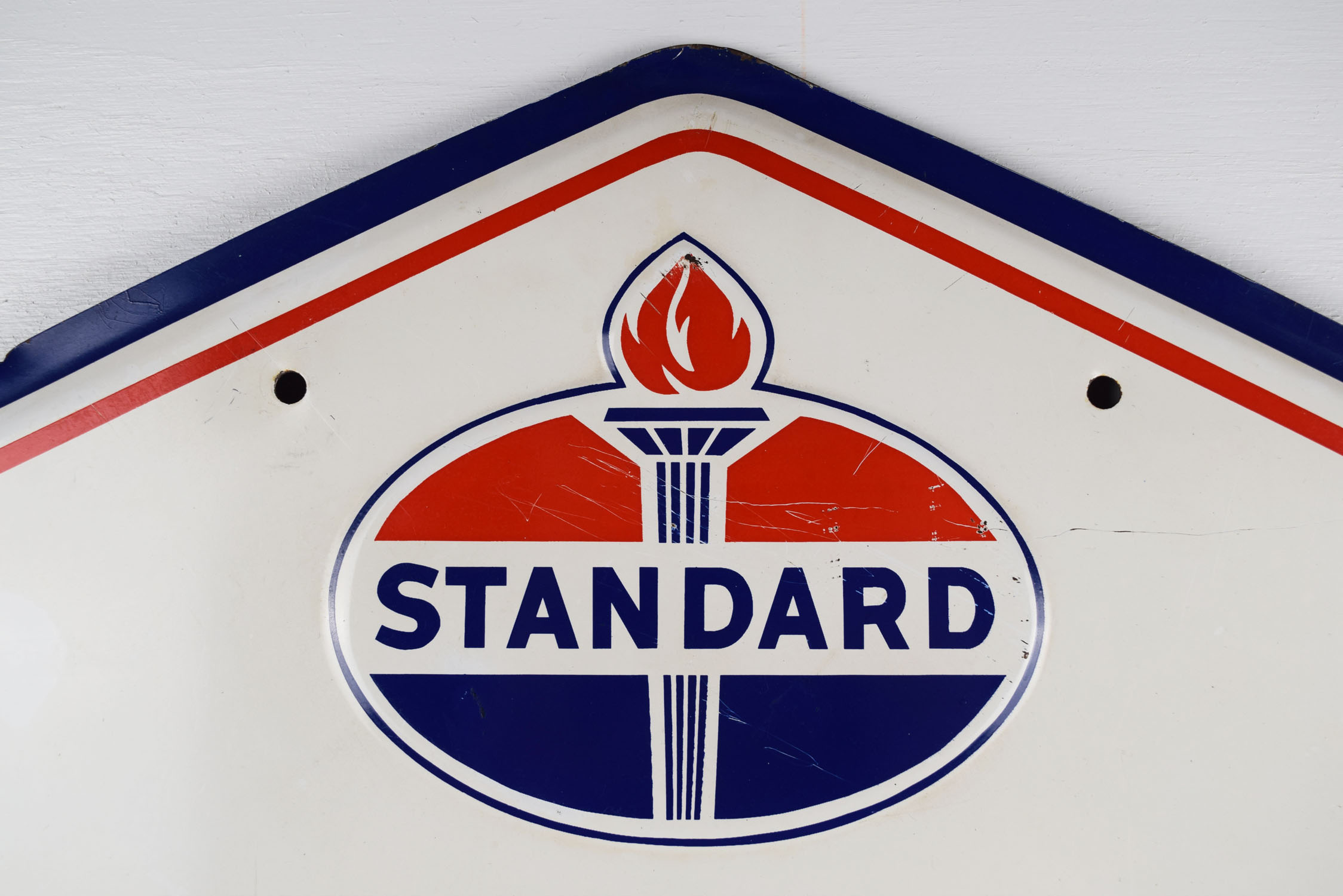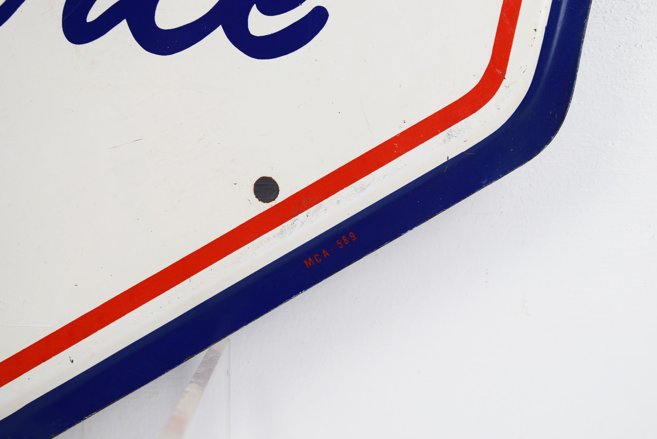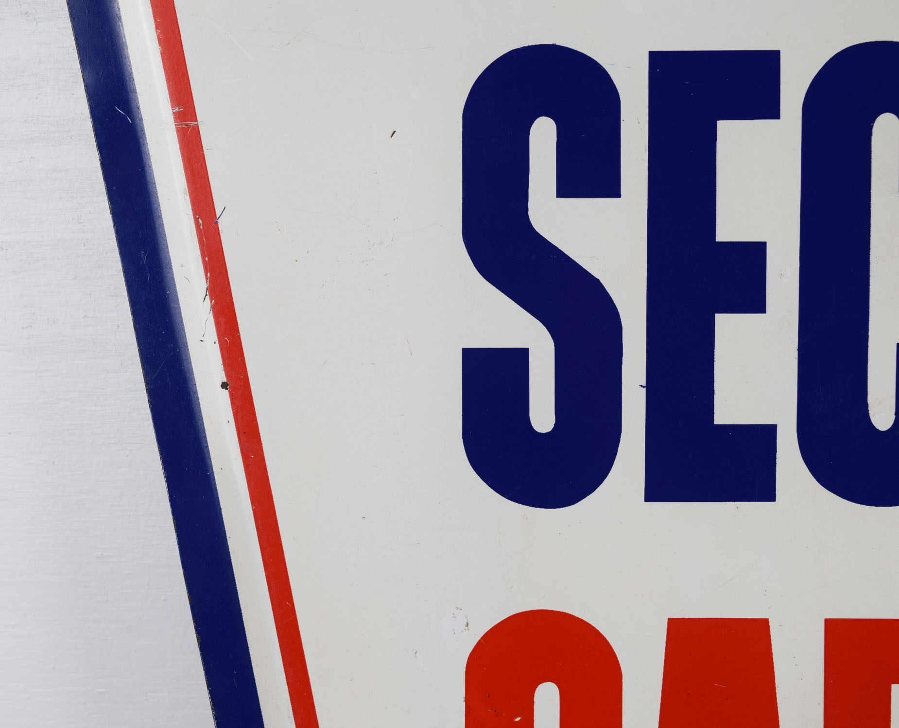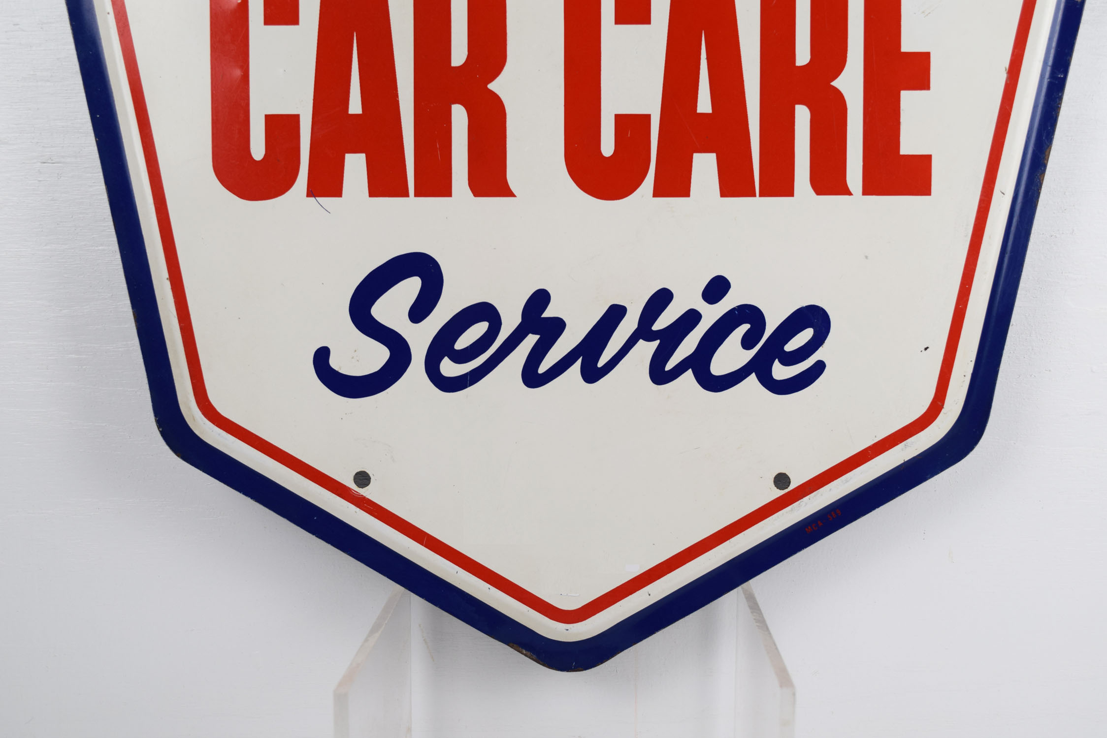 This neat shield shaped self framed metal sign comes to us today from Standard Oil Company, and is letting all their customers know about “Security Car Care Service” in red, white, and blue! It stands twenty-nine inches tall by twenty-three inches wide and has four mounting holes where it would mount to a pole at the service station in the mid 1950’s. The face of the sign has some light scratches, along with some minor chipping along the outer edges. The out reaching corners have a small bend from handling over the years as well. The gloss is great, and the colors really look great on this smaller sign. Make it a point to check this one out! 19440-OPP