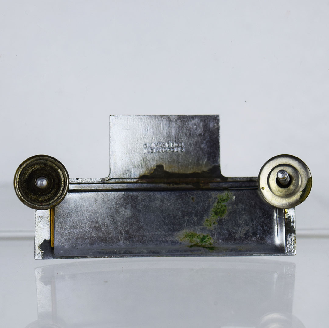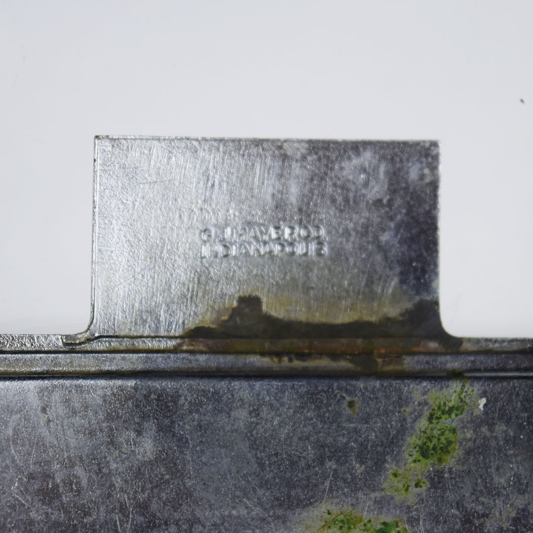 Standard Service issued this hat pin name badge for each employee to wear on their uniform daily. Each employee wrote their name on a small piece of white paper and slid it into this name badge, with a small plastic cover so it did not smear when it got wet. The plastic is no longer in this piece of history, and it has two screwback fasteners to attach nicely to a hat or shirt. The enamel finish on the logo has chips missing from the finish in the lower left corner. We date this piece from the 1930s, and it will look great in your collection. 20827-TP