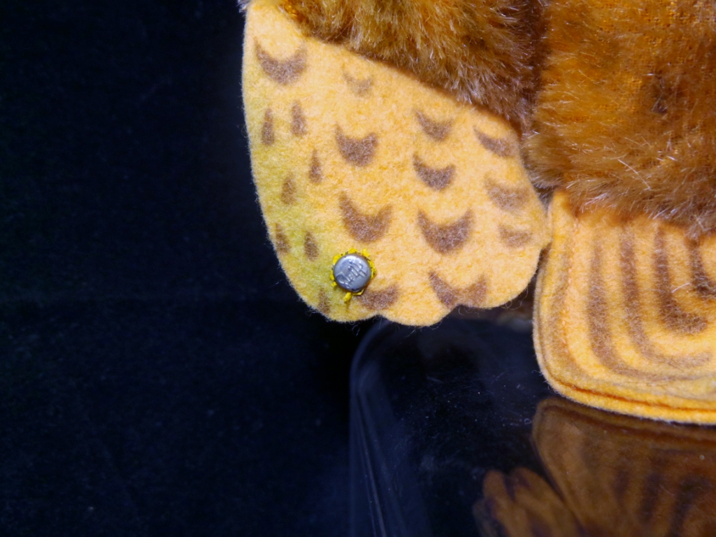 This would be a perfect little fellow for the next television ad. “Wittie” the owl can turn his head a full 360, just like the one in the TV commercial. His body made of mohair and felt with green plastic eyes and a soft rubber beak. Produced by Steiff in the 1950s and 1960s, his feet are reinforced with wire. This example still has the paper tag attached to his front, but the cloth “button” tag on his left wing is missing. He measures about 5 inches tall by 6 inches wide and is in excellent, gently played with condition. 3651-71YT