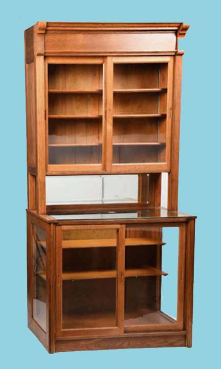 Looking for a nice display case that you can display your collection in without taking up a lot of wall space? This is great oak country store display is a double level case and would look right at home, as it is a perfect size. The beautifully refinished oak wood has a warm feel and features sliding doors on both the top and bottom. The upper part has two sliding doors and three wooden adjustable shelves, and the bottom has glass doors with two large adjustable wooden shelves. The bottom part also has a half glass top which we don’t see too many of. Because of the size (51.25 inches wide) this will fit great in a smaller home or office. The bottom part of the top piece has a full size mirror which is always a nice touch. The measurements are 95 inches tall, 51.25 inches wide, and 24 inches deep. This item will require a 3rd party shipper or pickup. Please contact us for more information. 18825-WPRP