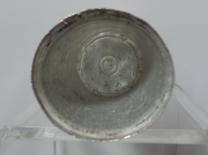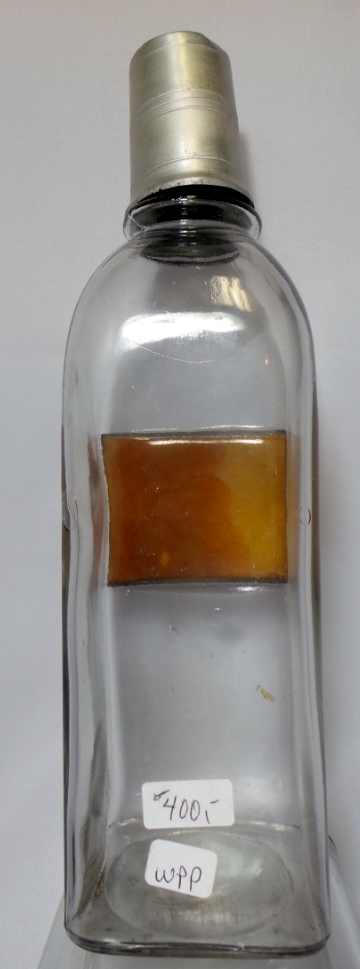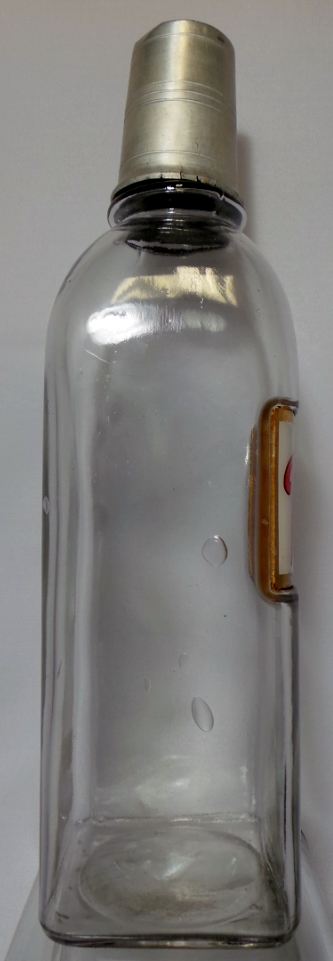 This rare, label under glass bottle dates from the late 19th or early 20th century and would have been found on the back bar of a soda fountain originally. The label, trimmed in gold, is inscribed “Drink Tango-La It Refreshes.” The bottle comes with its original aluminum cap. It measures 10 1/2 inches tall by 3 inches square and is in near mint condition with a tiny amount of staining on the edges of the label. The cap has cracks around the rim and several dents on the bottom. 16938-71WPP
