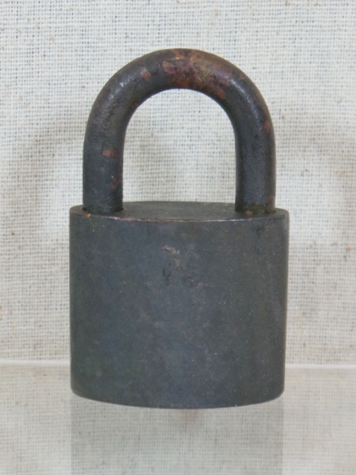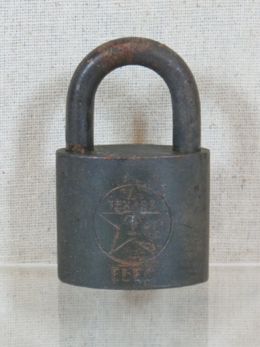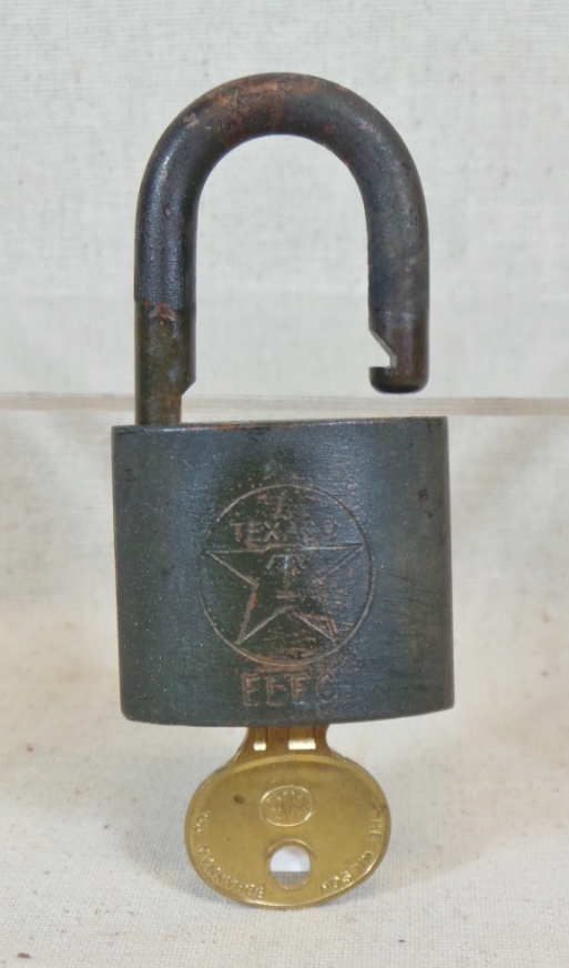 ThisTexaco stamped padlock, with its original key, dates from the 1950s or 1960s and was manufactured by the Wilson Bohannan Company. It has a Texaco Star emblem embossed on one side, with ELEC underneath. These padlocks were used to lock the gas pumps at night. Closed, it measures two and three quarters inches tall by one and three quarters inches wide and is in excellent working condition with a nice patina. 18057-41WT