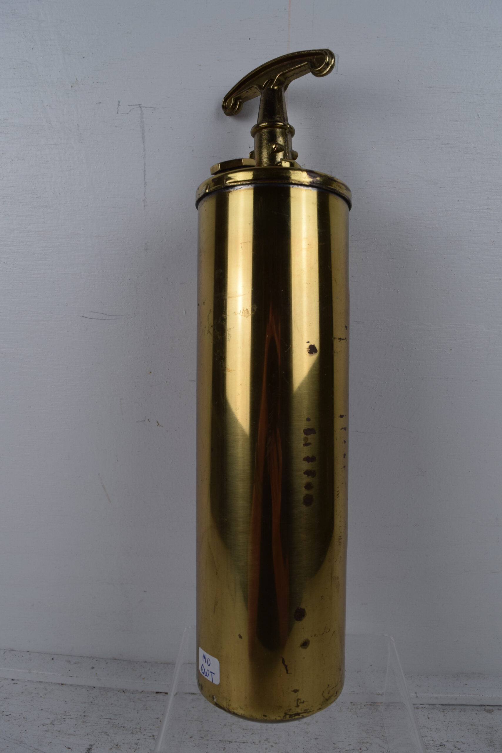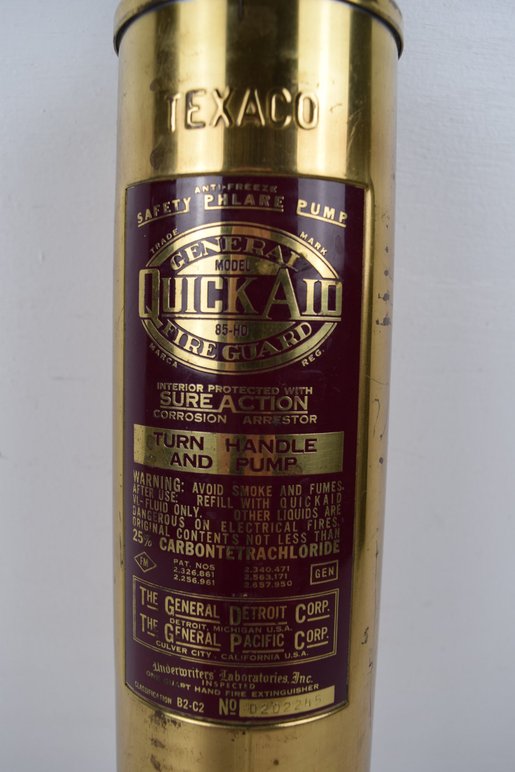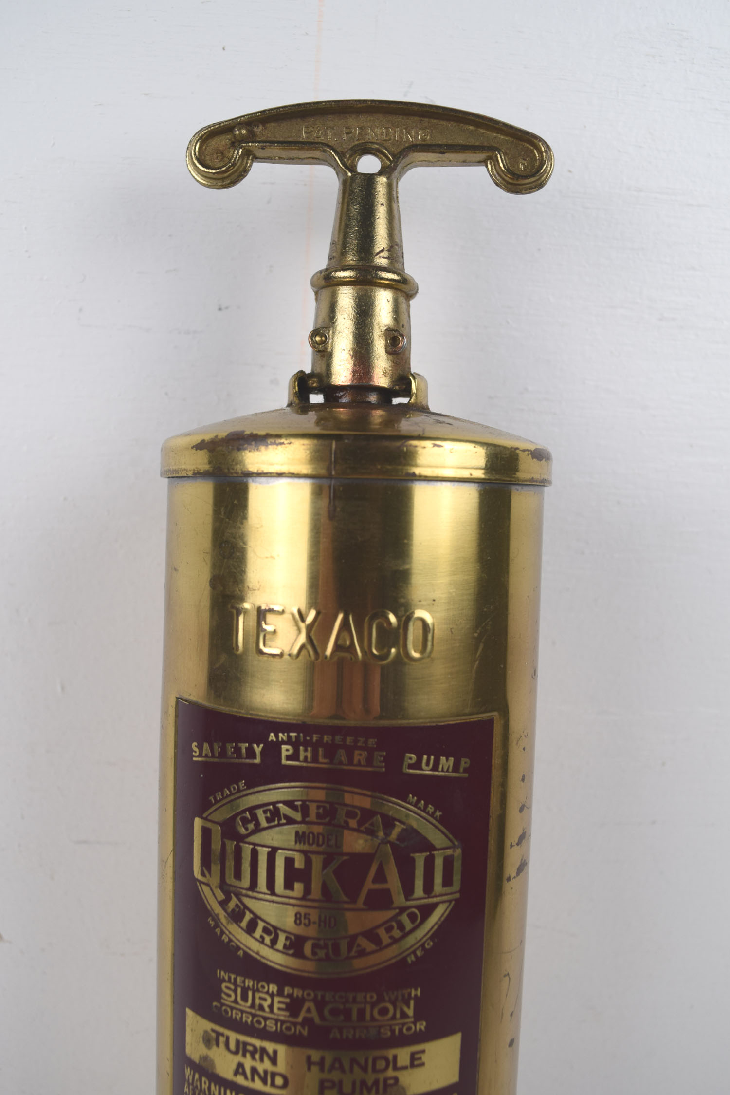 This very neat fire extinguisher is embossed with “Texaco” and has a inlaid label in the brass casing. It is a “General Quick Aid Fire Guard” and used at Texaco stations if needed to extinguish fires. Very simply, you turned the handle and pumped in order to mix the chemicals inside if fire arose. The brass finish on this extinguisher has been polished, and has a great contrast with the black label on the front. A few marks can be seen on the finish from use and storage. 19987-QWT