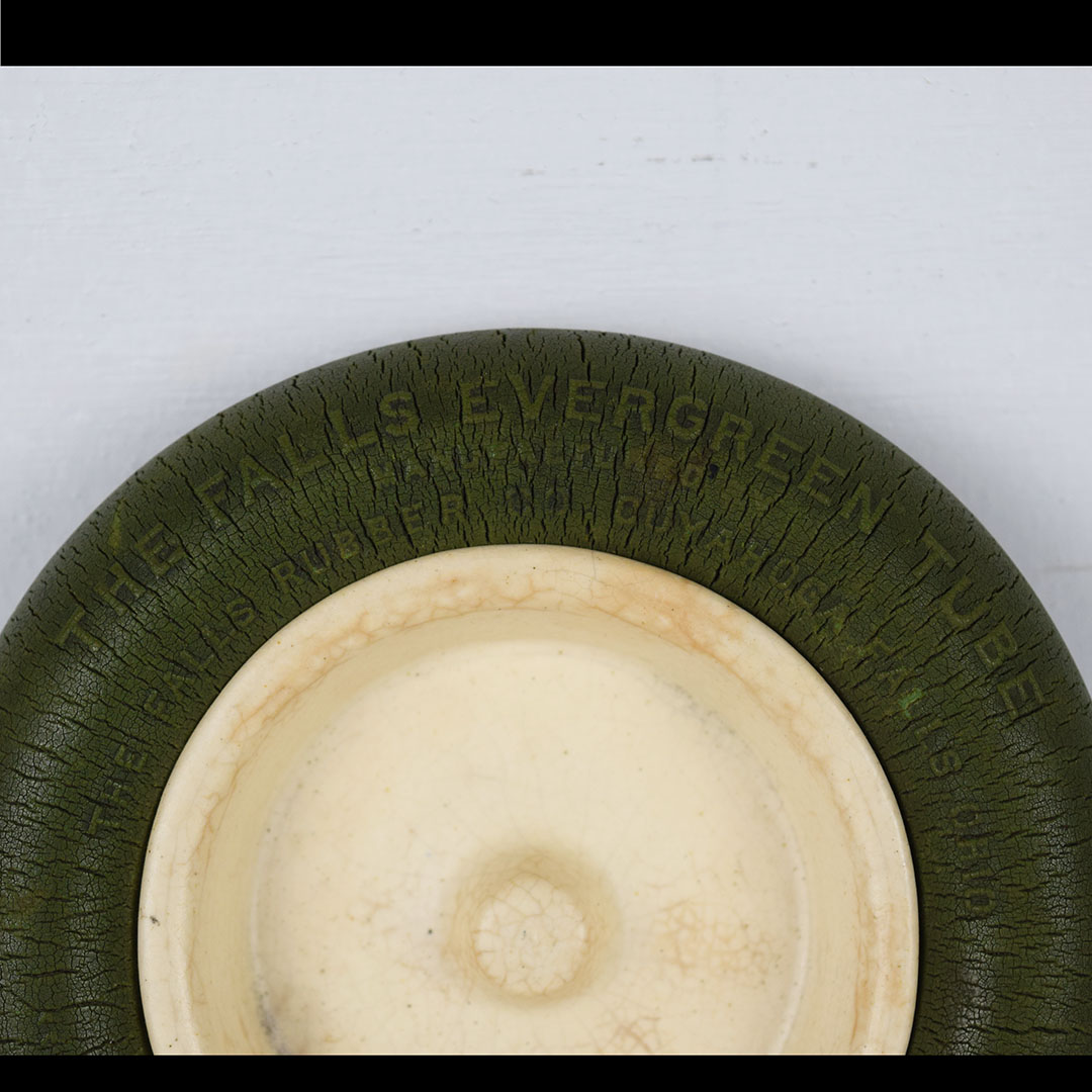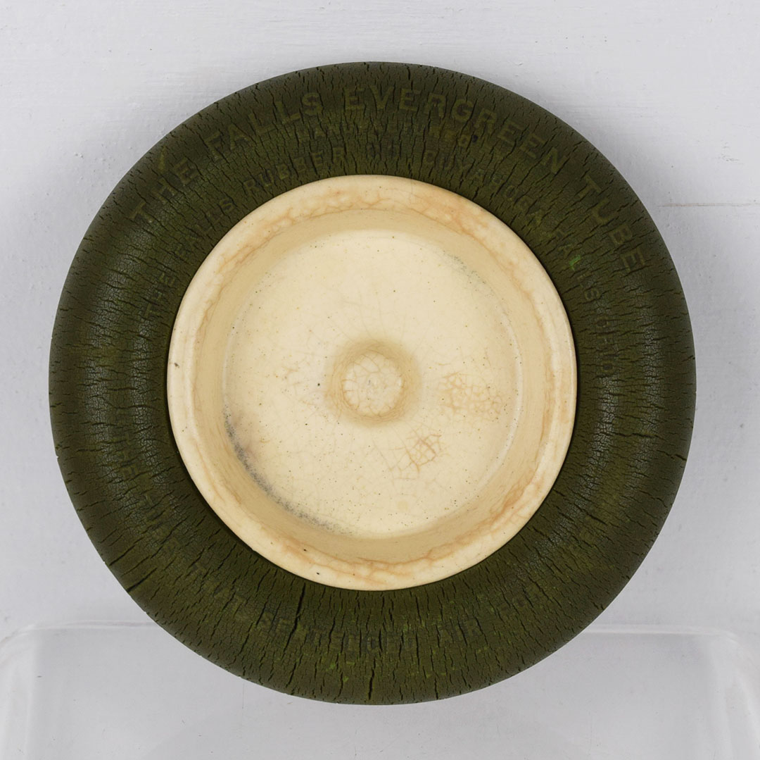This rare Falls Evergreen tire tube ashtray features a green rubber tube around the outer perimeter with a Weller Pottery insert! Designed to be placed at a service station for customers to use as an ashtray, it definitely grabbed your attention and put a Falls Evergreen Tube on your mind when you needed a tube! The slogan at the bottom reads “The Tube That Sentenced Air For Life” in raised letters. Some cracking has occurred in the rubber tube, as it is a century of age, along with some minor internal cracking in the pottery insert. 20576-IP