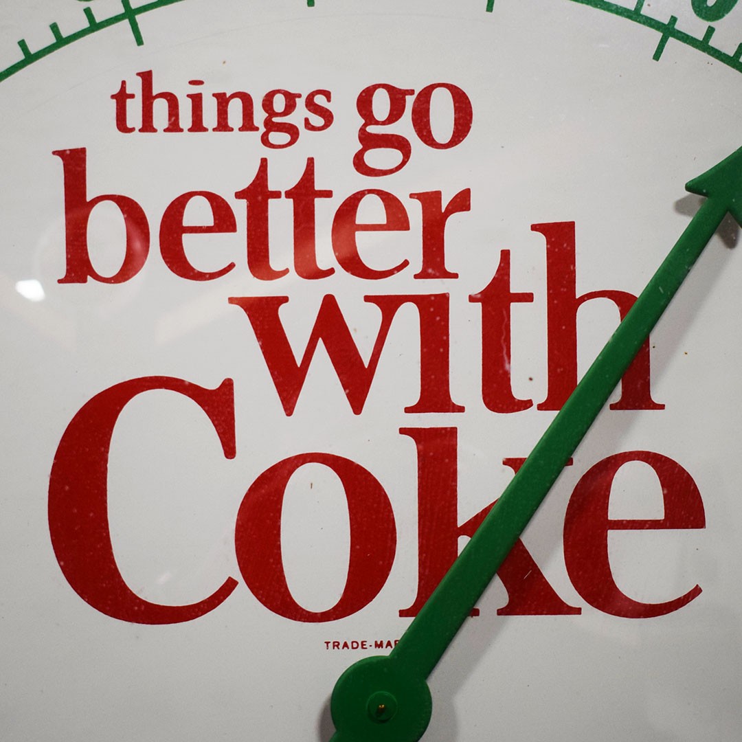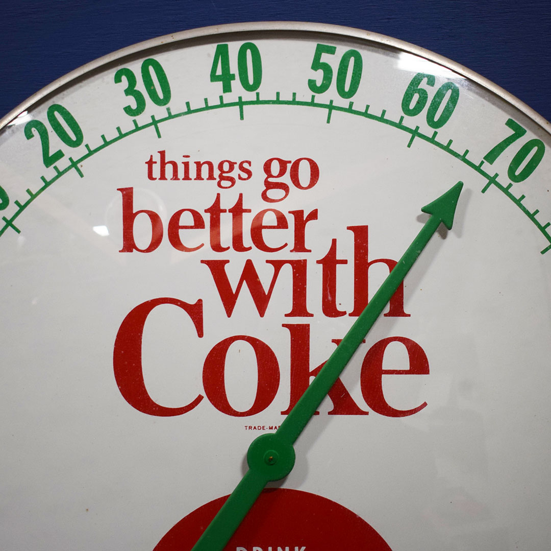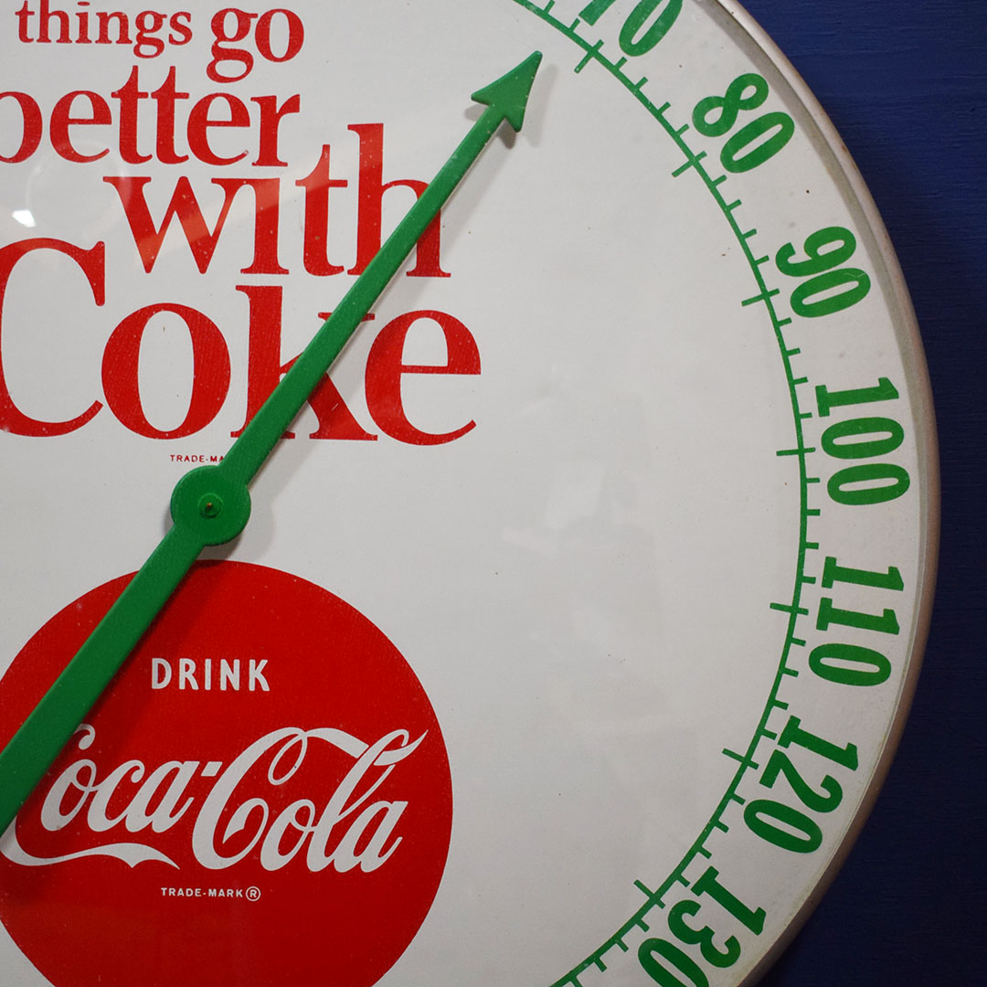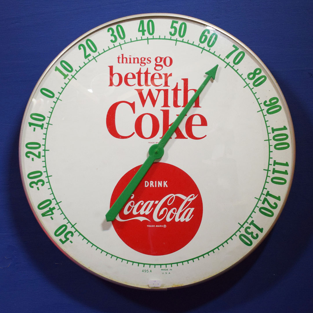 In 1963, Bill Backer penned the jingle “Things Go Better with Coke. ” The company used the slogan everywhere, including signs and thermometers, such as this 18-inch round thermometer. The metal face features this slogan and the iconic red Coca-Cola button below. The aluminum outer edge of this large thermometer and a convex glass lens protects the metal face. The metal trim is in excellent condition, with some minor marks along the bottom edge, but they are barely noticeable. While the 12-inch Coca-Cola thermometers are frequently seen, these 18-inch ones are rare, so don’t miss your chance to add this beauty to your collection! 21164-YYP