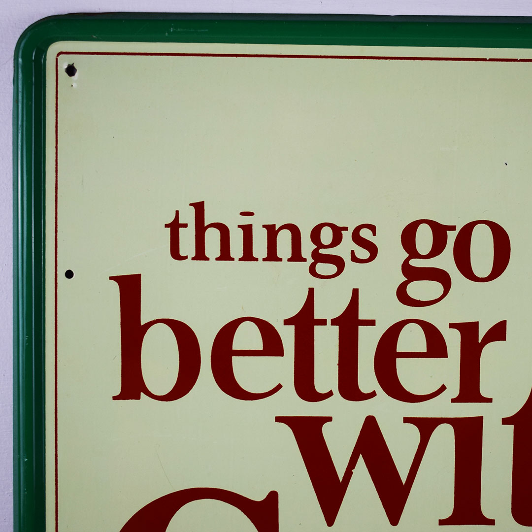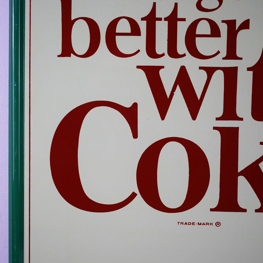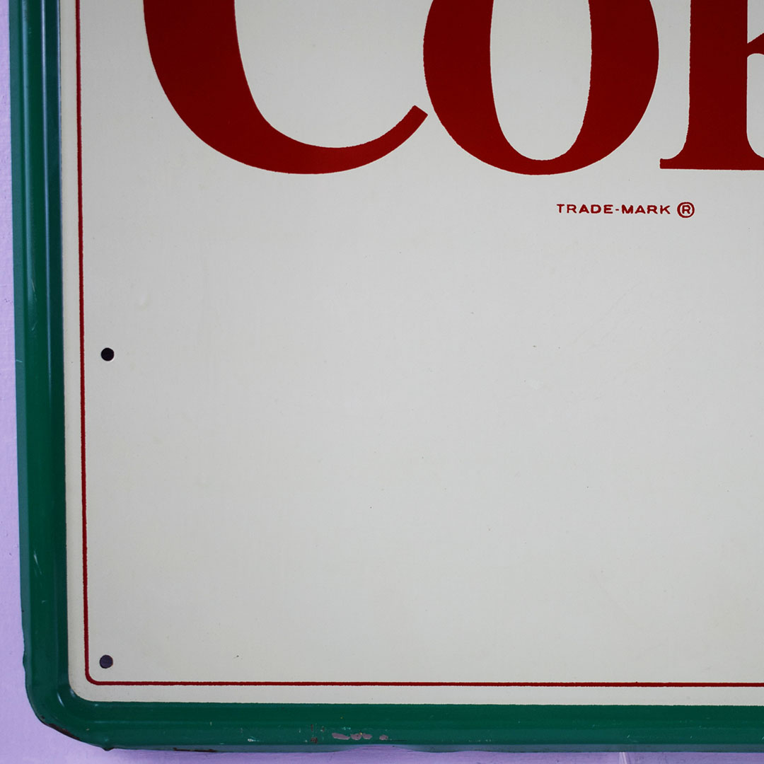 Coca-Cola used the “Things go better with Coke” slogan from 1963 to 1969. The iconic hobble skirt bottle is featured on one side. The outer edge is self-framed, allowing it to frame itself on the wall. It measures 23.5 inches square and is marked “Robertson 746” along the right side bottom frame. The green outer frame has chips with paint loss in some places. The center field looks sharp with a lovely gloss finish and superb graphics. In the center of the sign, an eyebrow-shaped dent is evident under close inspection. It becomes invisible once it is hung on the wall a few feet away. This 60-year-old sign is excellent for the price and will fit nicely in your collection. 21268-EIT