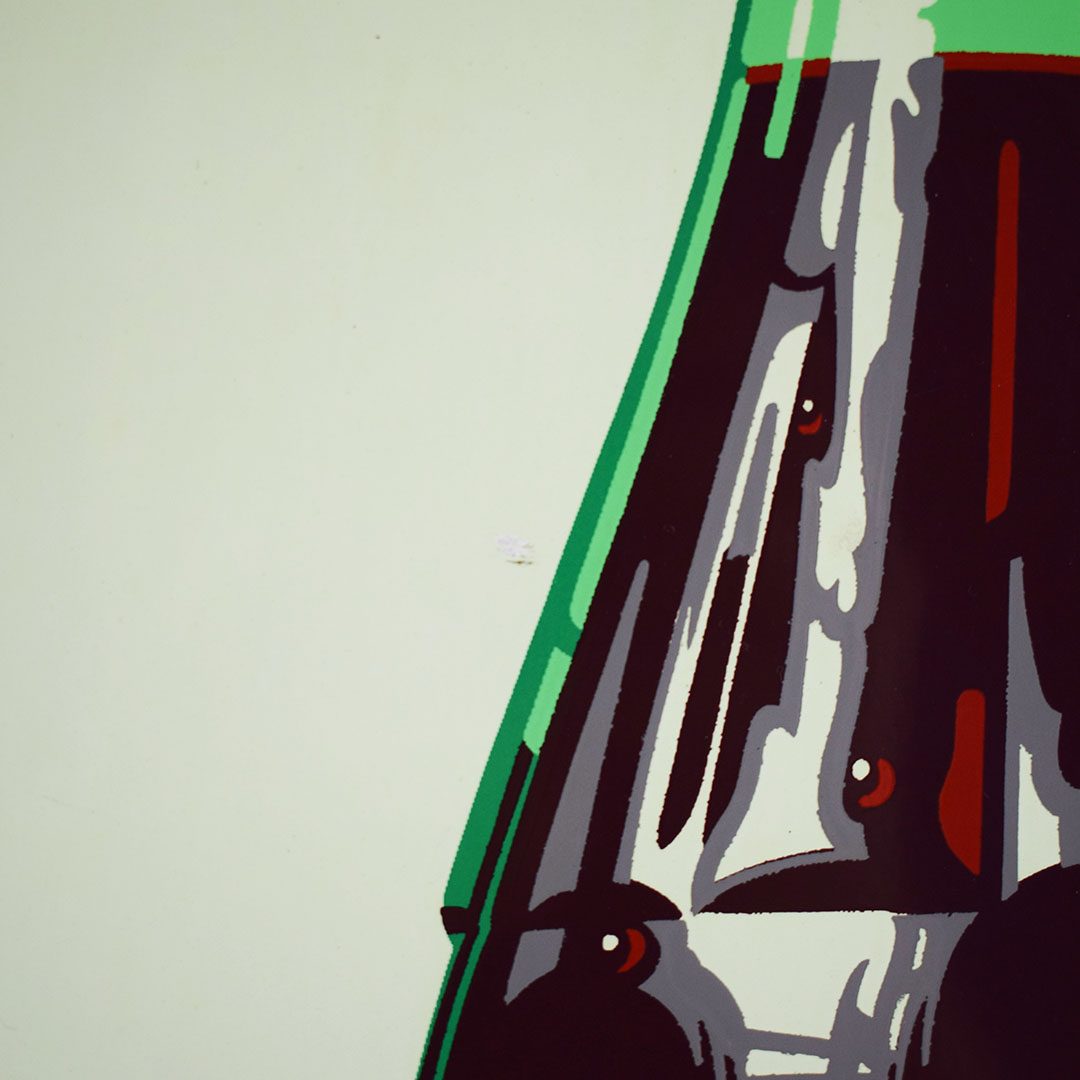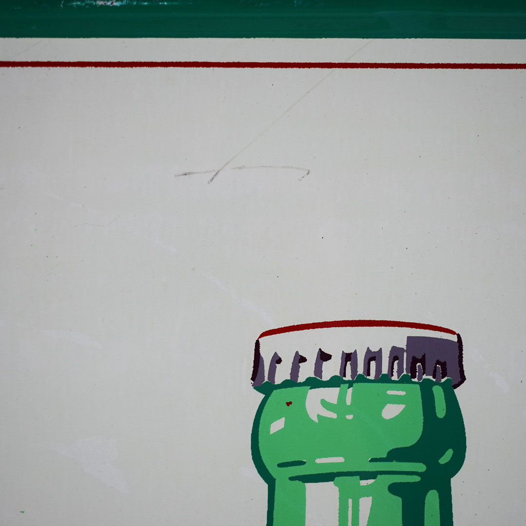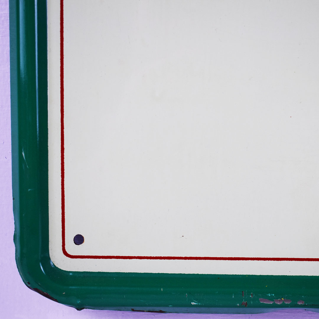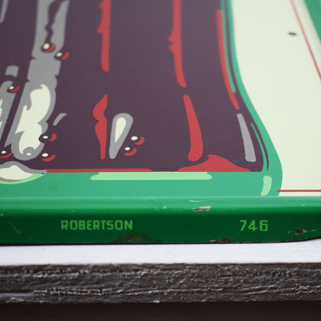 Coca-Cola used the “Things go better with Coke” slogan from 1963 to 1969. The iconic hobble skirt bottle is featured on one side. The outer edge is self-framed, allowing it to frame itself on the wall. It measures 23.5 inches square and is marked “Robertson 746” along the right side bottom frame. The green outer frame has chips with paint loss in some places. The center field looks sharp with a lovely gloss finish and superb graphics. In the center of the sign, an eyebrow-shaped dent is evident under close inspection. It becomes invisible once it is hung on the wall a few feet away. This 60-year-old sign is excellent for the price and will fit nicely in your collection. 21268-EIT