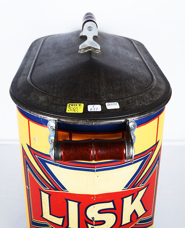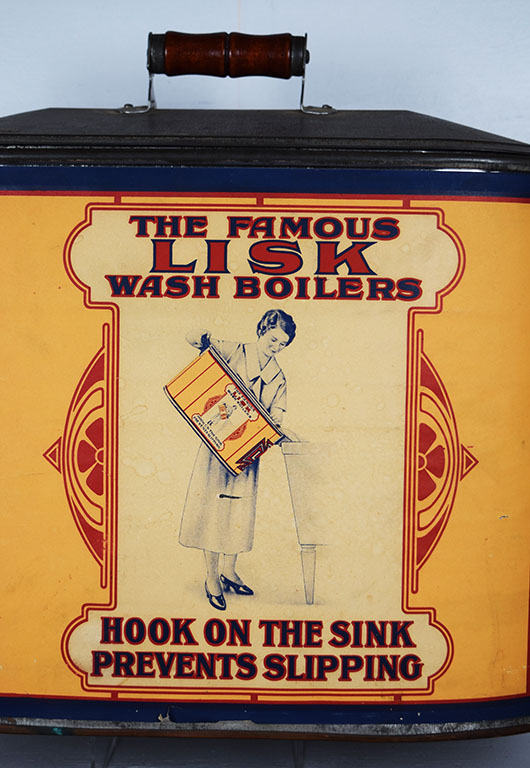 Perfect to display in your laundry room, this new old stock Lisk Wash Boiler has the original paper label that covers the entire exterior sides of the boiler. These tubs were used to heat water for washing clothes, and the Lisk boiler featured a special handle that allowed the tub to hook onto the sink to prevent slipping. What makes this one so special is that it still has the original paper label complete with color graphics and easy to follow picture instructions. Some tears and wear can be seen on the label from storage with some small paper loss. This tub was produced by Lisk Manufacturing Company located in Canandaigua, New York. It is complete with the original lid as well. 20534-ETP