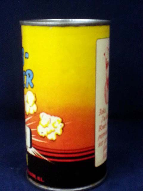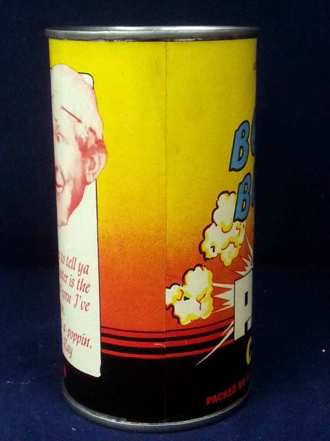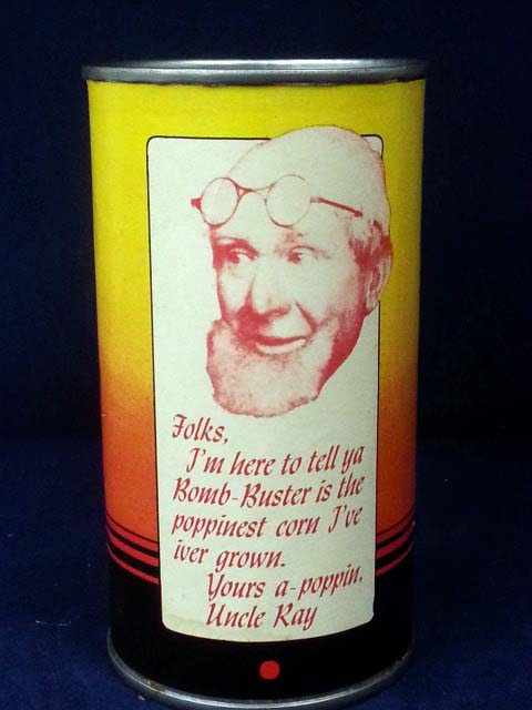 This clean new old stock tin dates from the 1950’s and holds ten ounces of popcorn. It has a colorful paper label with an image of a crashing bomb and the inscription “Bomb – Buster Giant Golden Pop Corn” on the front and a note from “Uncle Ray” on the back. The tin measures about five inches tall by two and a half inches in diameter and is in excellent condition with a light water stain and a quarter inch tear in the label. 9926-51YP
