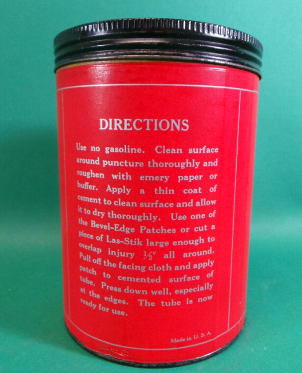 This complete new old stock inner tube repair kit dates from the 1940’s or 1950’s and was manufactured by Las-Stik MFG. Company in Hamilton, OH. Las-Stik is still in business, producing automotive finish cleaning products and waxes. The container has a black tin bottom and lid and red cardboard sides. It is inscribed “Las-Stik Small Size Bevel – Edge Garage Kit No. BEK-13.” The directions are on the back. Inside is a bottle of contact cement and about one hundred small patches, plus a couple of large sheets of rubber. The container measures about five and a quarter inches tall by three and three quarters inches wide and is in excellent condition with a small amount of silverfish damage on the label. This large size kit was meant for professionals at filling stations, garages, and tire shops. 15091-51WP