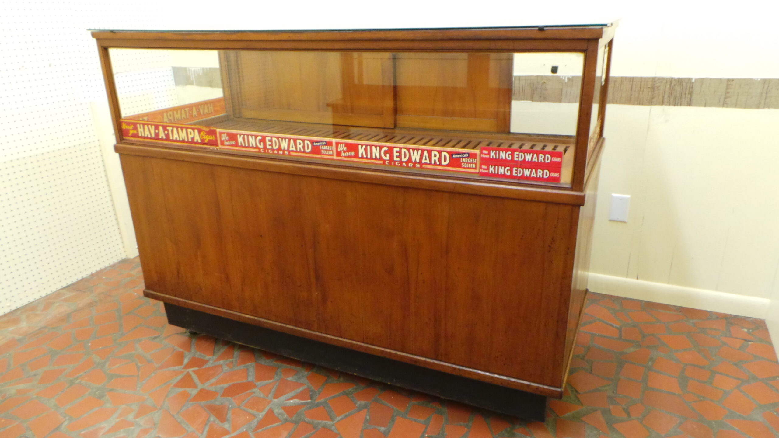 This nice sized circa 1920 to1930 floor case/counter is made of maple veneered plywood and has a glass top and upper display area. It measures 44.5 inches tall by 60 inches wide by 24 inches deep with a pair of upper sliding doors to access the display and a pair of lower sliding door shelves to access the storage area. It is a tobacco cigar cabinet with slatted bottom for the tobacco to breathe. There are also Hav-A-Tampa and King Edward cigar decals on the glass panels. It is in excellent condition with its original finish. The top glass has been replaced. It has casters mounted currently so that it can be moved easily. This is for pickup or we can get a quote from U-Ship 8586-31EYP