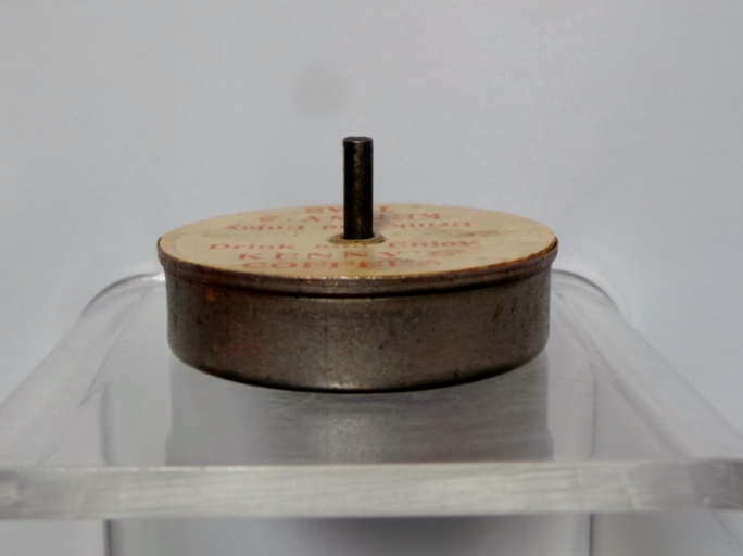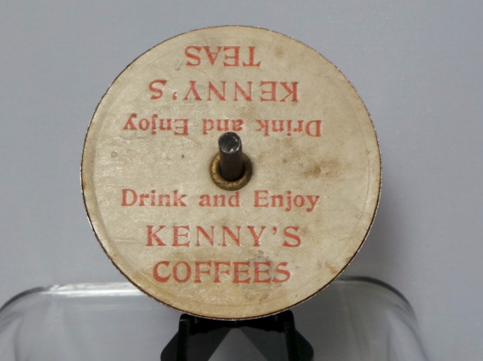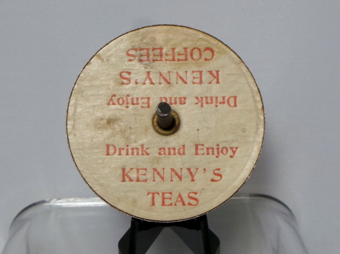 Dating from the late 19th century, this little spinner toy was a free premium, given to customers of the C. D. Kenny Company, a Baltimore, MD. grocer. It consists of a round steel base with a cardboard cover inscribed “Drink and Enjoy Kenny’s Teas Drink and Enjoy Kenny’s Coffees.” A weighted iron “spinner” protrudes out of the center. Just give it a twist and see how long it will spin. The toy measures about 2 1/4 inches in diameter by 1 1/4 inches tall and is in excellent condition with some wear and staining on the cardboard cover. Came from my personal collection. 3729-UT