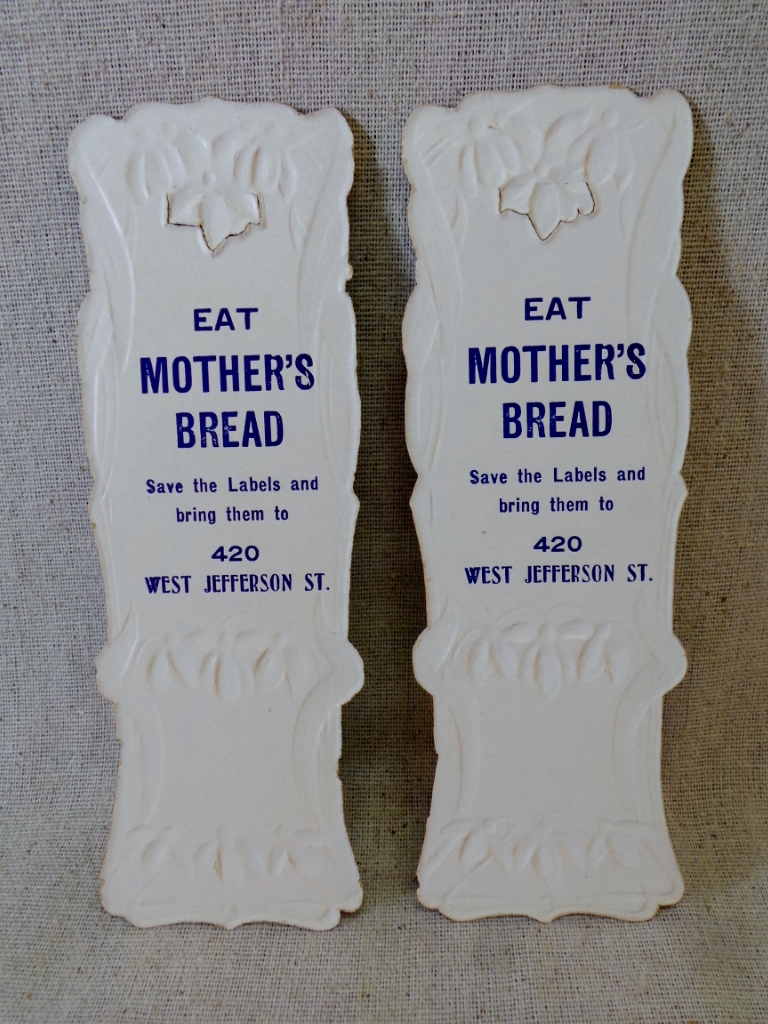 This pair of embossed die-cut cardboard art nouveau-style bookmarks is decorated with images of pretty young ladies dressed in traditional garb, framed in garlands of lilies on the front. The backs are inscribed, “Eat Mother’s Bread Save the Labels and bring them to 420 West Jefferson St.” Mother’s Bread was baked in Philadelphia. The bookmarks measure 6 inches tall by 2 inches wide and in near-mint condition. The price is for the pair. 3799-71RP