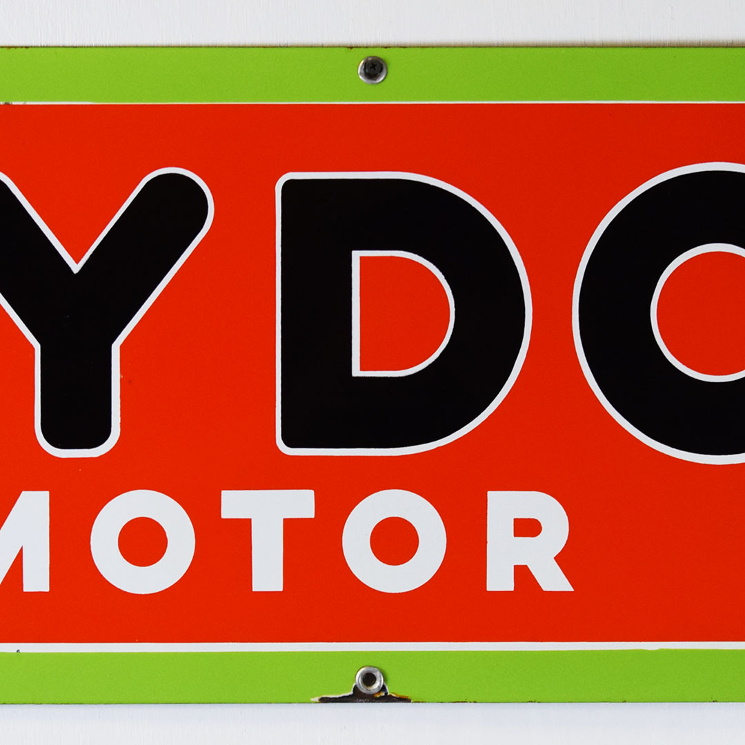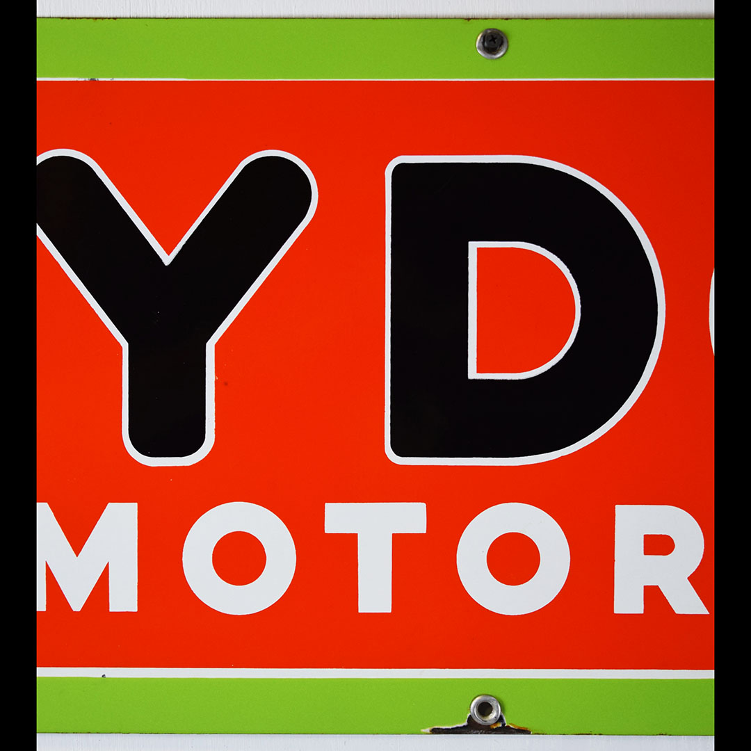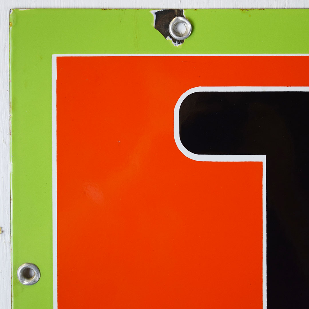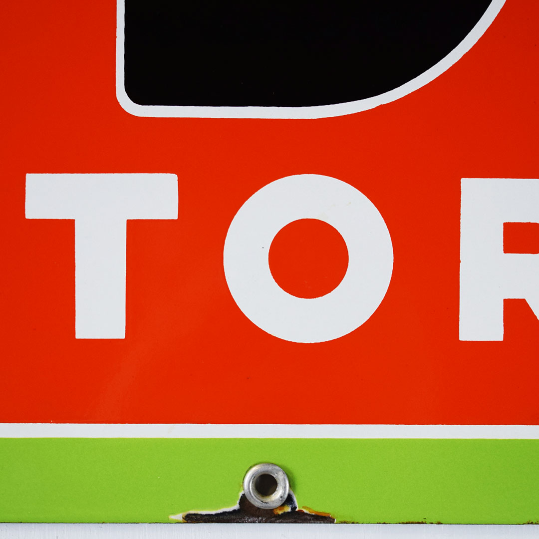 Whew! This Tydol Motor Oil sign is beautiful: knock your socks off! Measuring 42 inches long by 14 inches tall, the porcelain finish is as glossy as day one, and the colors pop off the finish. It is as original as possible, with all eight original aluminum grommets around the outer edge. The top and bottom edges have a few chips with porcelain loss and a small chip on the right outer edge. The field of the sign is sharp and free of chips—no touch-ups on this beauty either. What you see is what you get, no excuses! These signs don’t appear for sale often, so don’t miss your chance on this fantastic Tydol Motor Oil sign! 21130-WOPP