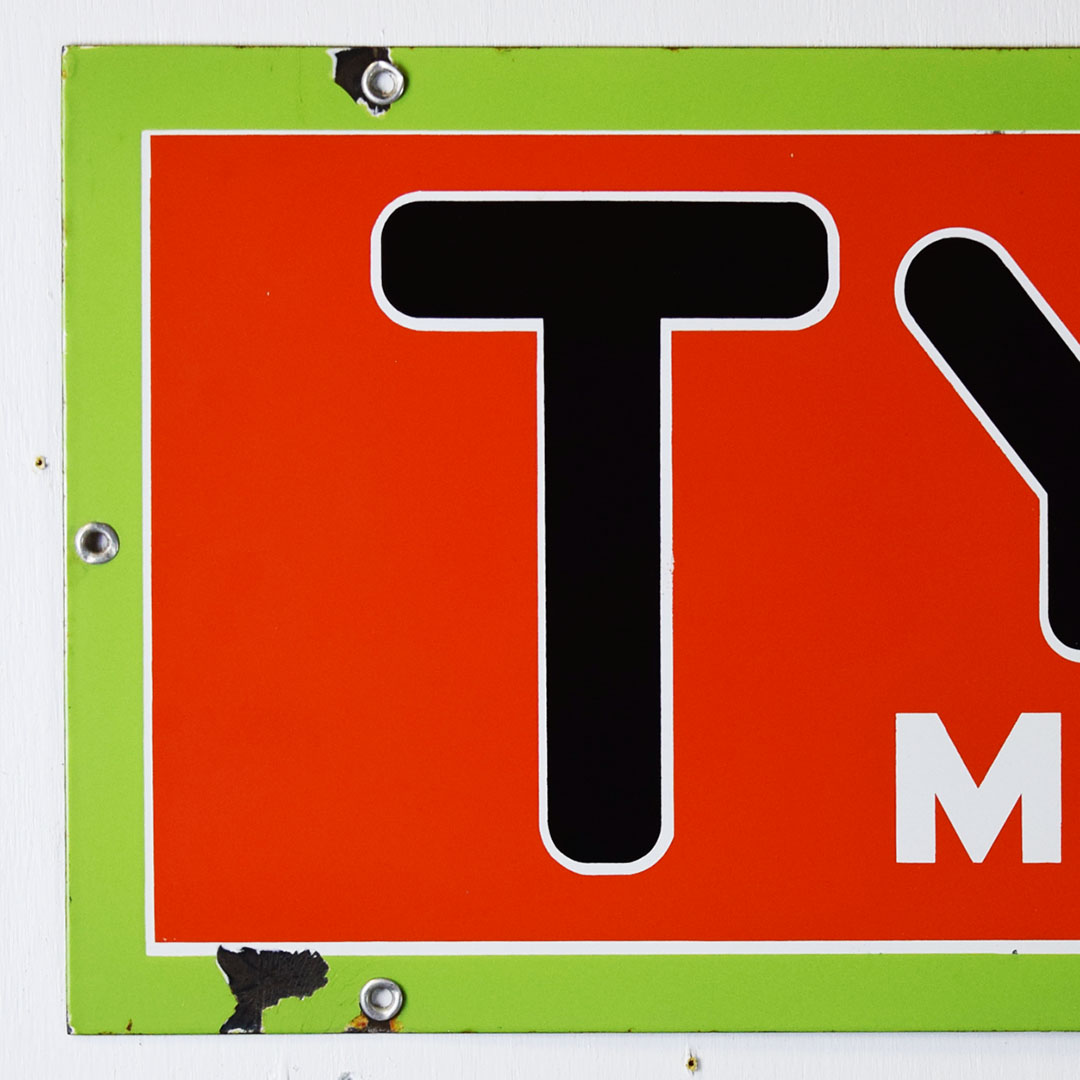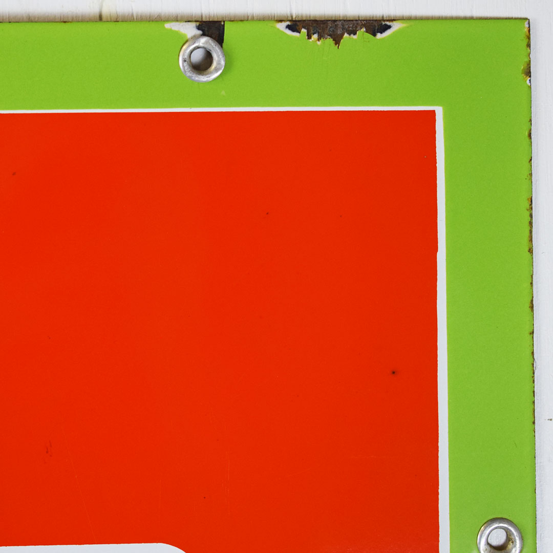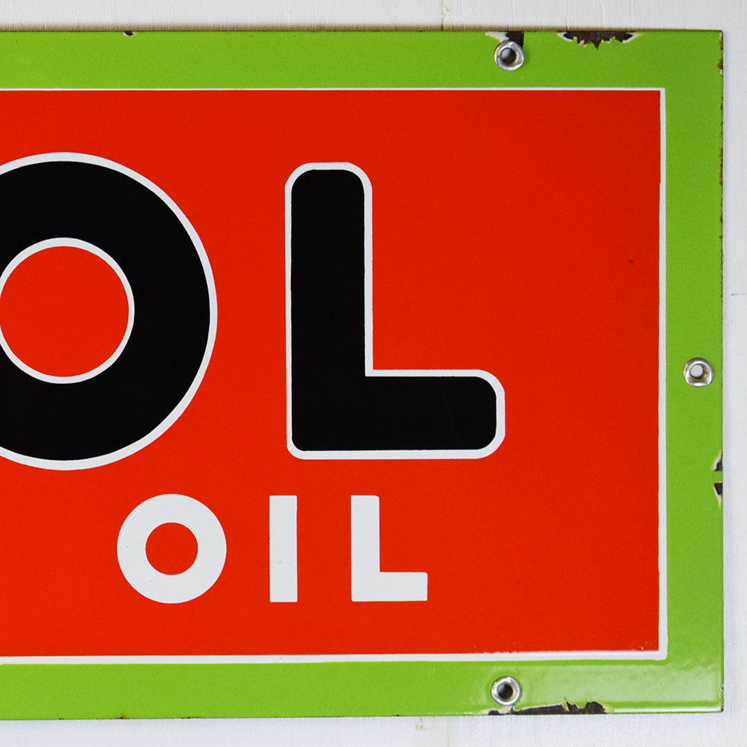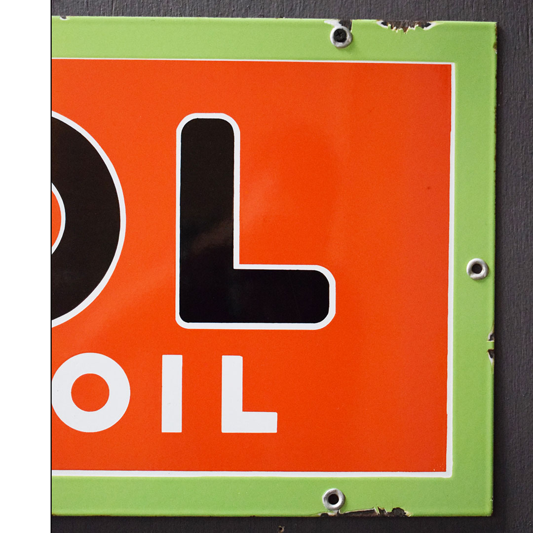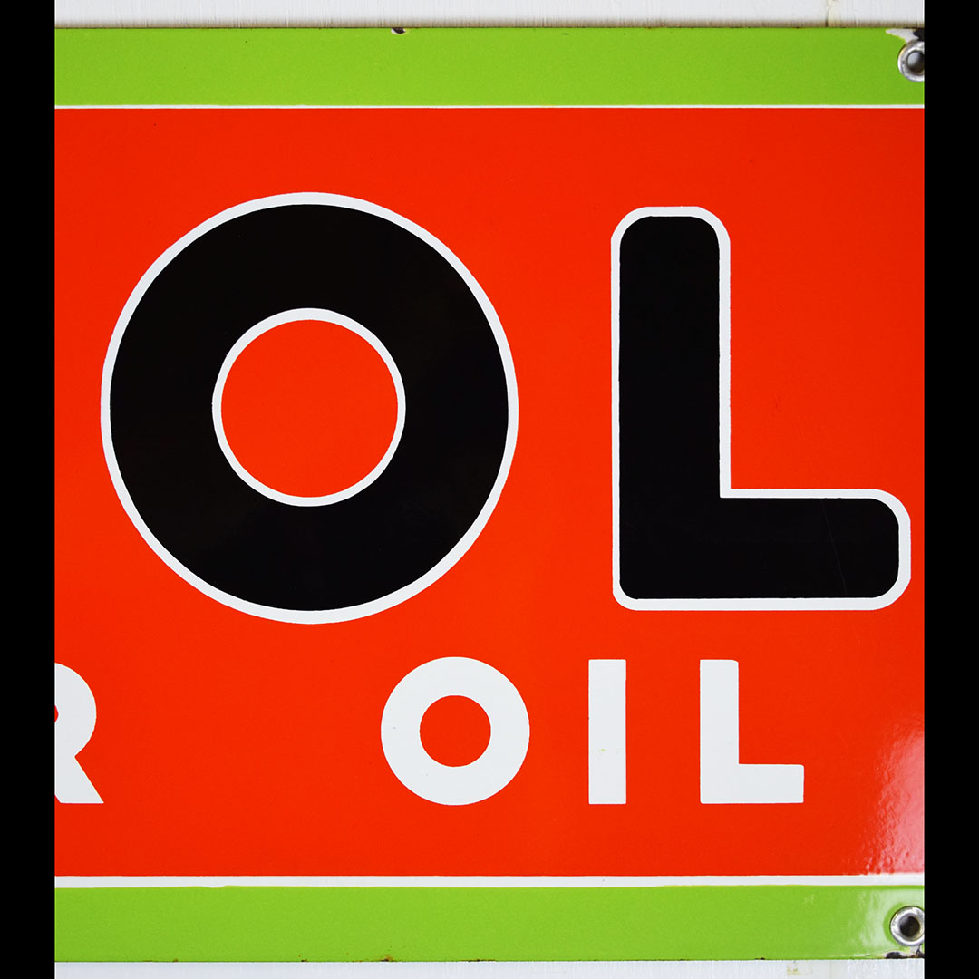 Whew! This Tydol Motor Oil sign is beautiful: knock your socks off! Measuring 42 inches long by 14 inches tall, the porcelain finish is as glossy as day one, and the colors pop off the finish. It is as original as possible, with all eight original aluminum grommets around the outer edge. The top and bottom edges have a few chips with porcelain loss and a small chip on the right outer edge. The field of the sign is sharp and free of chips—no touch-ups on this beauty either. What you see is what you get, no excuses! These signs don’t appear for sale often, so don’t miss your chance on this fantastic Tydol Motor Oil sign! 21130-WOPP