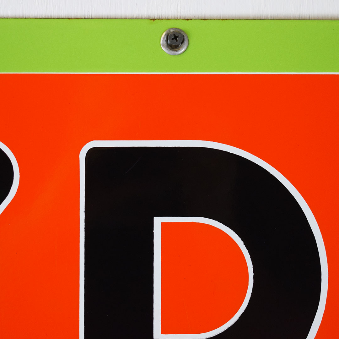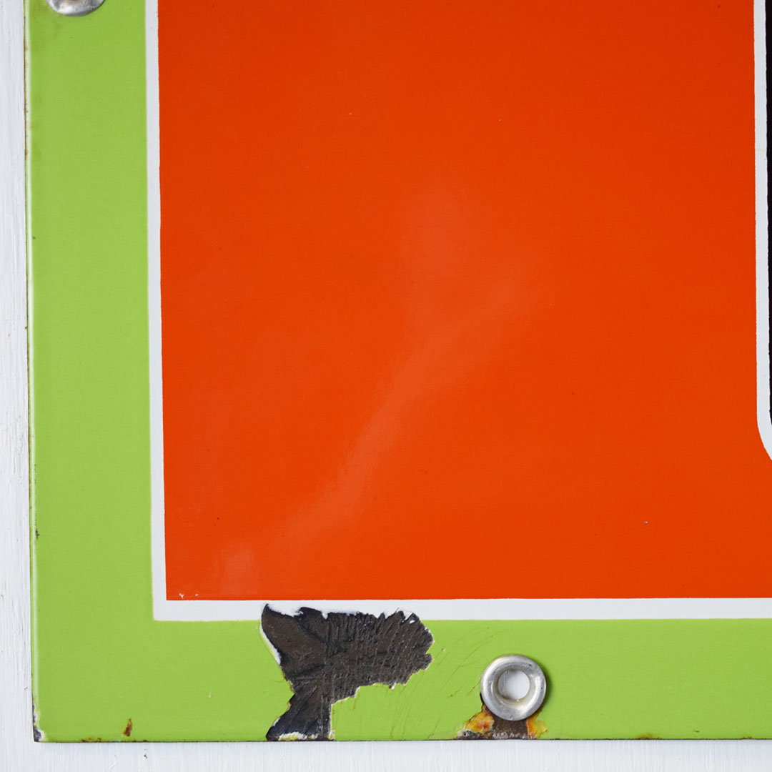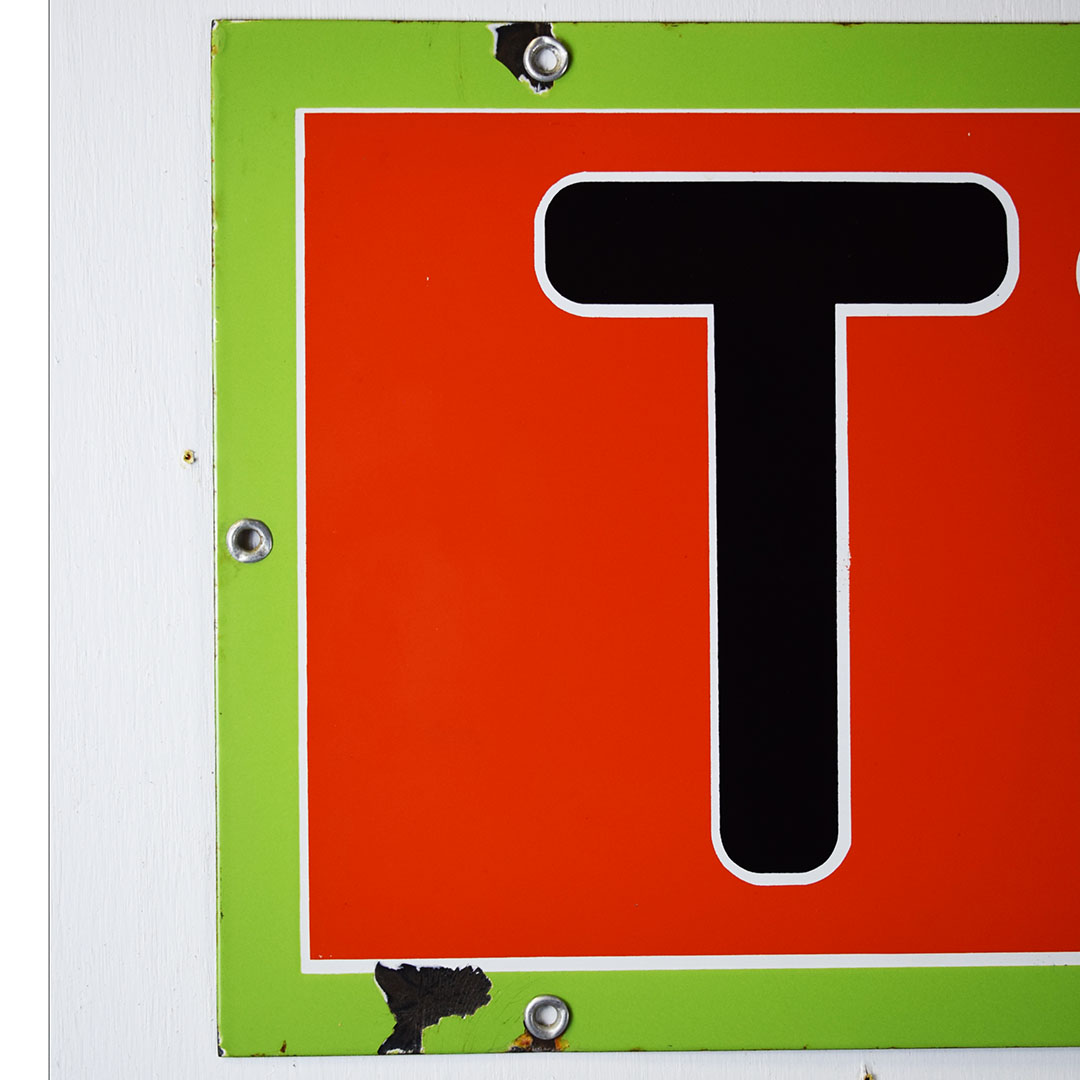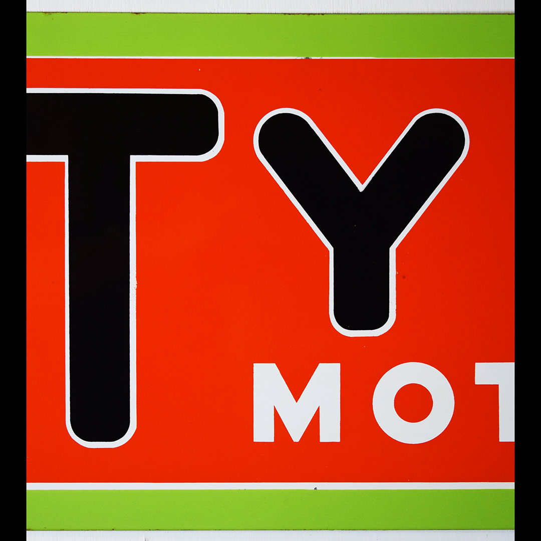 Whew! This Tydol Motor Oil sign is beautiful: knock your socks off! Measuring 42 inches long by 14 inches tall, the porcelain finish is as glossy as day one, and the colors pop off the finish. It is as original as possible, with all eight original aluminum grommets around the outer edge. The top and bottom edges have a few chips with porcelain loss and a small chip on the right outer edge. The field of the sign is sharp and free of chips—no touch-ups on this beauty either. What you see is what you get, no excuses! These signs don’t appear for sale often, so don’t miss your chance on this fantastic Tydol Motor Oil sign! 21130-WOPP
