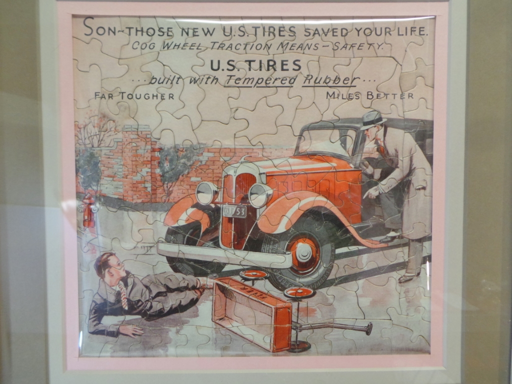 A free promotional advertising item from the late 1920s or early 1930s, this jigsaw puzzle is an image of an automobile driver admonishing a kid with a wagon whom he has nearly hit on a rainy street. Across the top the puzzle is inscribed “‘Son – Those new U. S. Tires saved your life.’ Cog wheel traction means – safety. U. S. Tires … built with Tempered Rubber … Far Tougher, Miles Better.” The puzzle has been professionally matted and framed. With the frame it measures 16 3/8 inches tall by 16 7/8 inches wide and is in excellent condition with some light water staining and almost no wear. 17281-81RWT