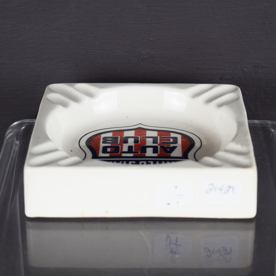 From the 1950s to 1960s, this vintage ceramic ashtray features USAC’s logo in the center, along with a race car on the front edge. USAC stands for United States Auto Club, which was formed in 1956. It measures 4.5 inches across and stands 1 inch tall. The ashtray has a felt bottom. Some finish loss is in the upper left corner of the ashtray. Very cool piece for the racing collector! 21429-UT