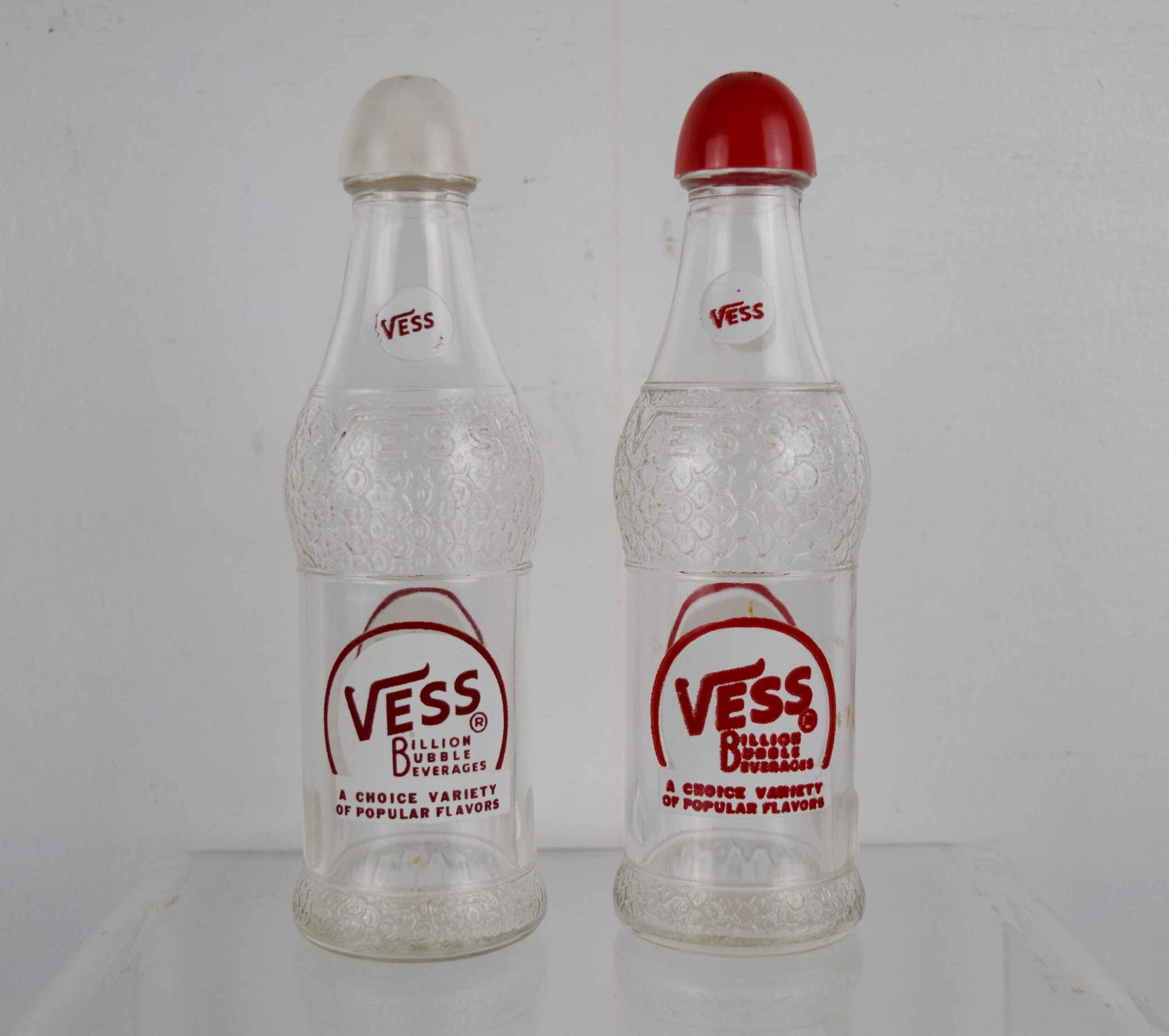 Right at home in any soda fountain, these Vess Billion Bubble Beverages salt and pepper shakers did two things, provided seasoning to every patron in the store, and provided advertising for Vess! Standing only six inches tall, these salt and pepper shakers were in multiple hands daily, so customers saw the Vess logo daily. Both bottles are clear, the only difference is the color of the cap, one is white and one is red. The bottle with the red cap received too much red ink during production, so it is slightly blurred on the labels. The bottle with the white cap has great graphics, but the top circle logo is not quite a circle. Both appear to be new old stock and unused. We have other salt and pepper shakers, just search our site! 19348-RT