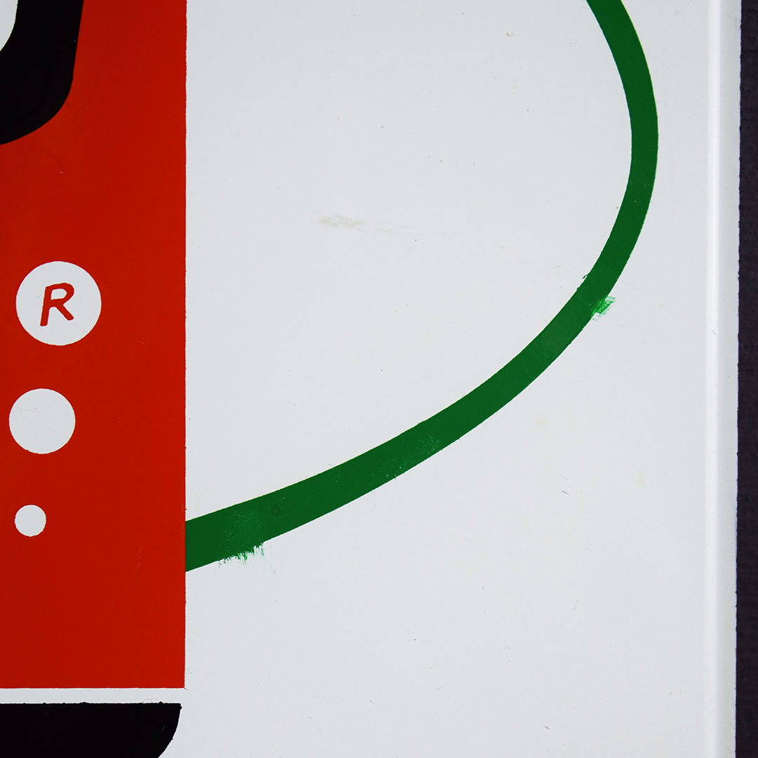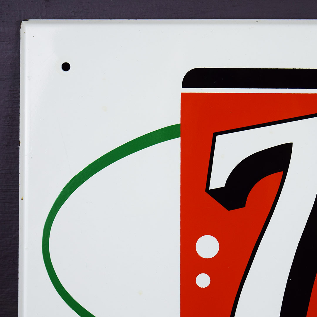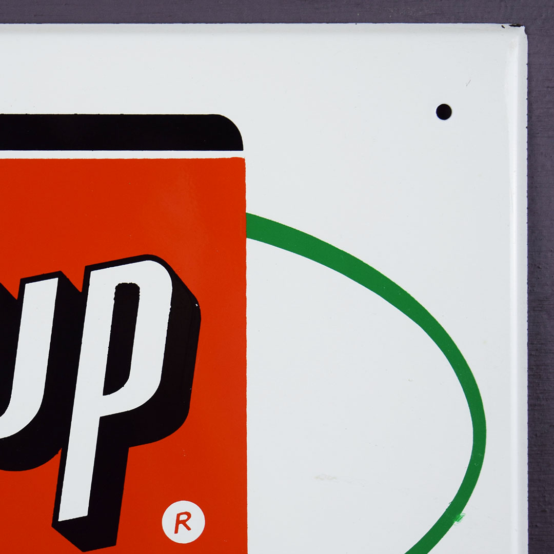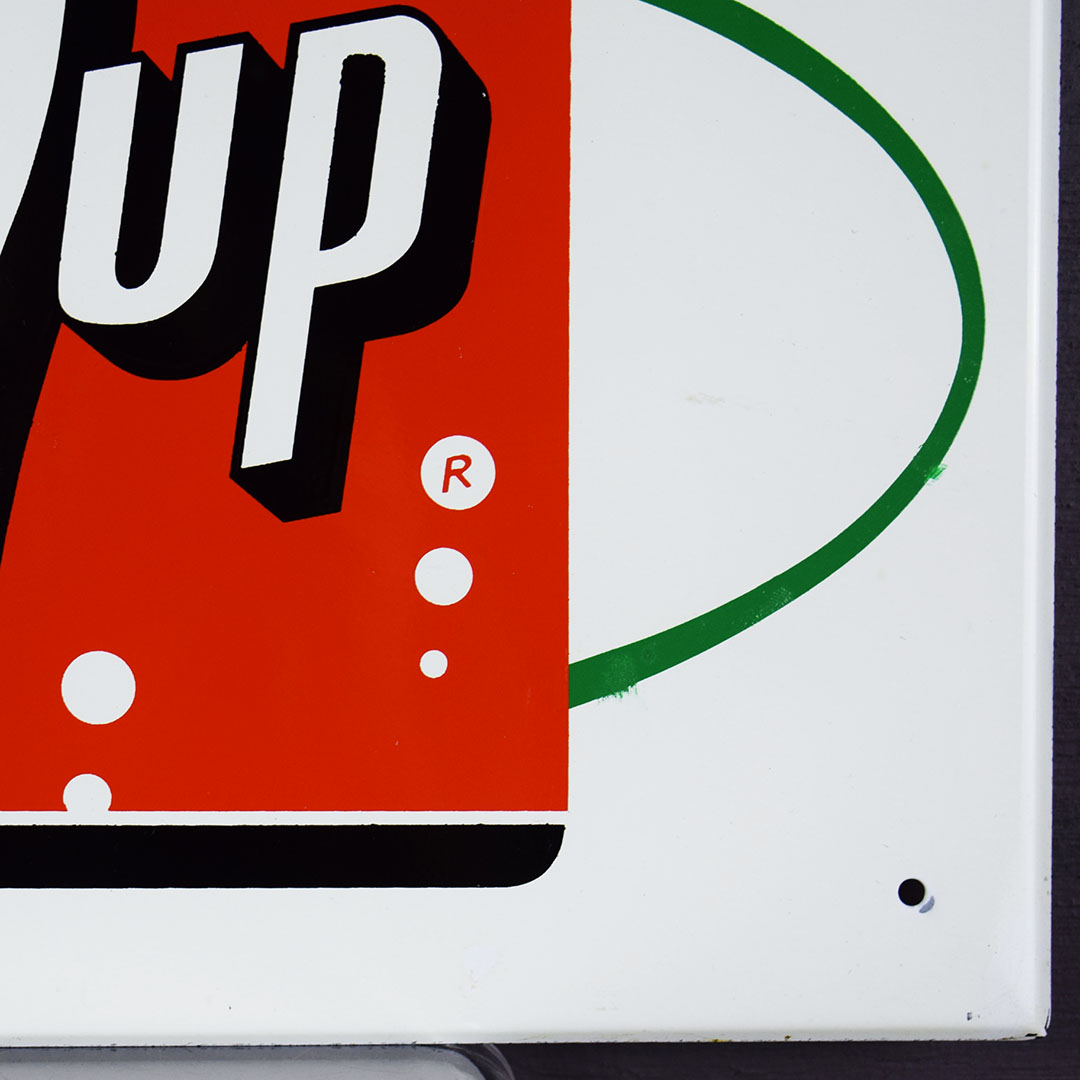 This great smaller sign will fit just about anywhere in your collection! It measures 13 inches wide by 9.5 inches tall and features the iconic 7UP logo. The outer edges are beveled, with a mounting hole in each corner. The colors are great, and it has an excellent gloss on the field. Some small chips are around the outer edge, with smeared fingerprints in the green oval trim on the right side. We date this excellent smaller sign from the 1960s. 21016-RWP
