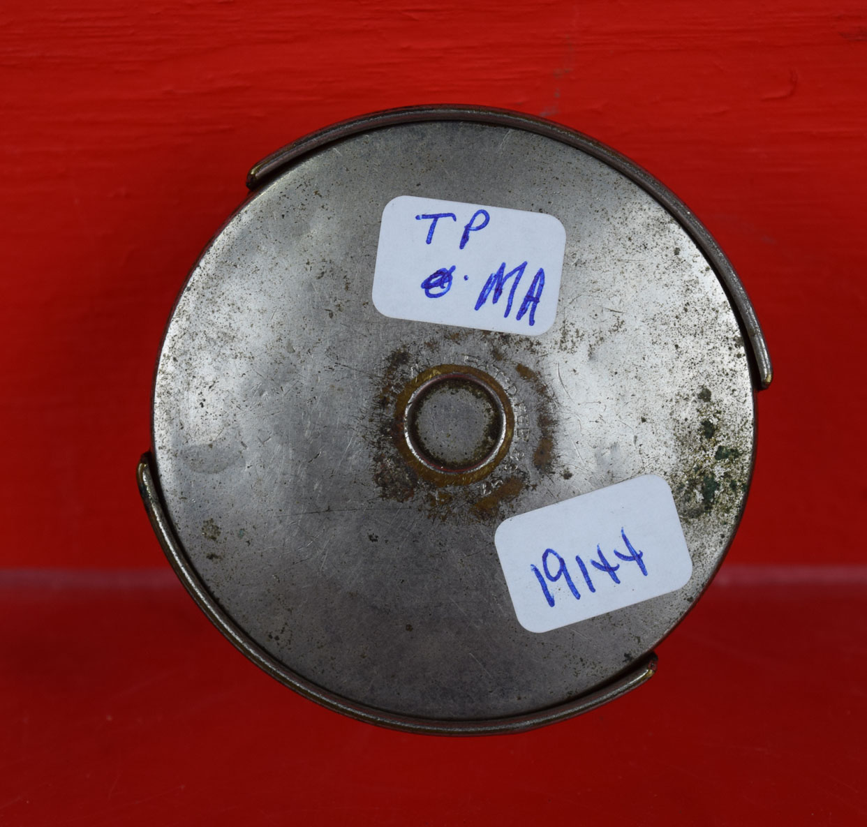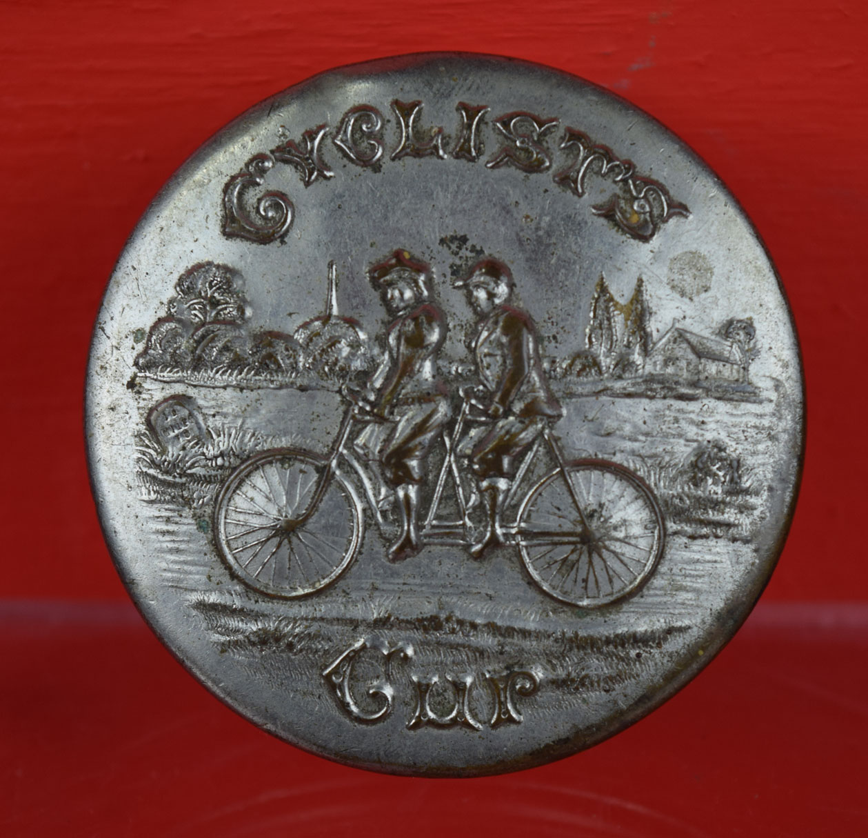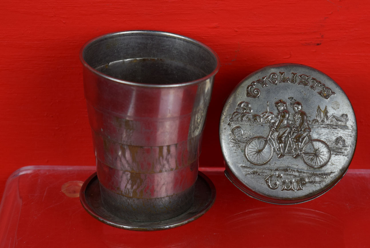 Dating back to the early 1900’s, having this collapsable drinking cup in your pocket would help you quench your thirst when you were biking around! It features a couple on a tandem bike in front of a body of water. The details are raised, along with the words “Cyclists Cup”. The sign in the lower left reads “10 Miles To” which means it may be time for a break and use this handy cup. It pulls from the bottom and opens up to give you an easy way to refresh yourself. It measures two and a half inches in diameter and has some wear from use. 19144-TP
