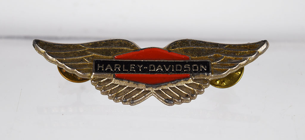 With silver wings and a two color logo, you can let everyone know what bike you ride! The orange and black Harley Davidson logo looks great over wings that are split at the bottom. The back features two pins with original backers. It measures two and a half inches long by three quarters of an inch tall. 20199-QI