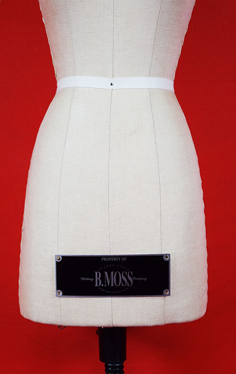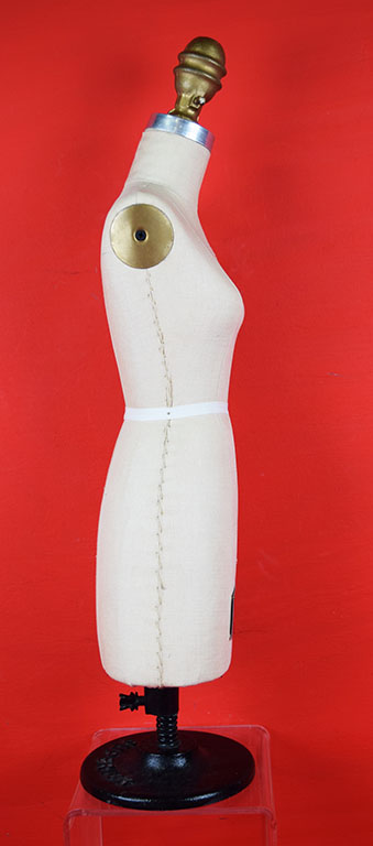This great looking salesman sample will look amazing in your country store display! Standing twenty-five inches tall, it has a heavy adjustable black cast iron base, with the dress form covered in fine linen fabric. The side arm plates are brass, and it appears each side is hand stitched with a pinned waist band. It has a plate on the front that reads “Property of B. Moss Clothing Company” and “Around Since Nineteen-Thirty-Nine”. The fabric is free of stains and looks amazing. 20255-WUT